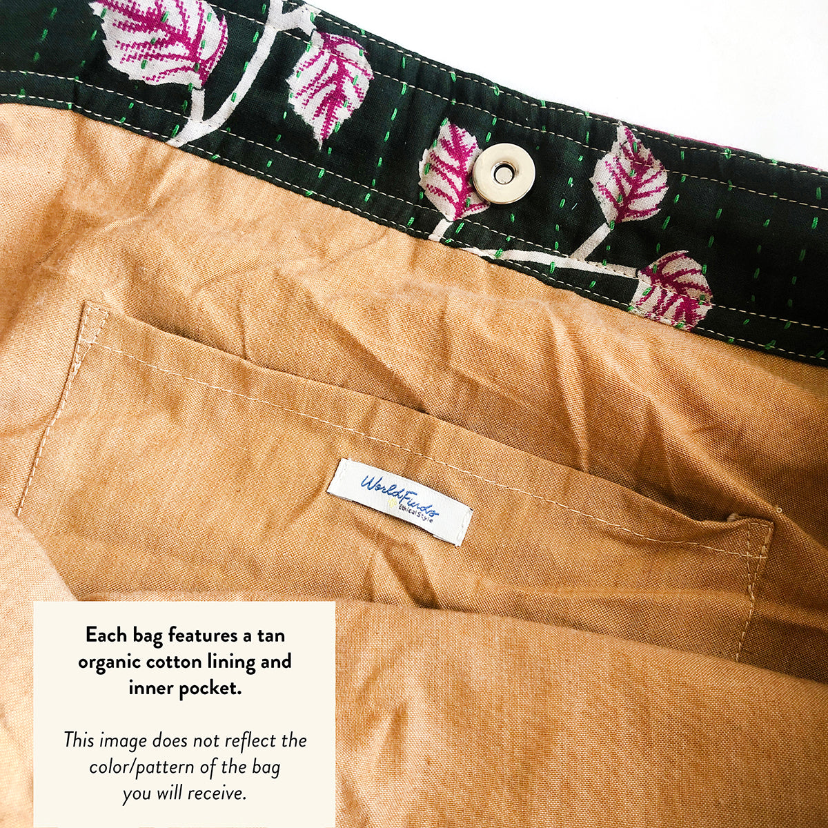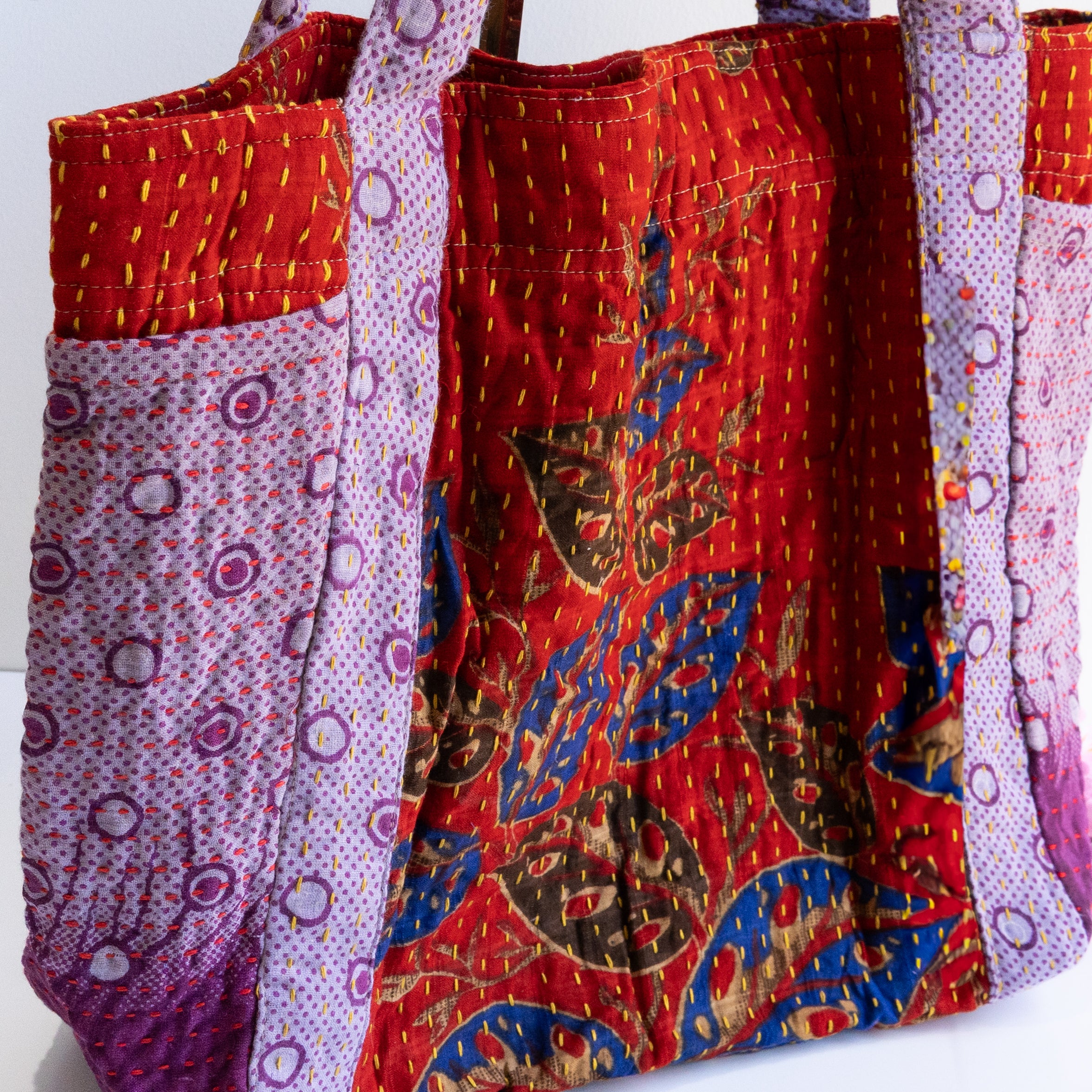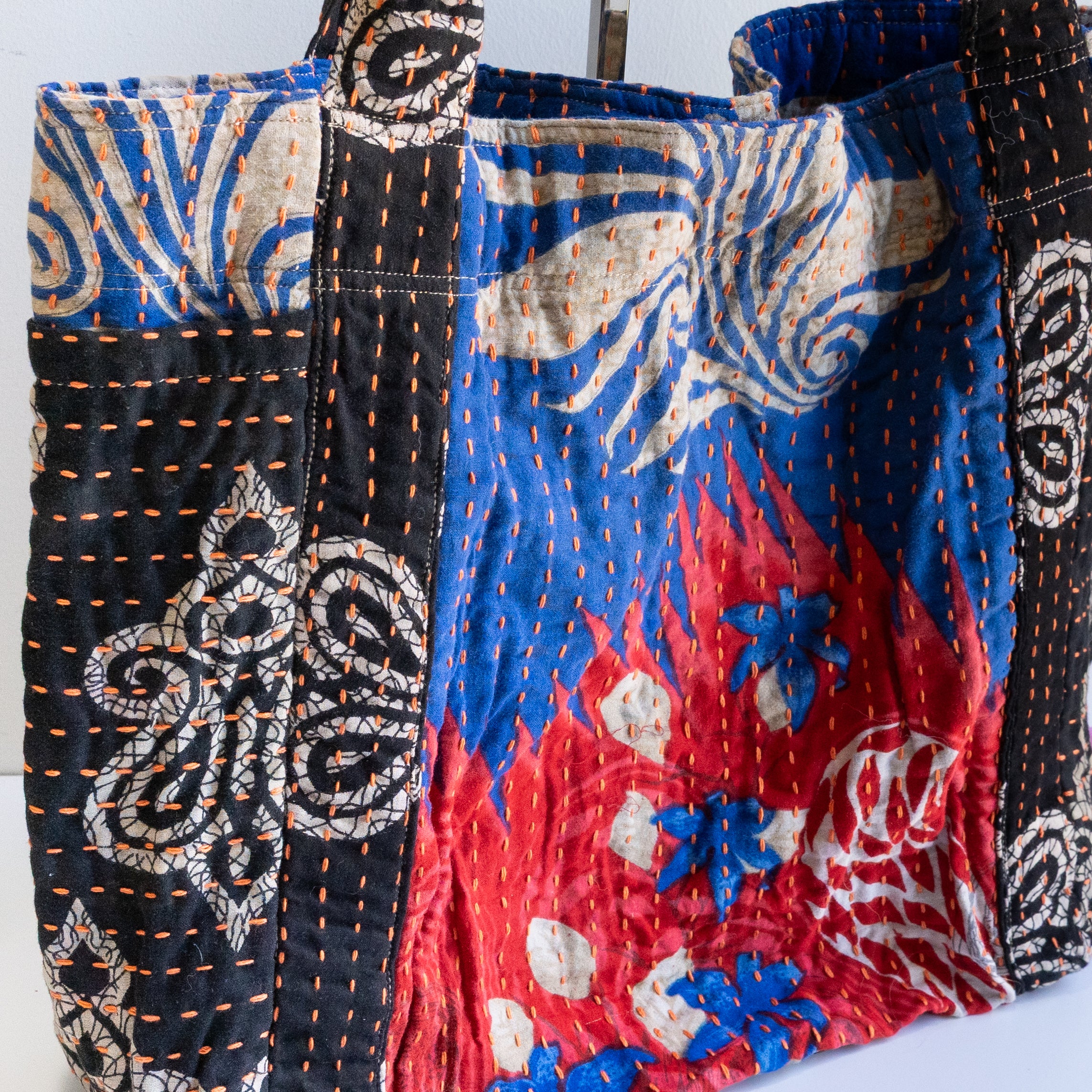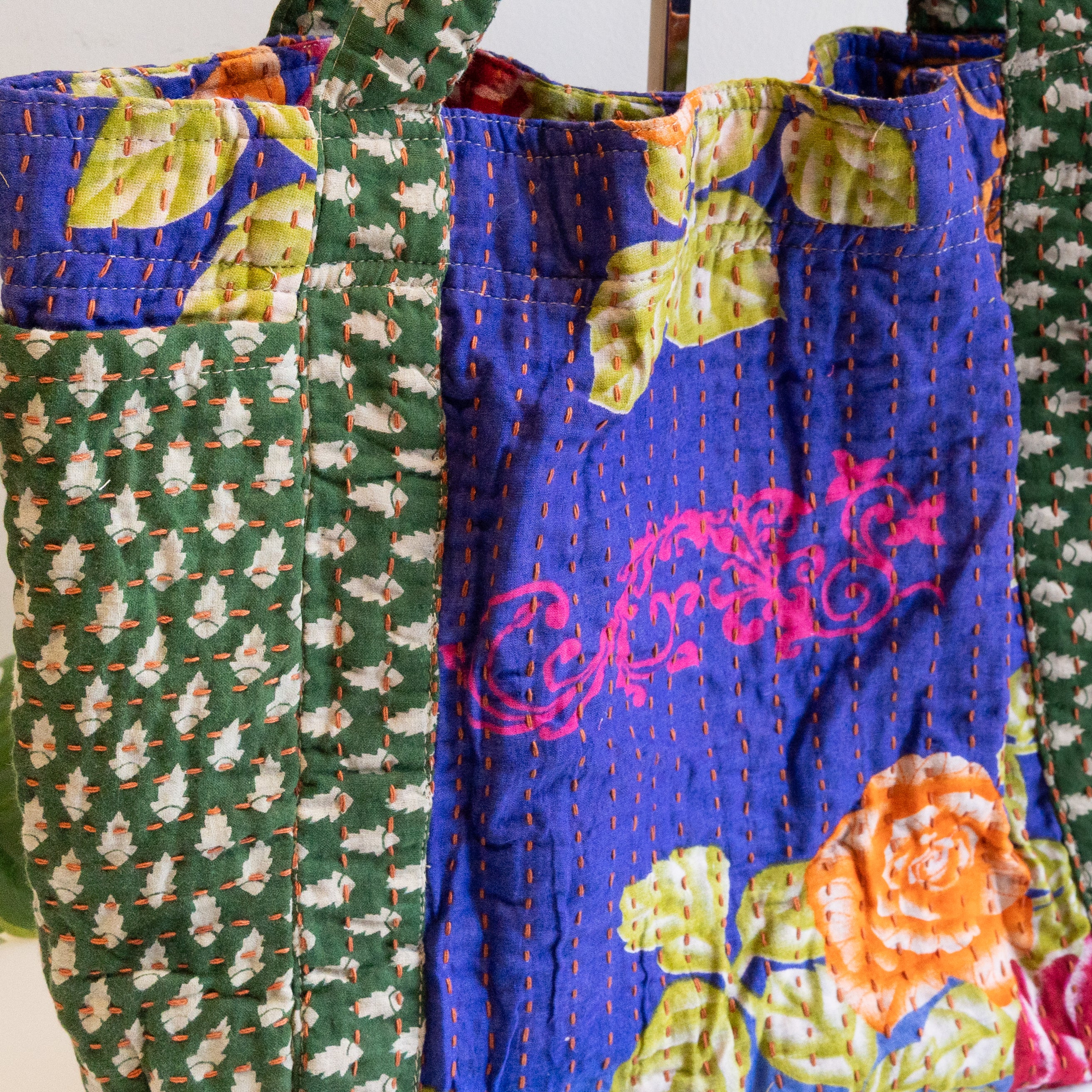 Crafted from upcycled Kantha quilts, each bag is completely one-of-a-kind and colors/patterns vary. Due to the upcycled nature, your item may have small patches in the fabric.