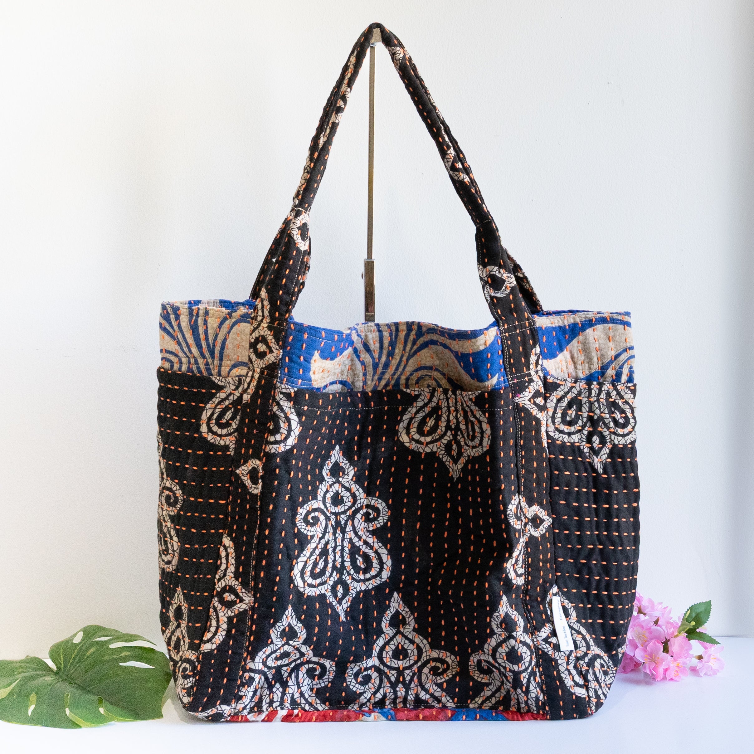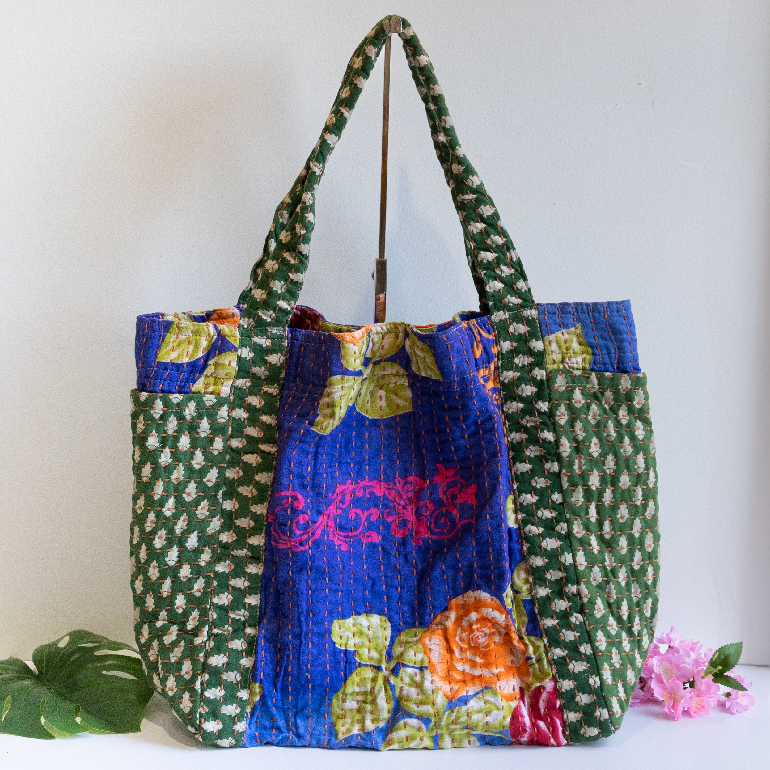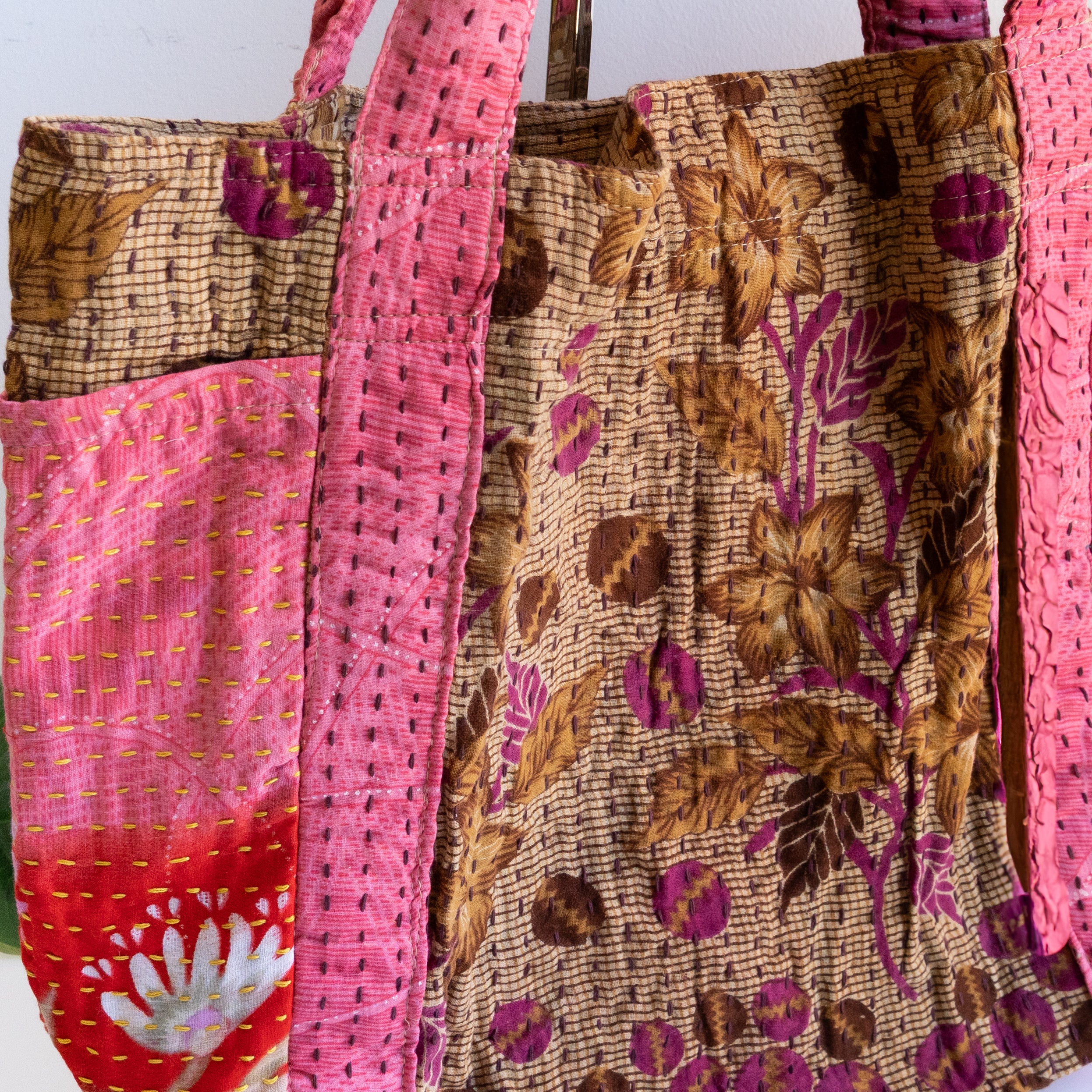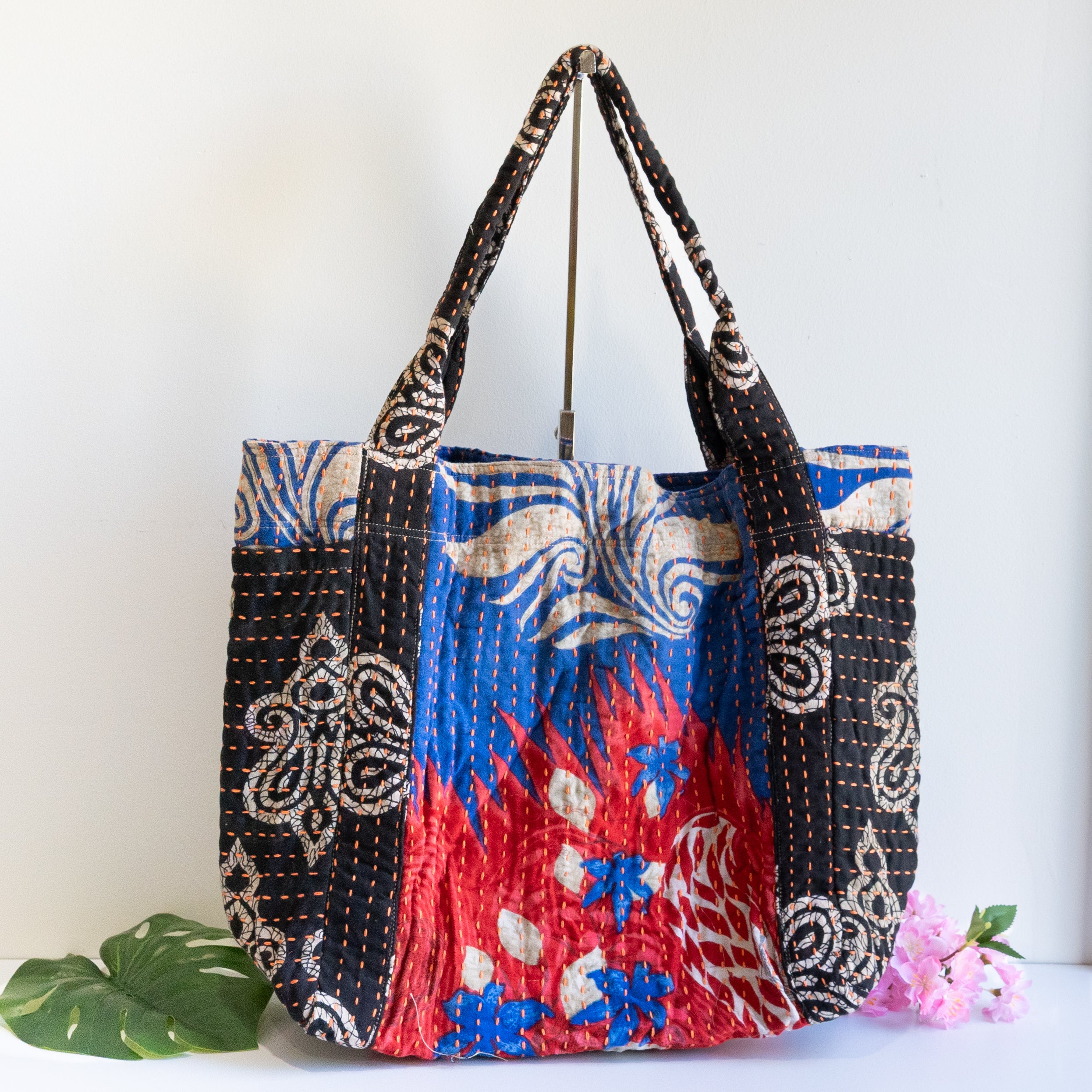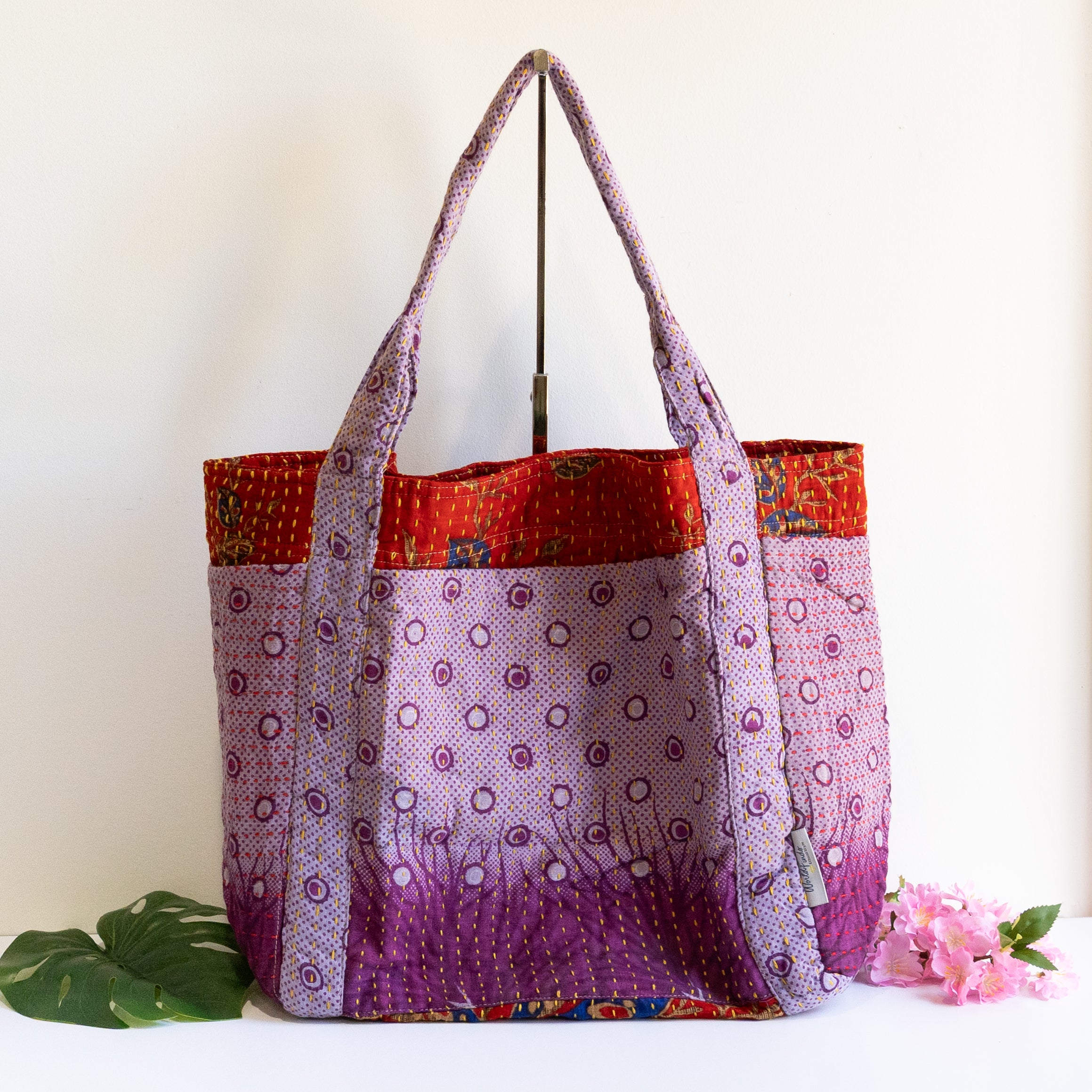 Crafted from upcycled Kantha quilts, each bag is completely one-of-a-kind and colors/patterns vary. Due to the upcycled nature, your item may have small patches in the fabric.