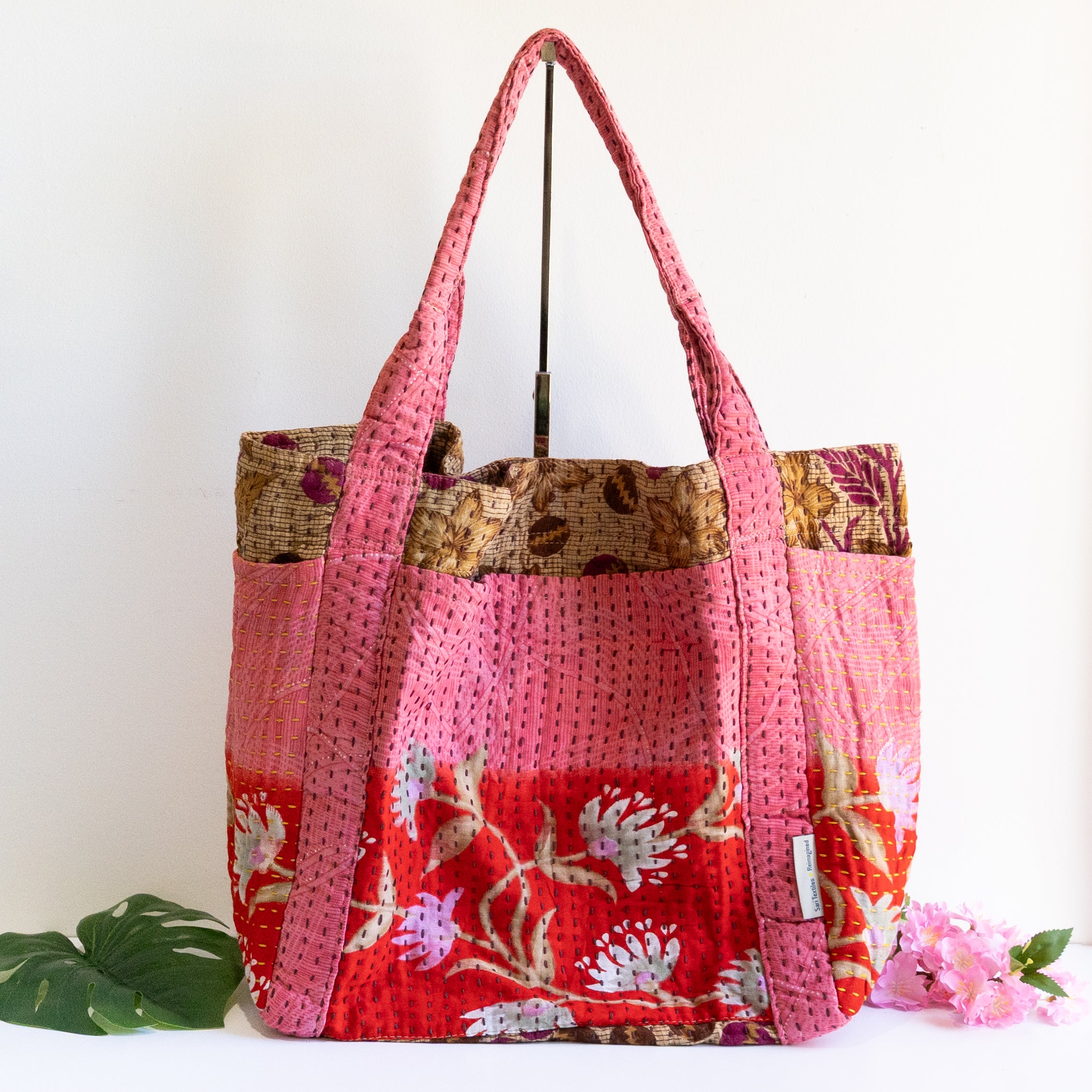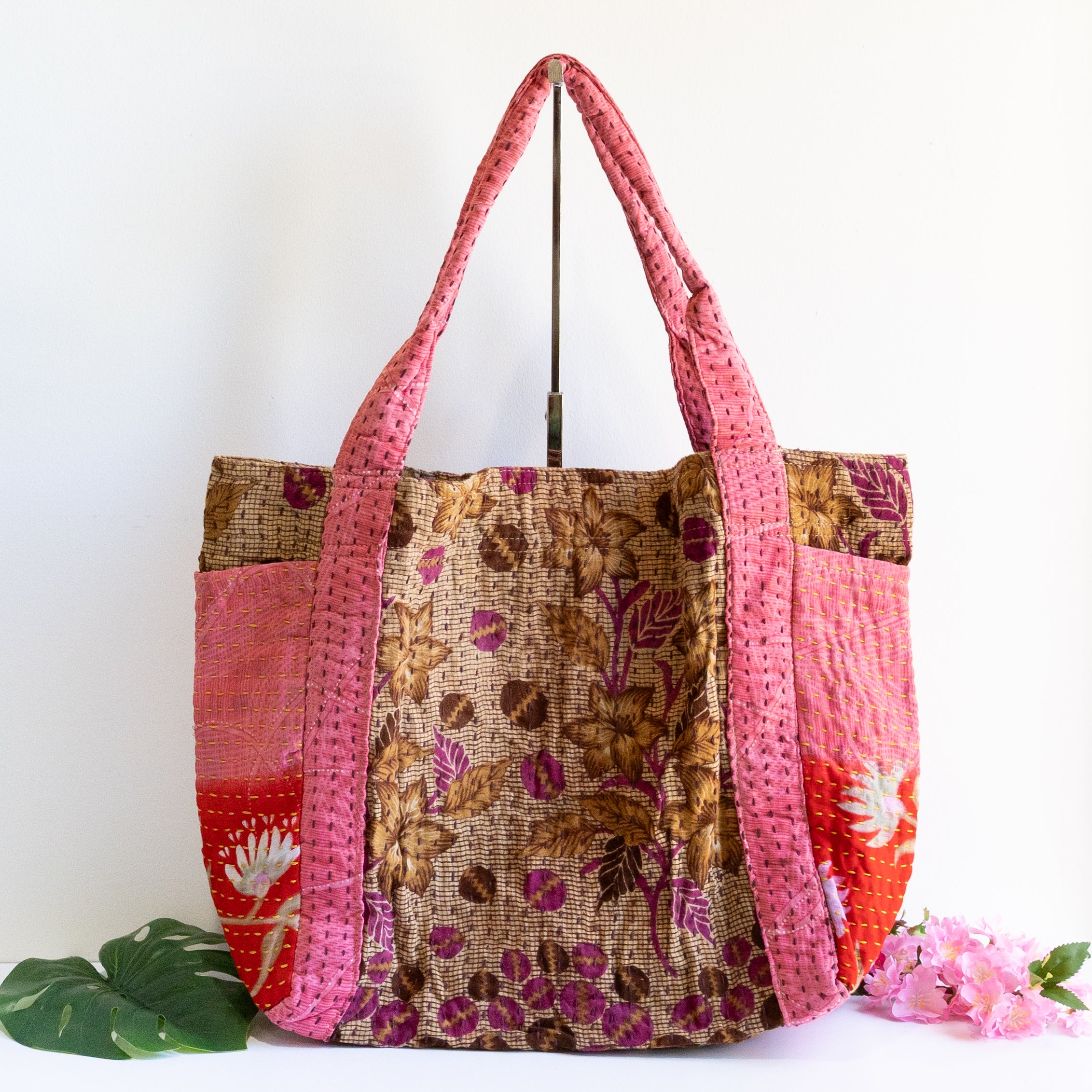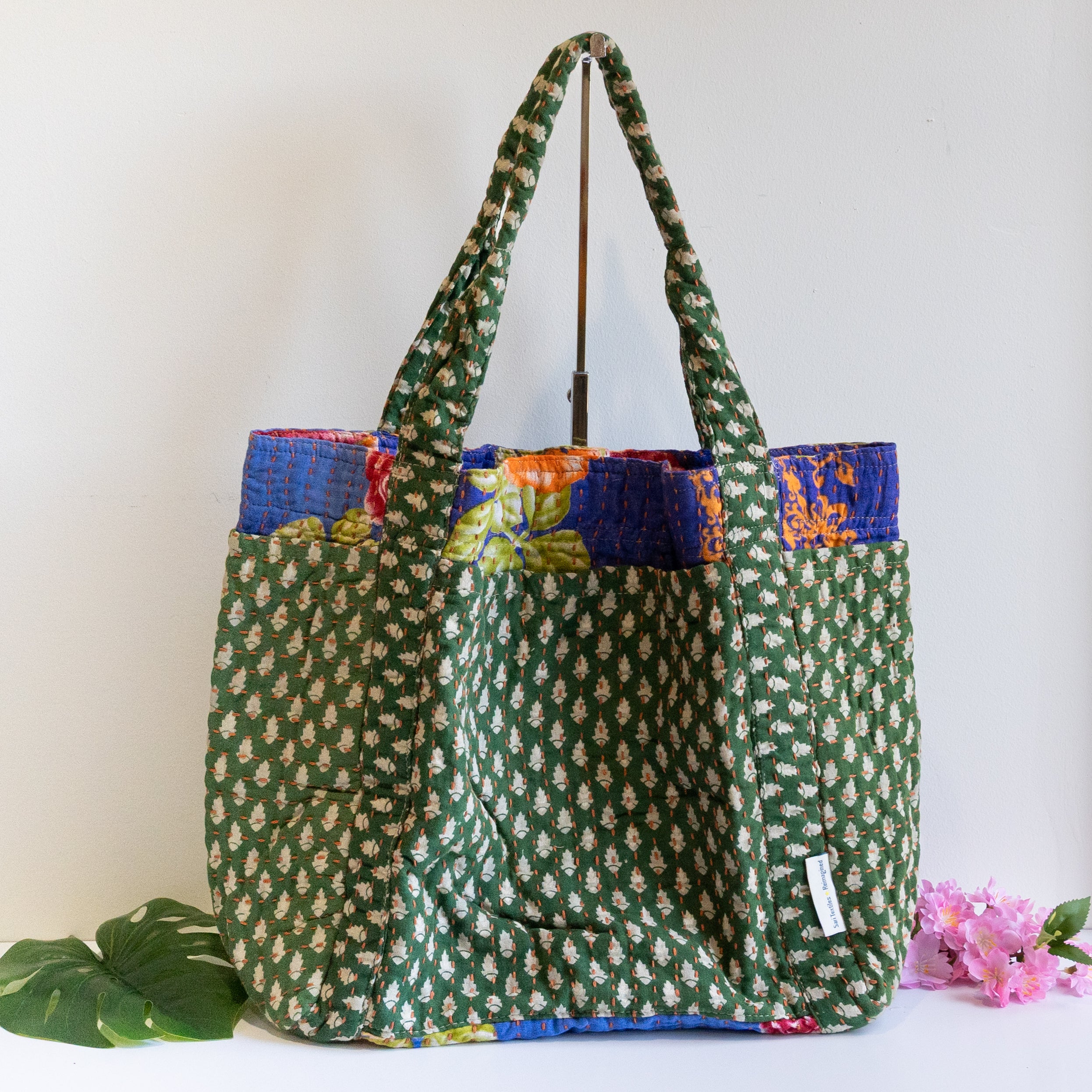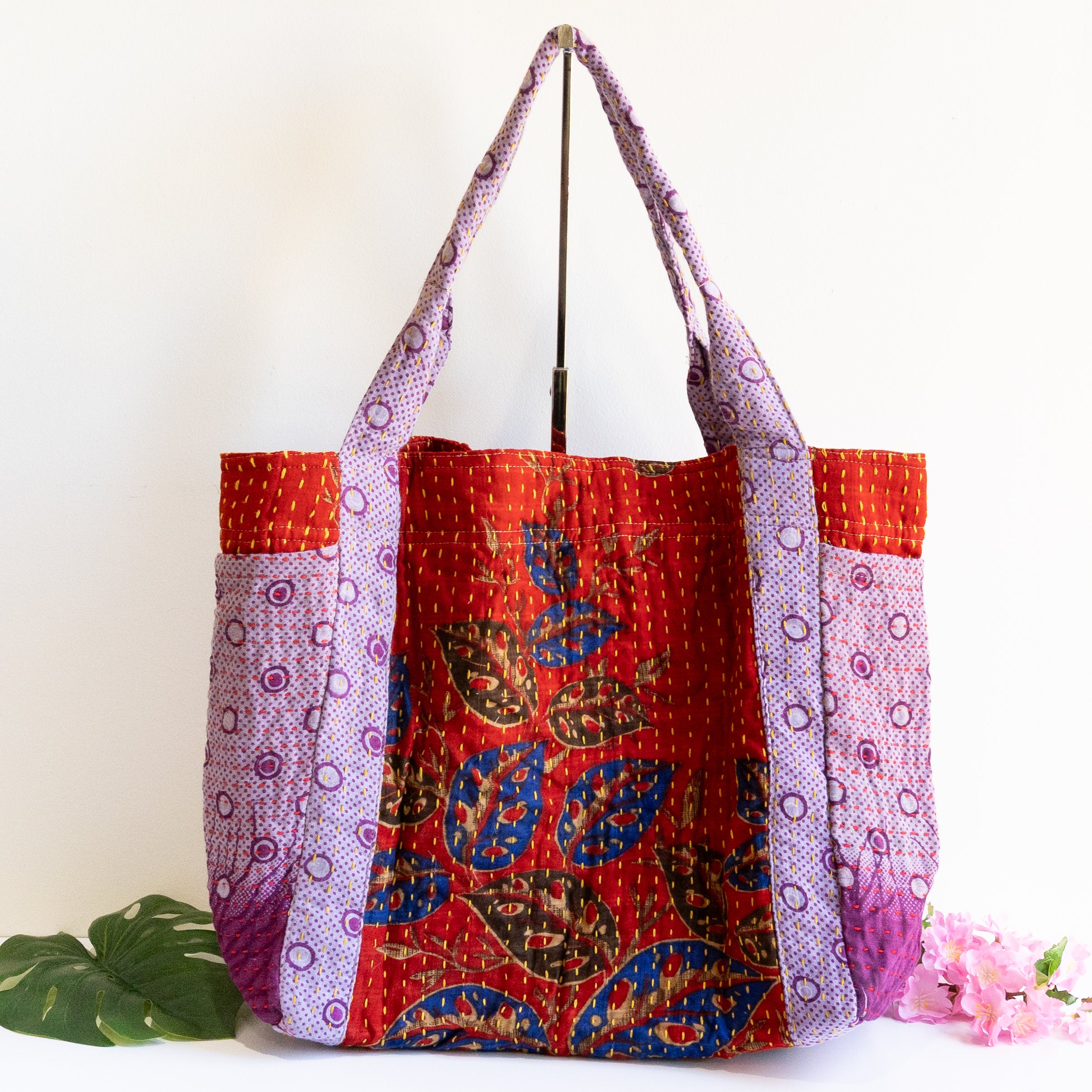 Crafted from upcycled Kantha quilts, each bag is completely one-of-a-kind and colors/patterns vary. Due to the upcycled nature, your item may have small patches in the fabric.