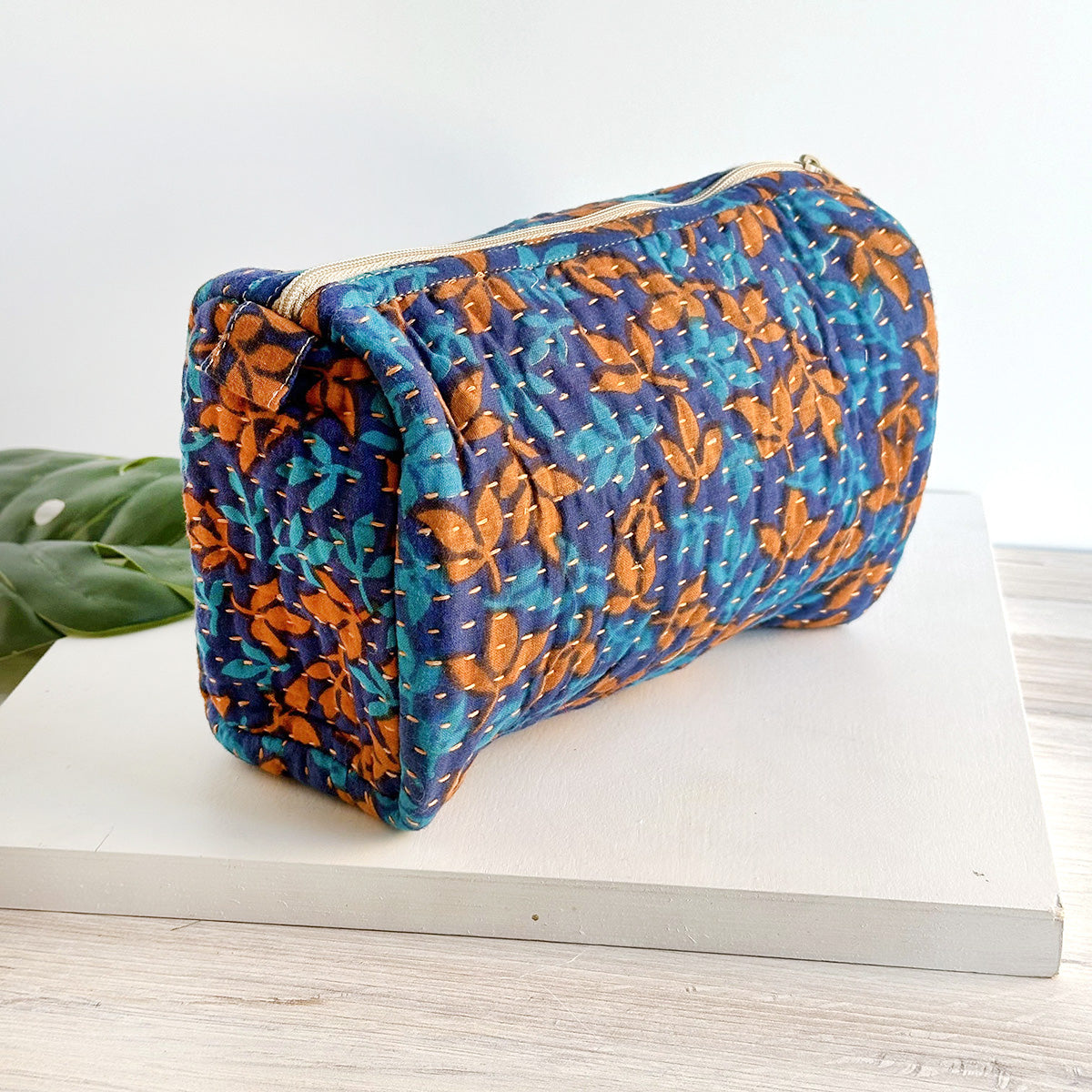 Each bag is handmade from upcycled Kantha quilts and is finished with a decorative tassel on the zipper. The nylon lining easily wipes clean. The interior features multiple pockets for organization.