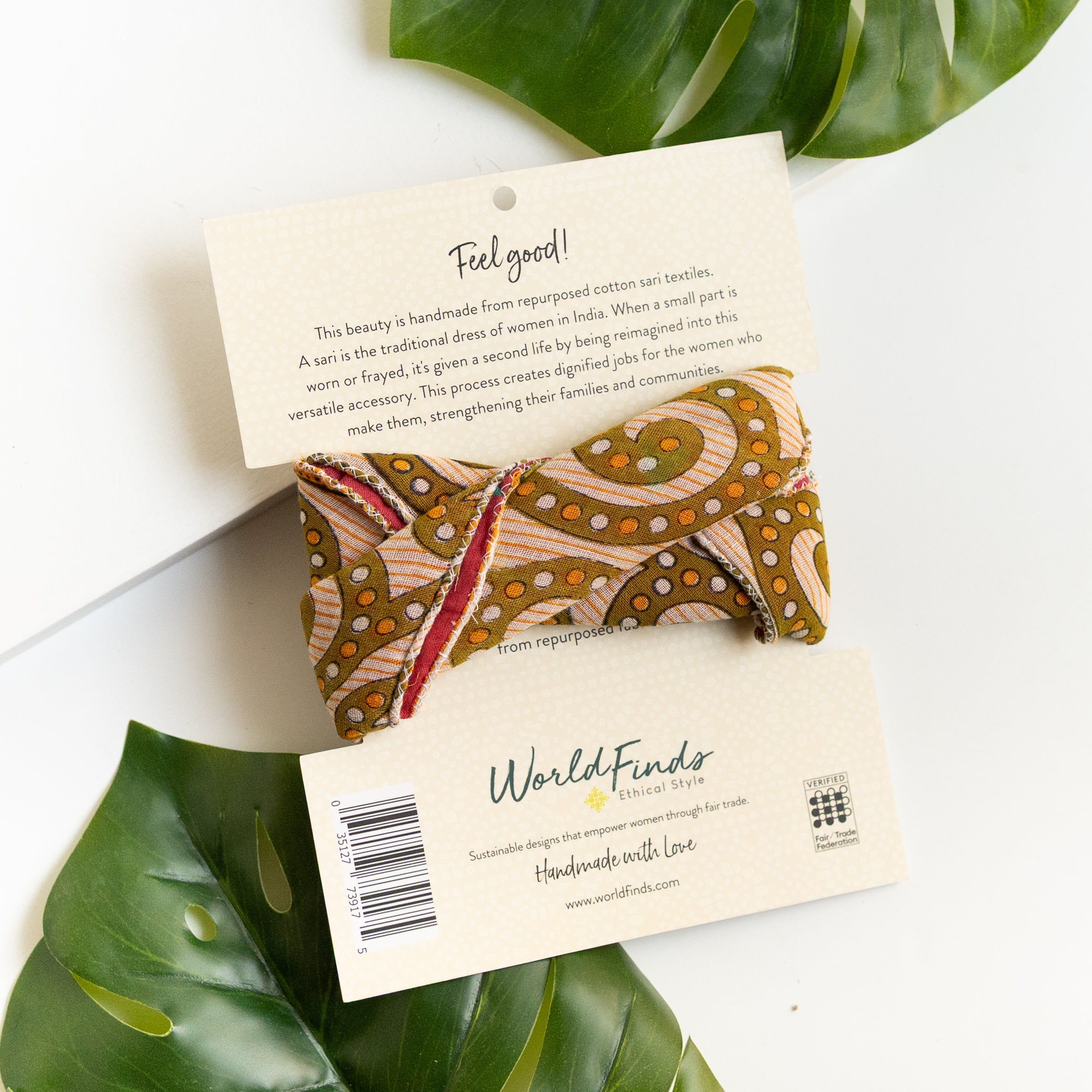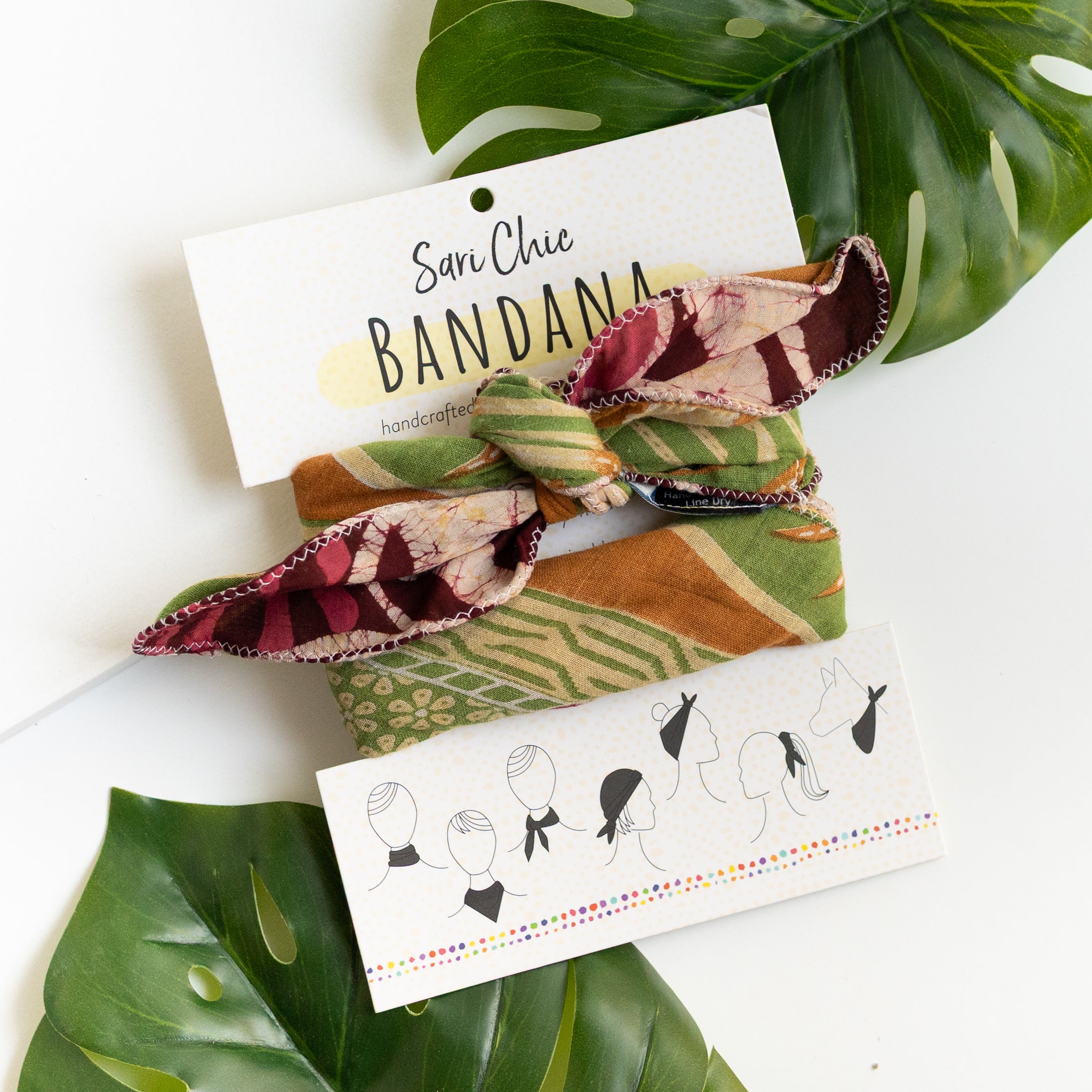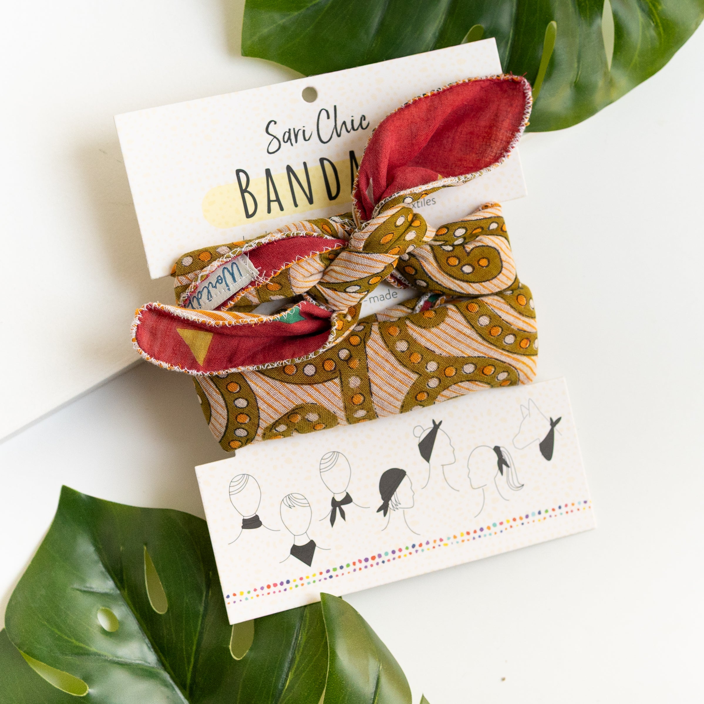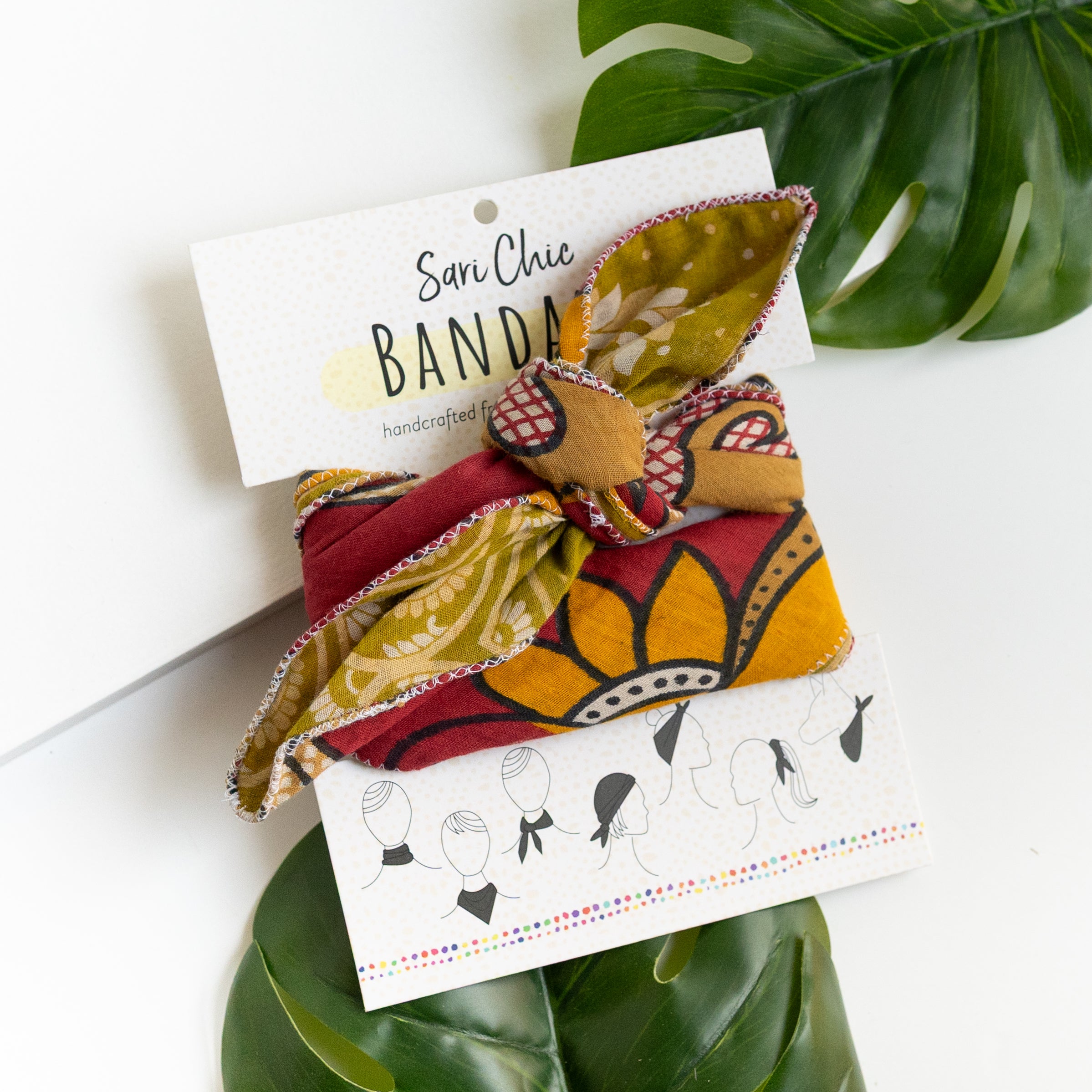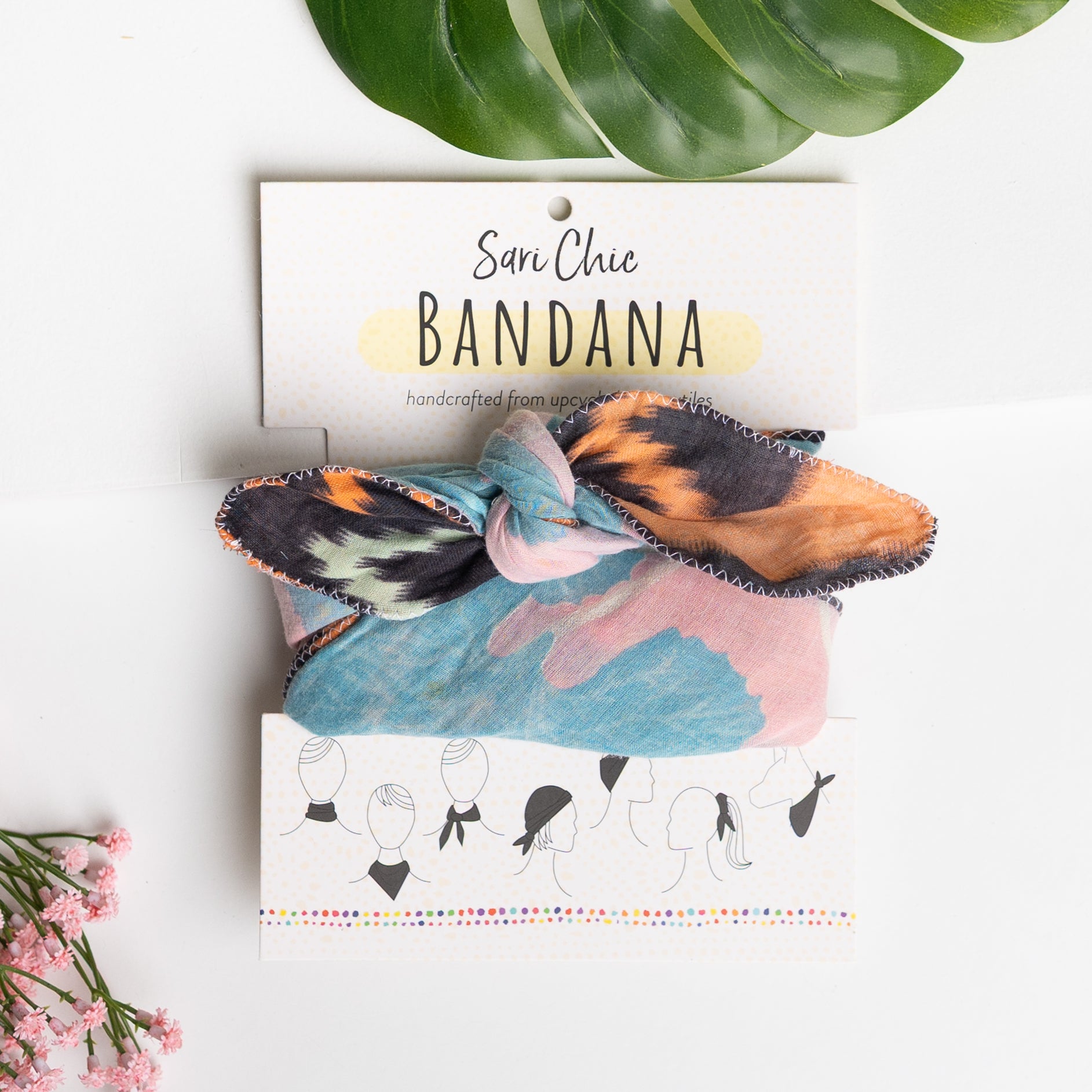 A unique, eco-friendly spin on a timeless design, this Sari Chic Bandana is crafted from repurposed sari fabric and can add just the right amount of pizazz to any ensemble. Style it as a head scarf, around your neck, or even on your four-legged pal!