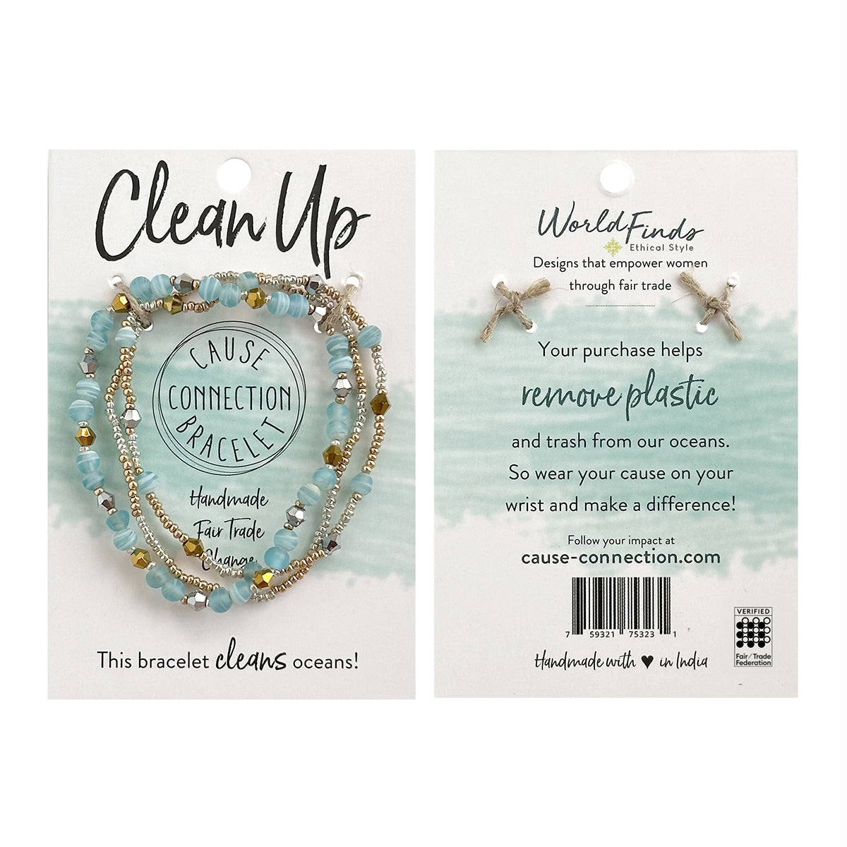 The Clean Up bracelet creates goodness on so many levels! Each set of bracelets is handmade by women artisans in India and also helps make our oceans plastic-free. See below for more information on this donation! Beads are made of glass and a brass metal mix. Donations are made based on purchase quantity, not product sales. We've donated over $105,277 so far to non-profit organizations thanks to your support of the Cause Bracelet Collection!