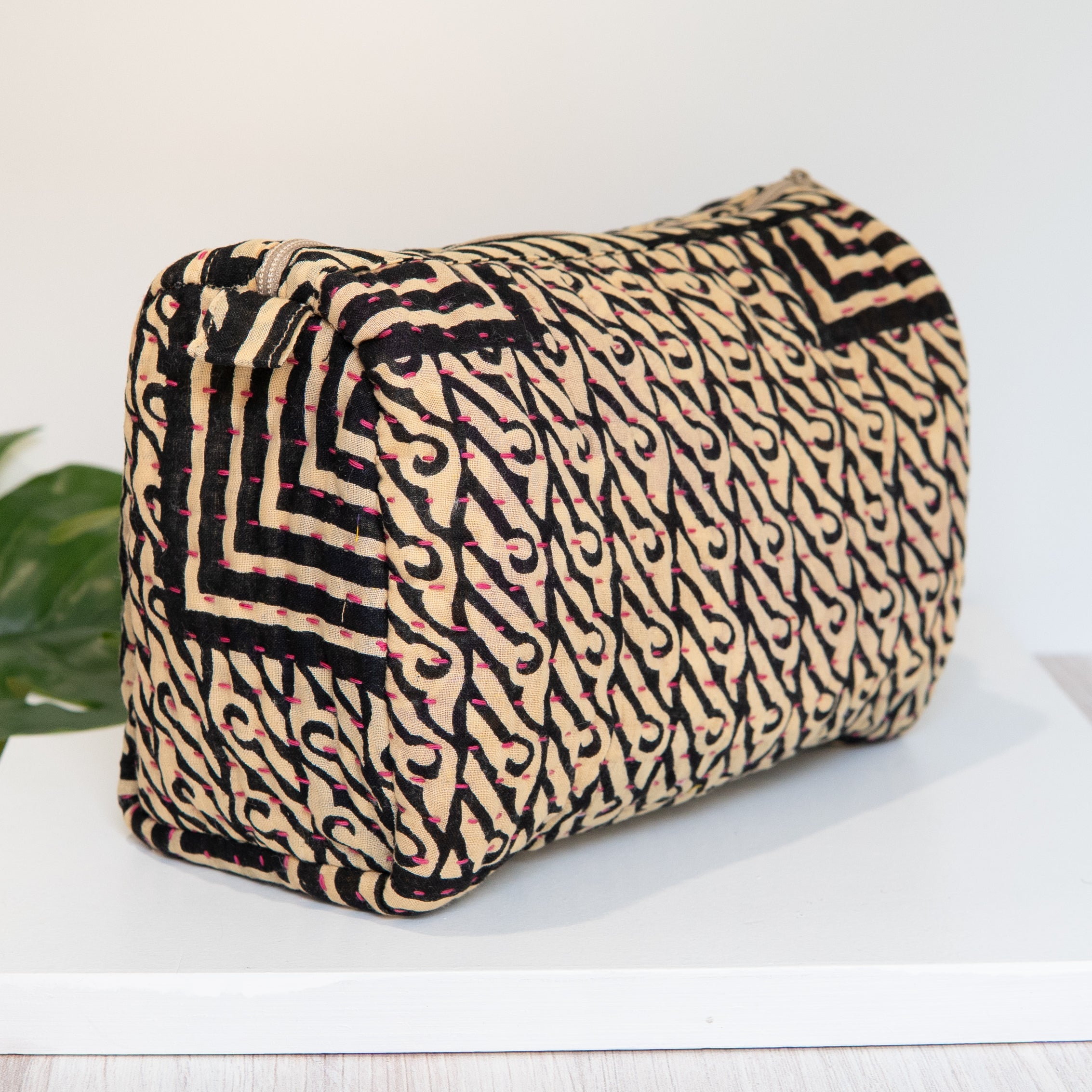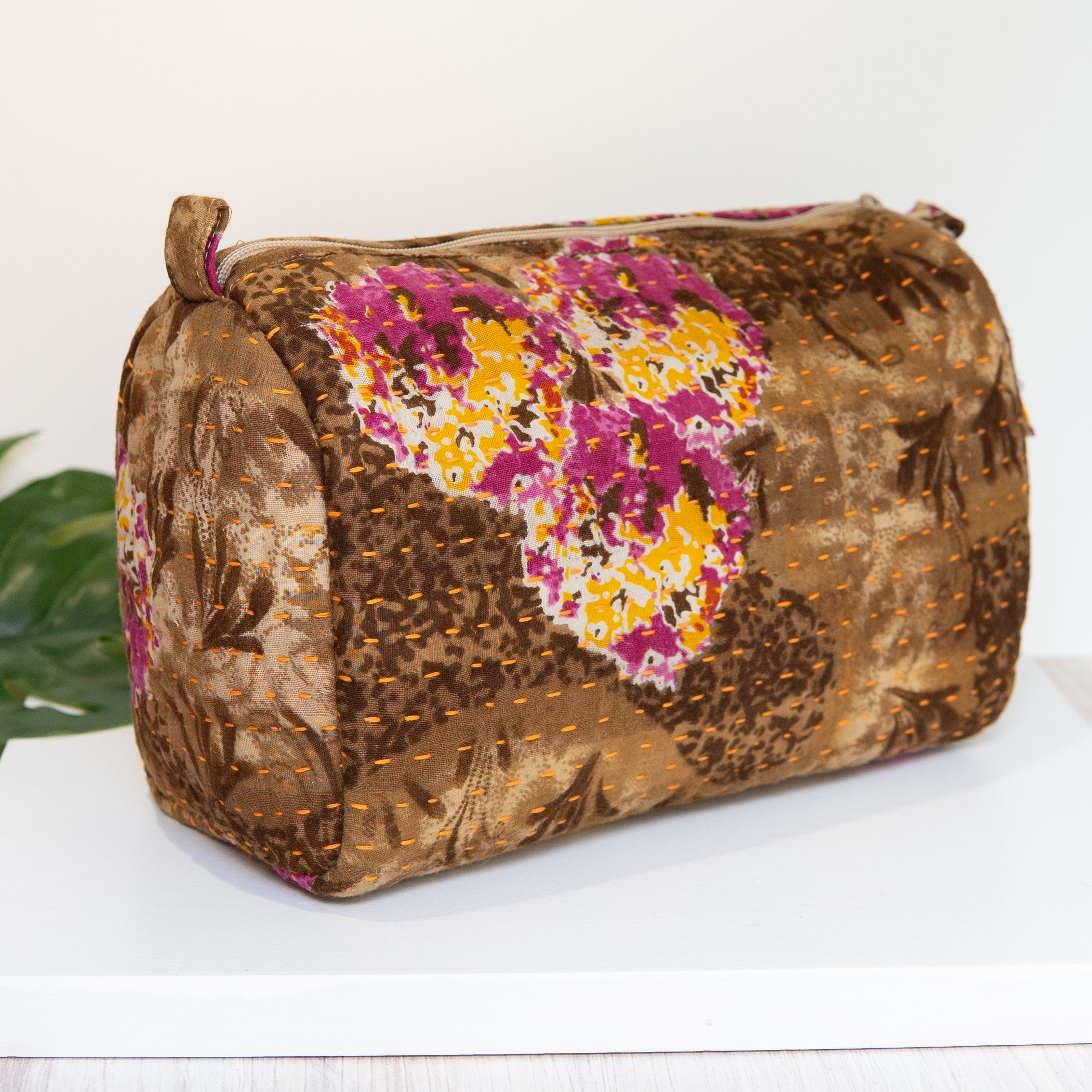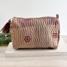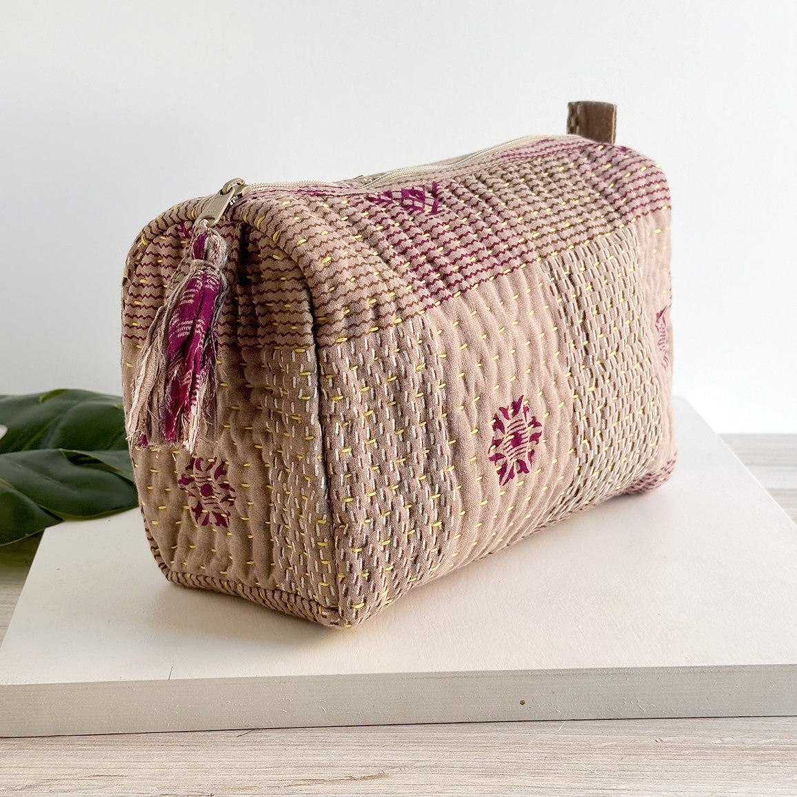 Each bag is handmade from upcycled Kantha quilts and is finished with a decorative tassel on the zipper. The nylon lining easily wipes clean. The interior features multiple pockets for organization.