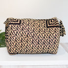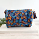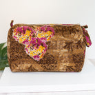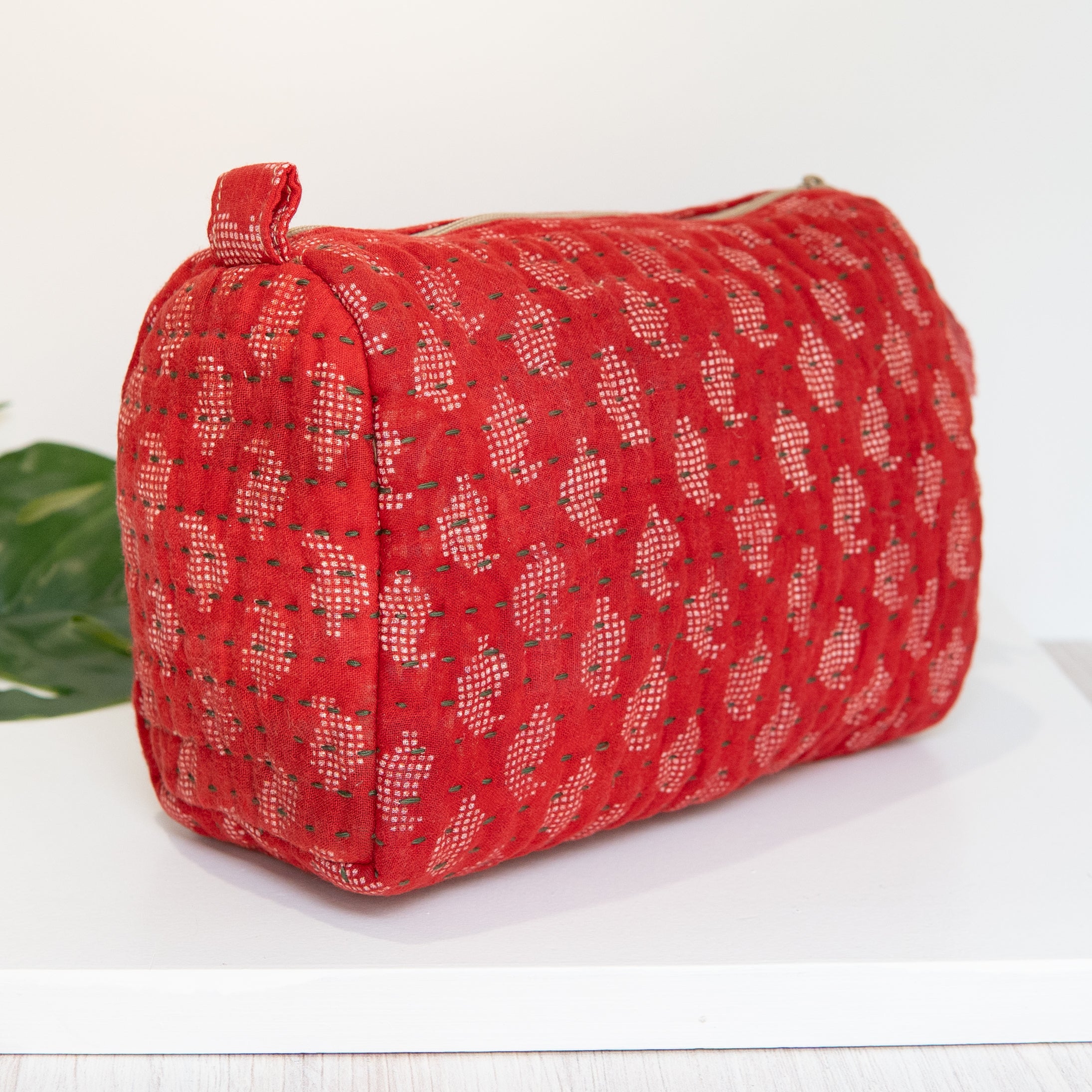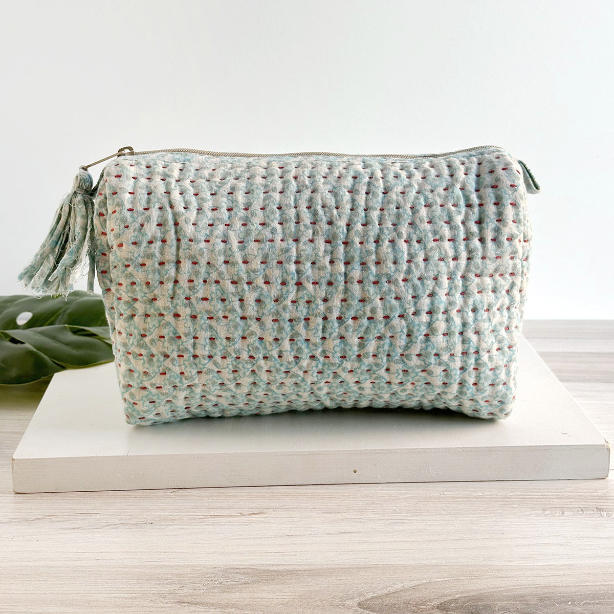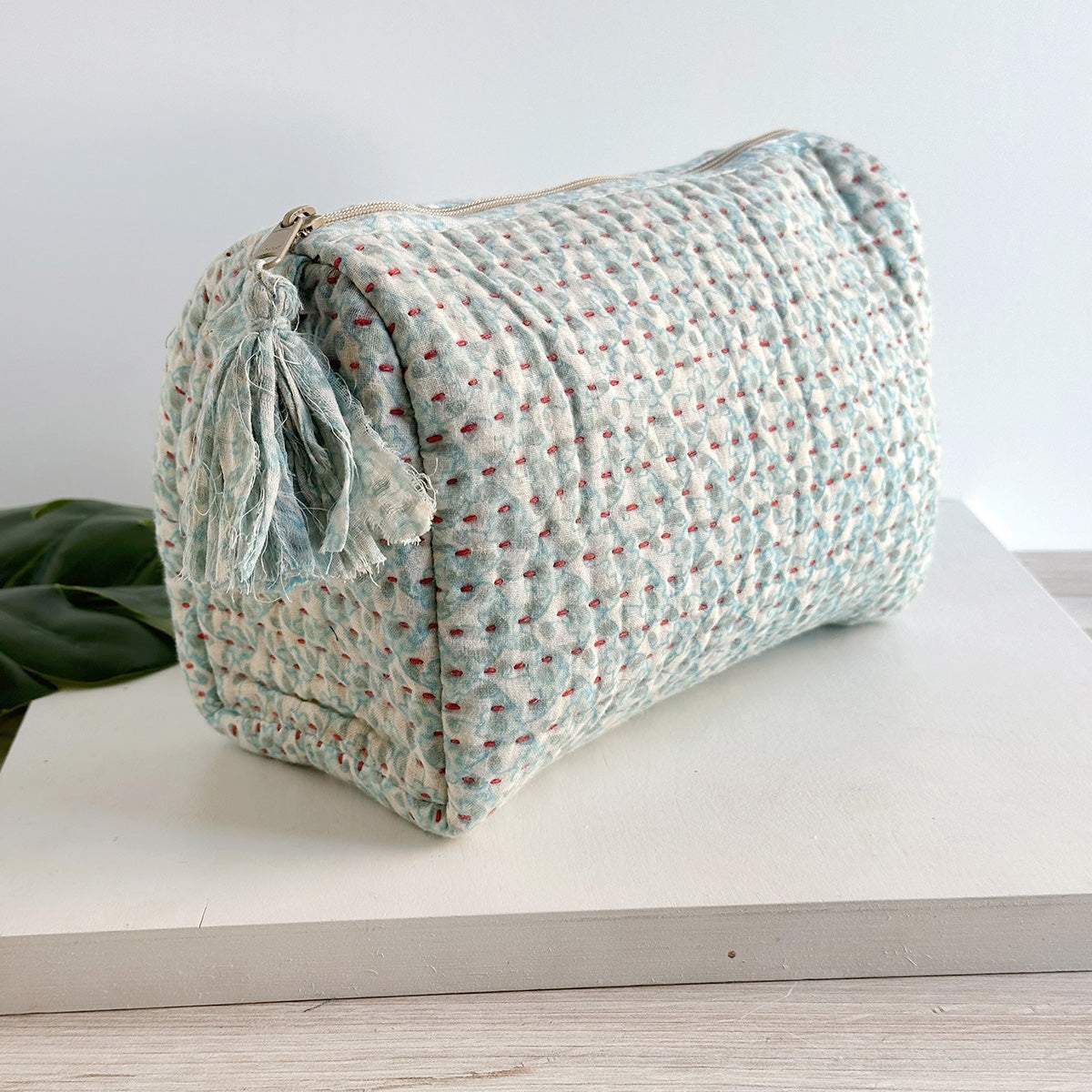 Each bag is handmade from upcycled Kantha quilts and is finished with a decorative tassel on the zipper. The nylon lining easily wipes clean. The interior features multiple pockets for organization.