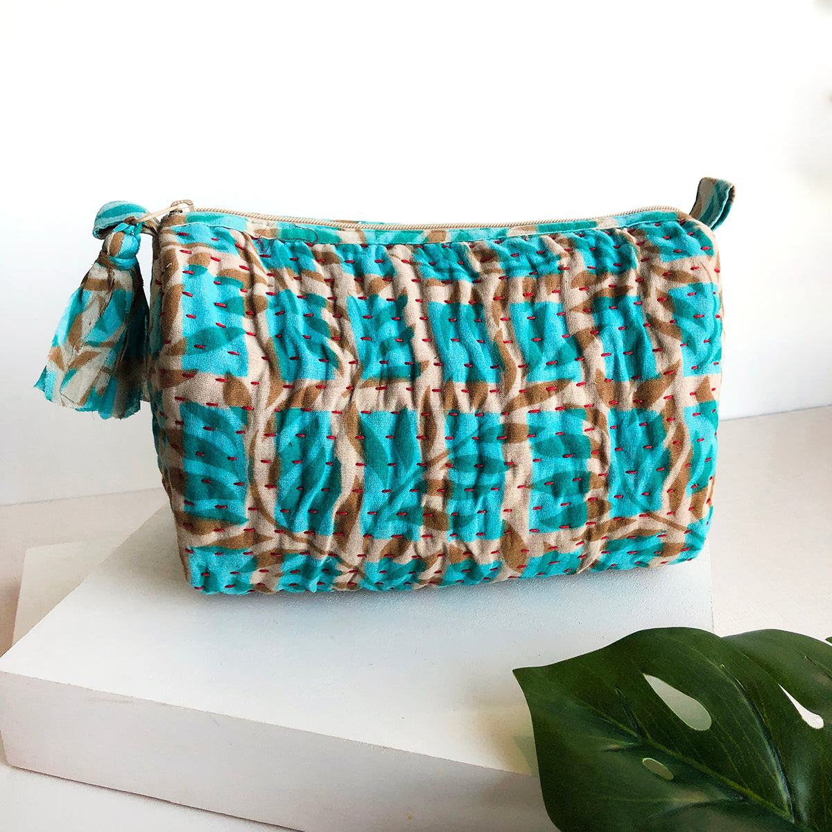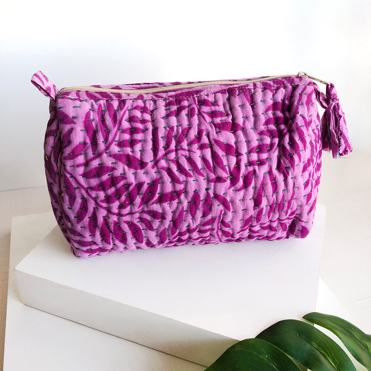 Each bag is handmade from upcycled Kantha quilts and is finished with a decorative tassel on the zipper. The nylon lining easily wipes clean. The interior features multiple pockets for organization.