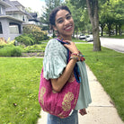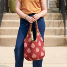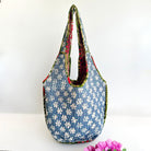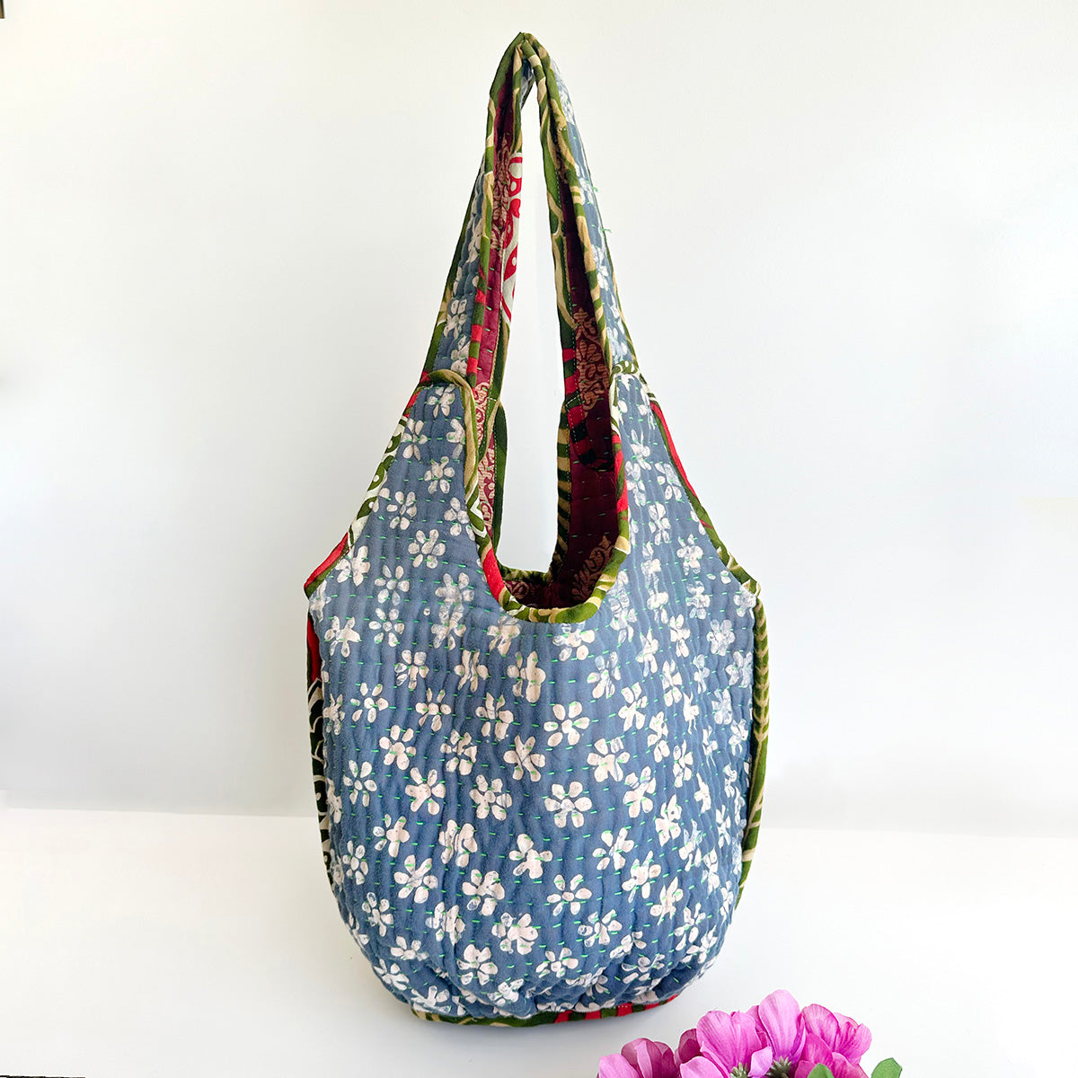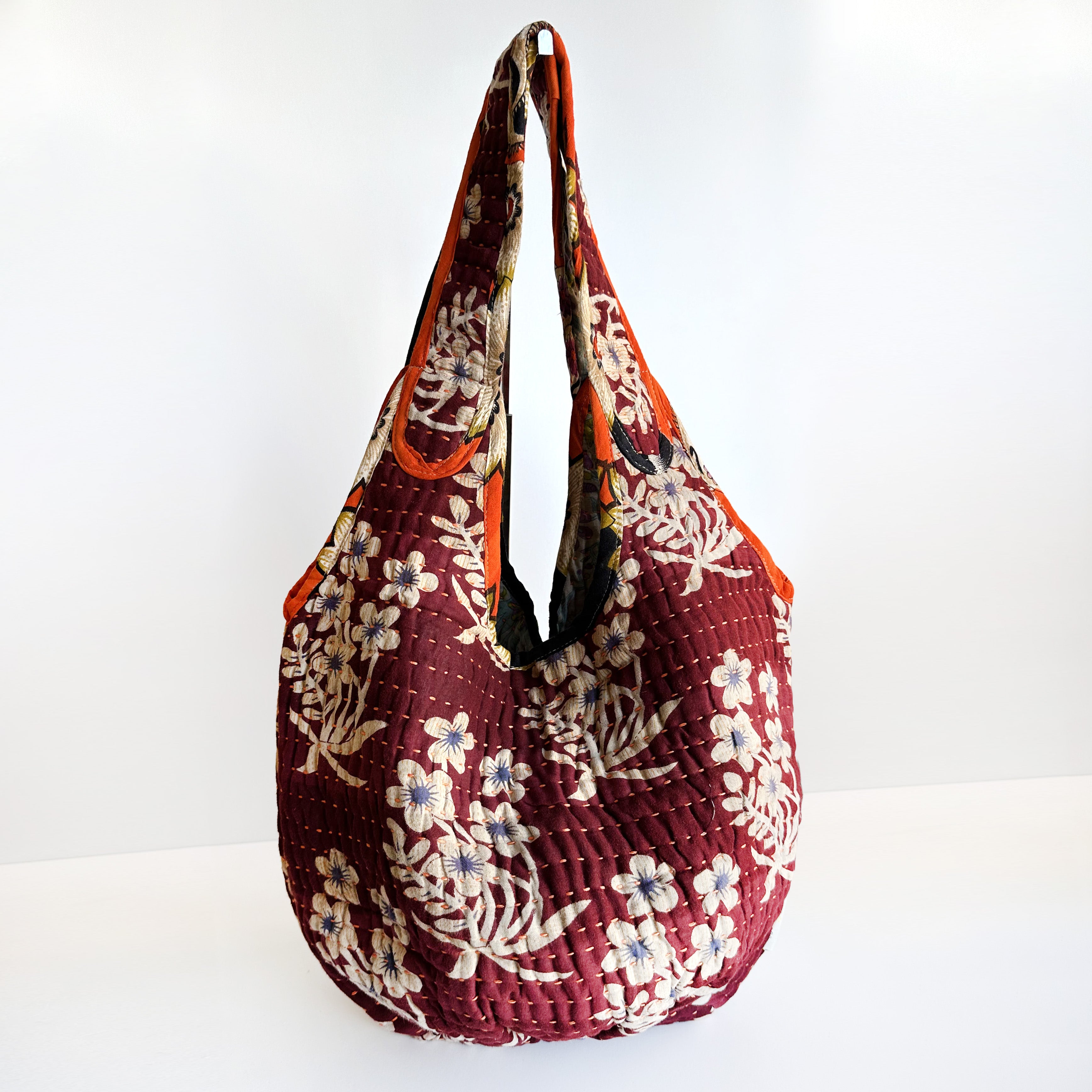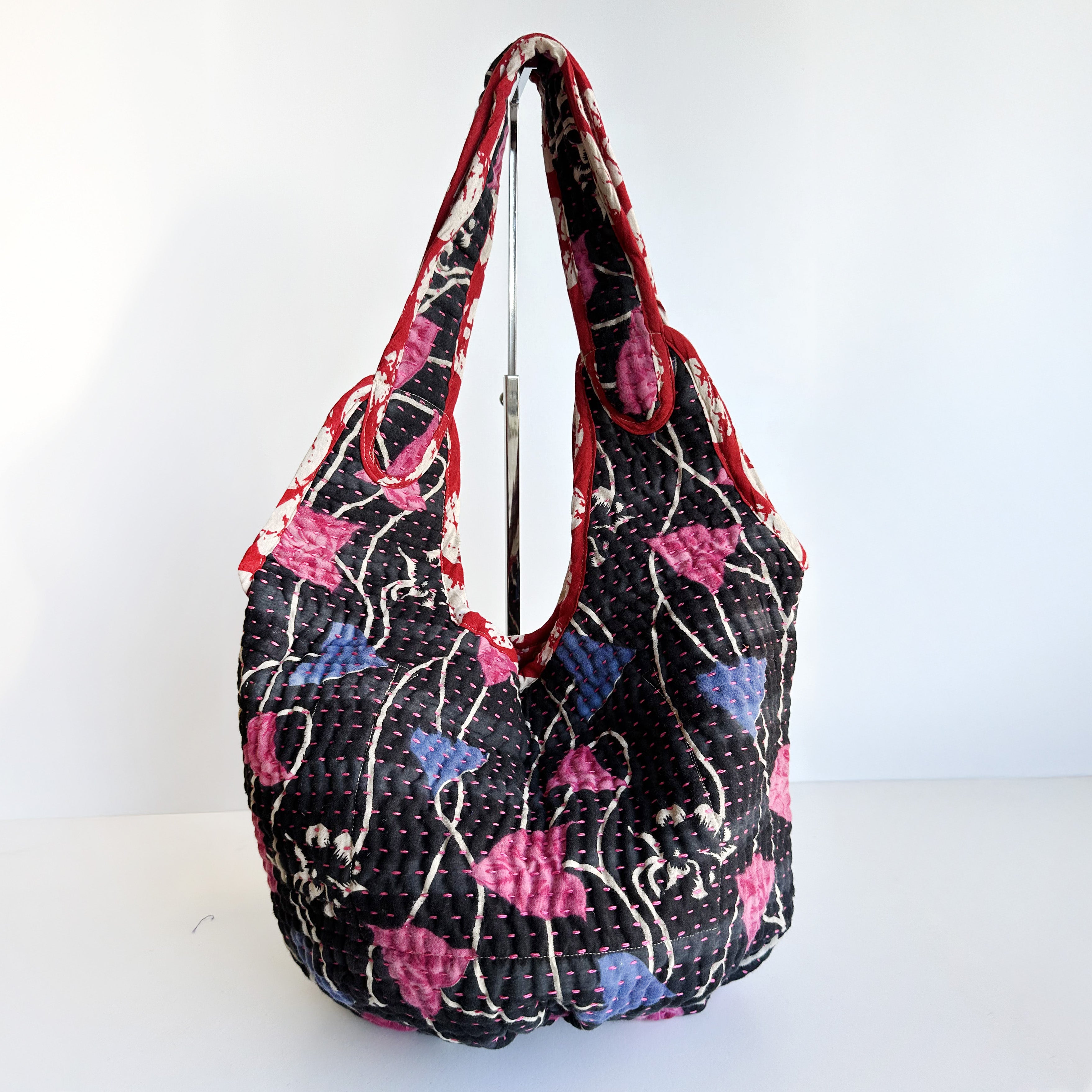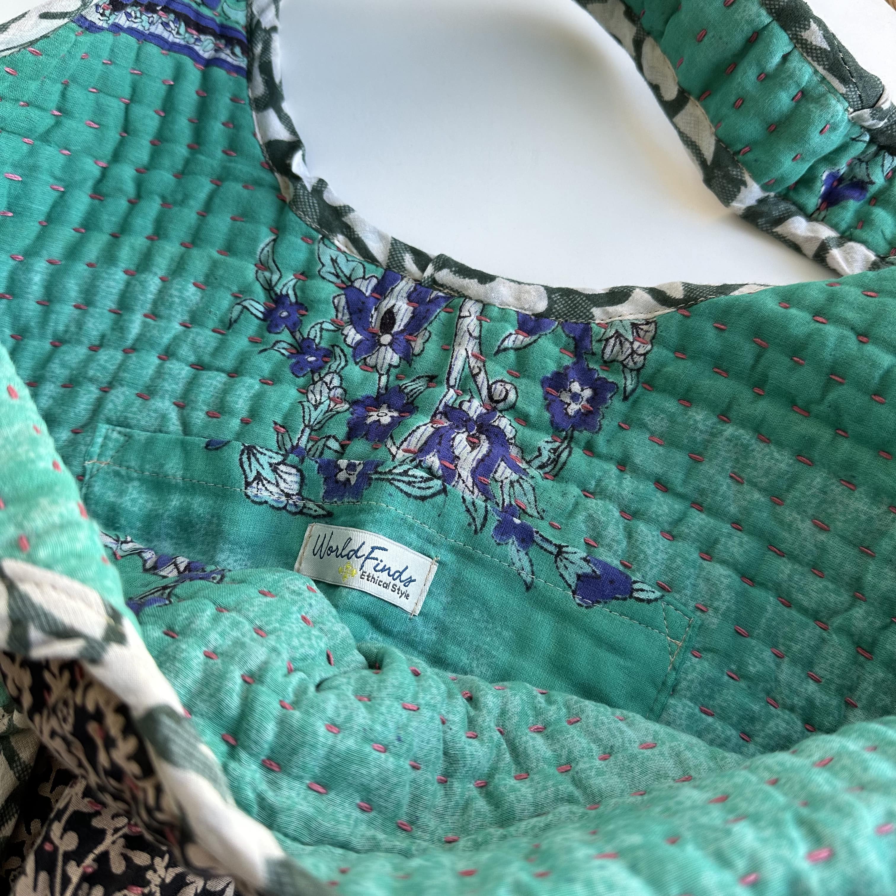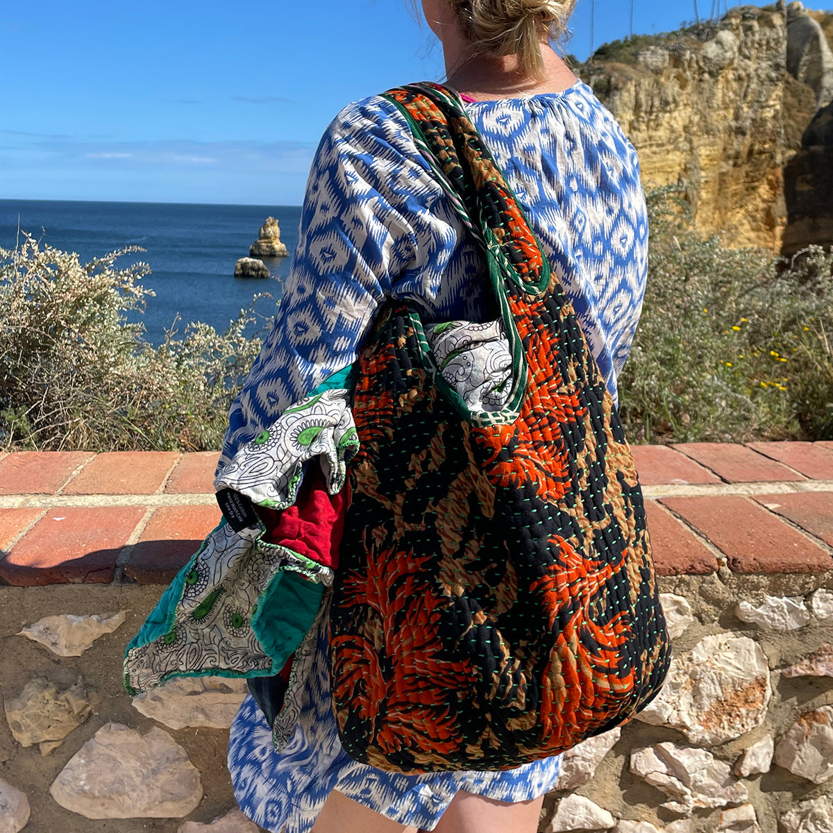 This sturdy bag will accompany you to so many places! Handmade from repurposed Kantha textiles, it's reversible for different looks. Features a wide base for holding everything you'll need for an adventurous day out.