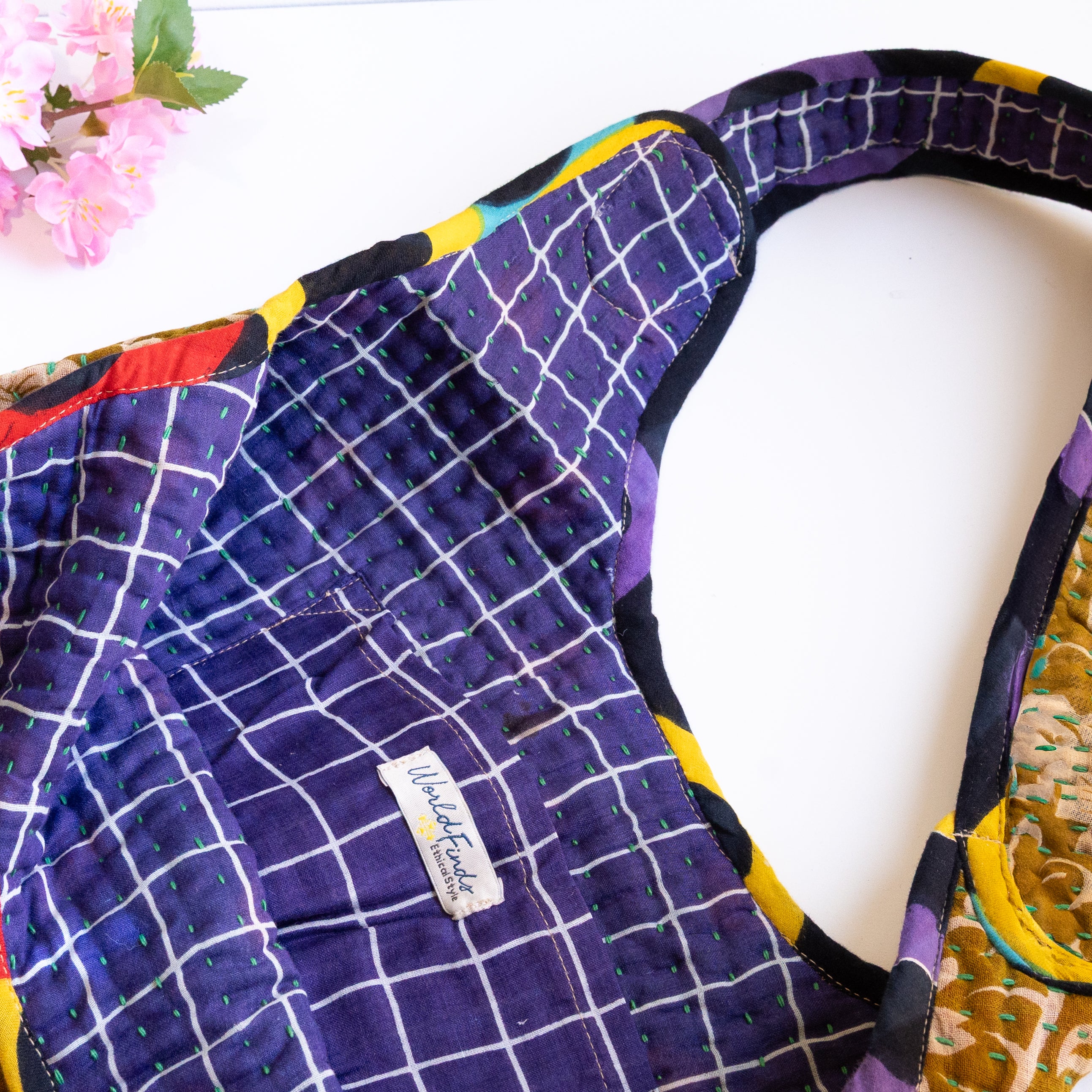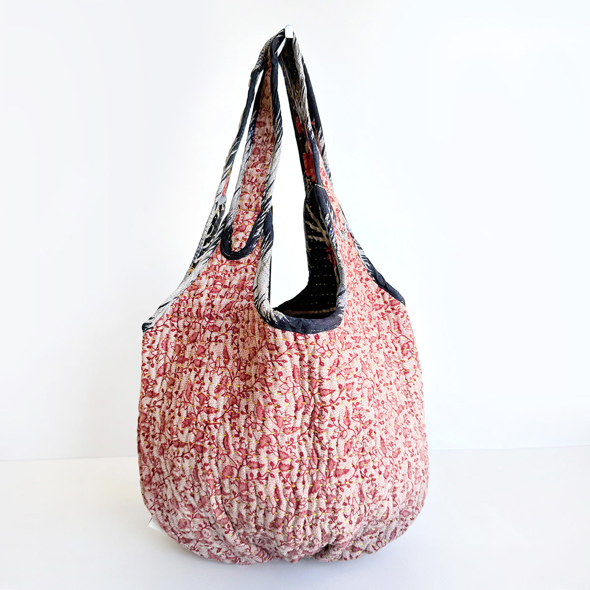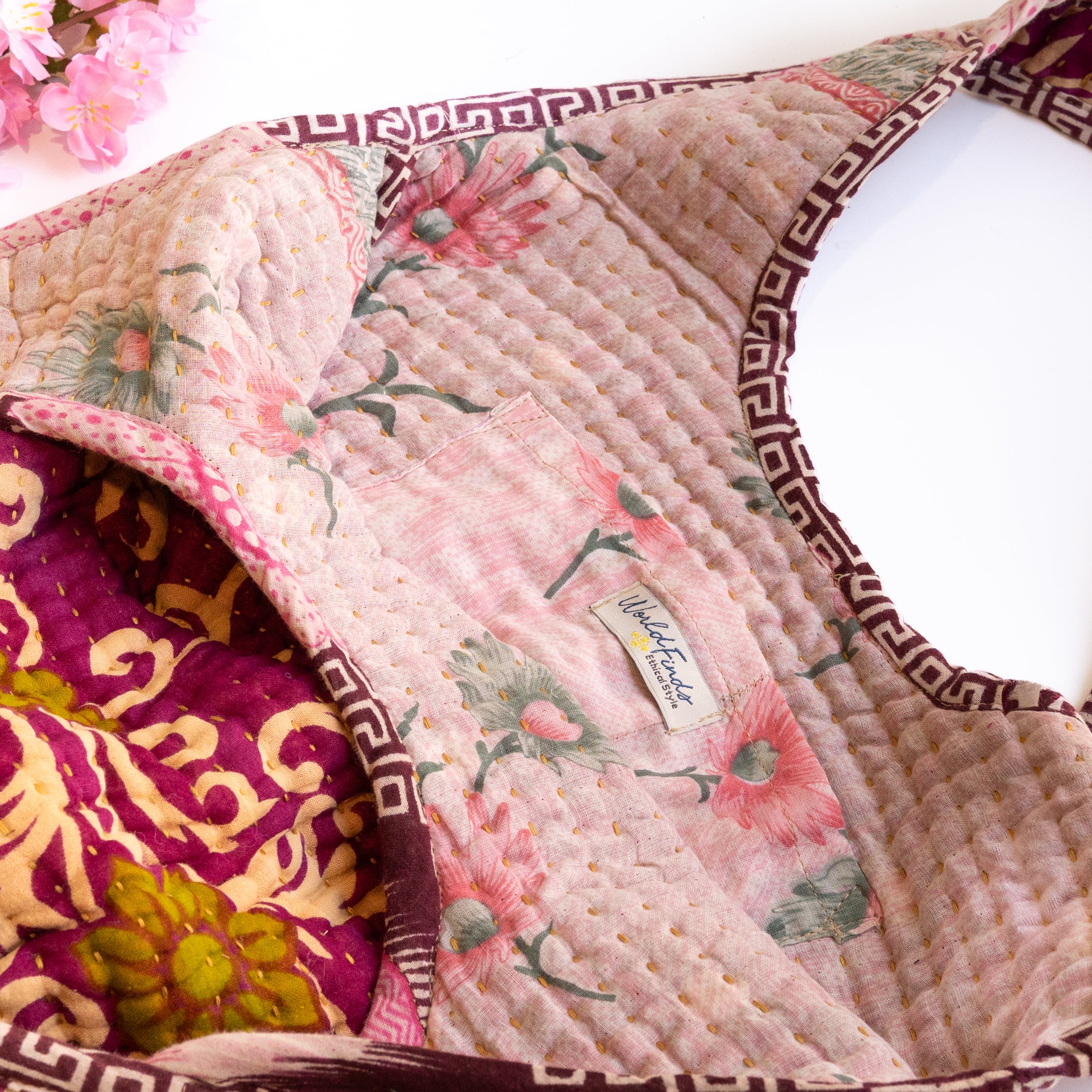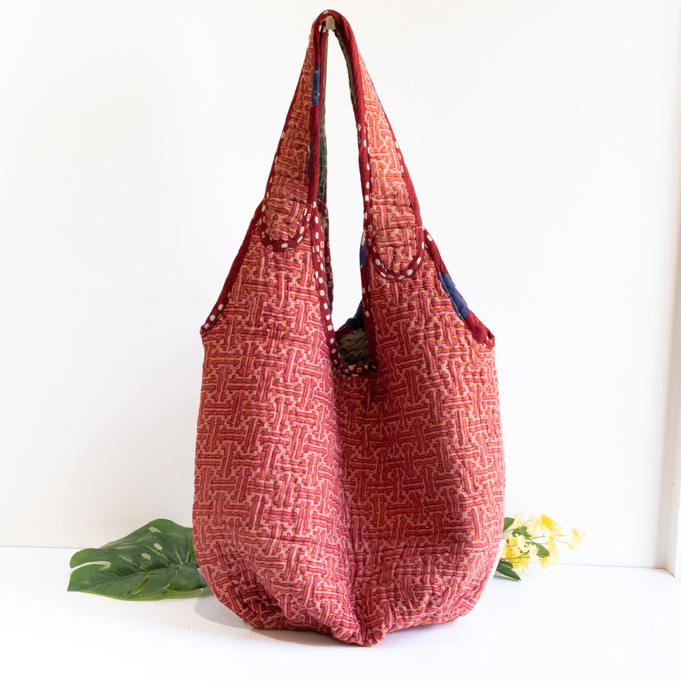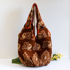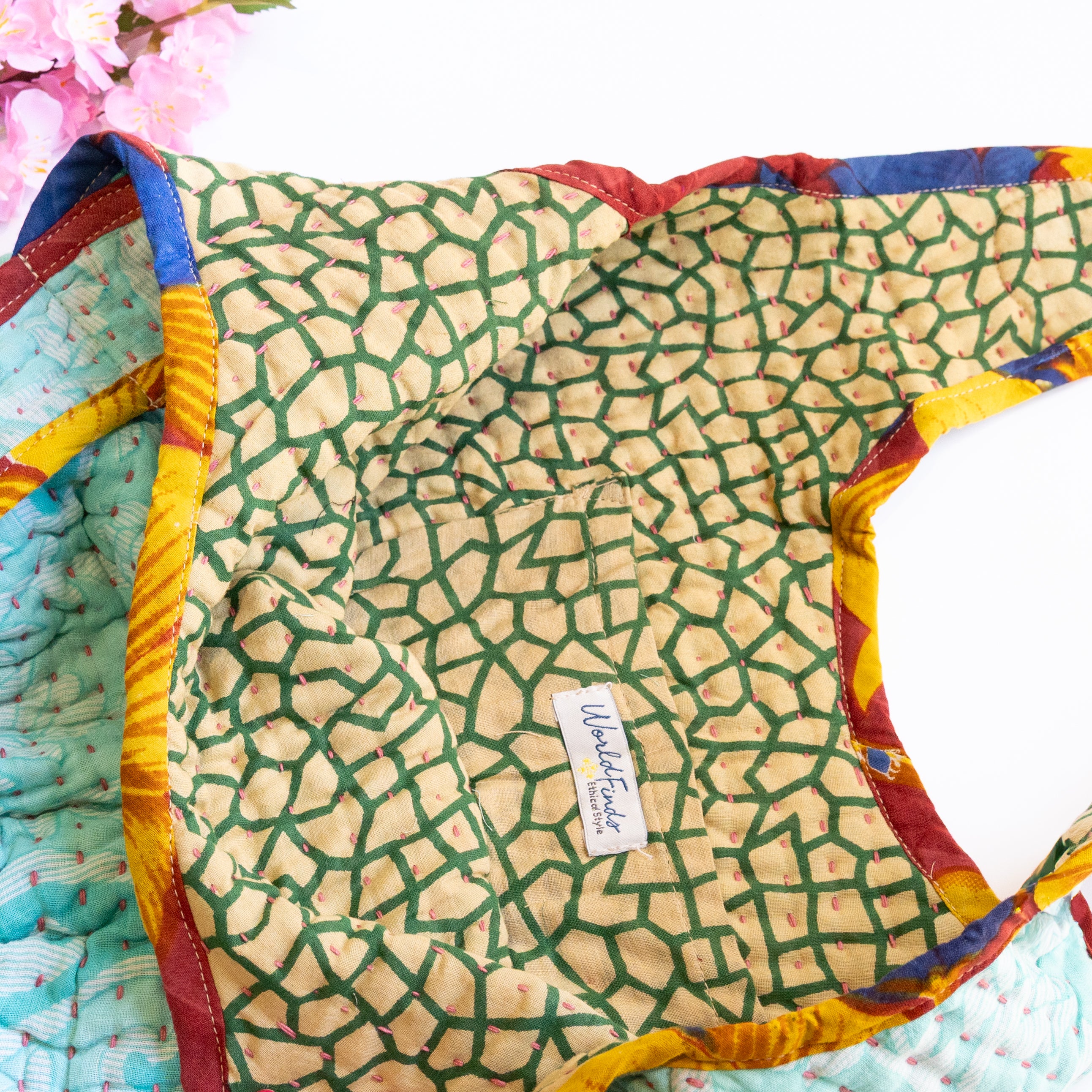 Interior features a contrasting Kantha quilt lining and a spacious pocket.
