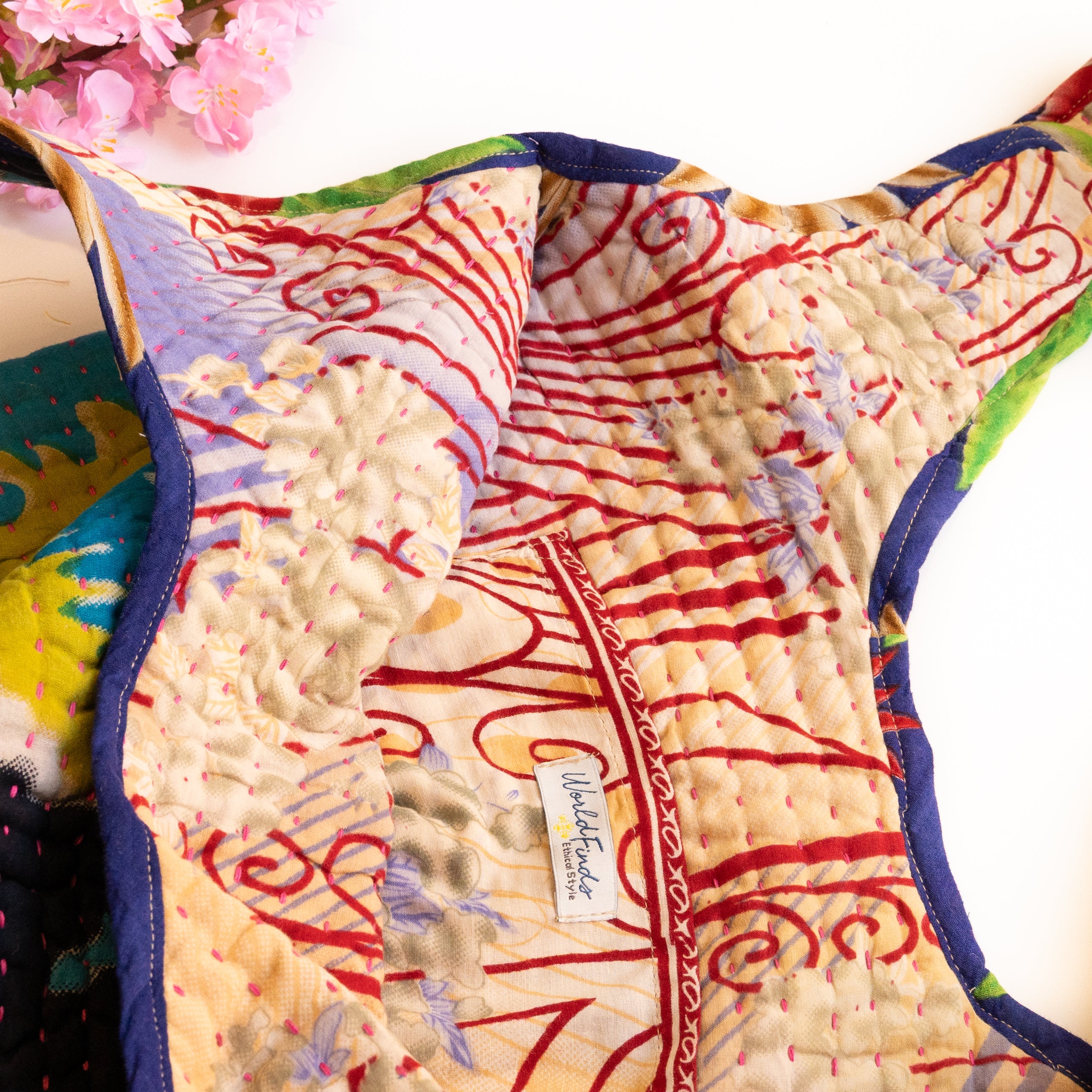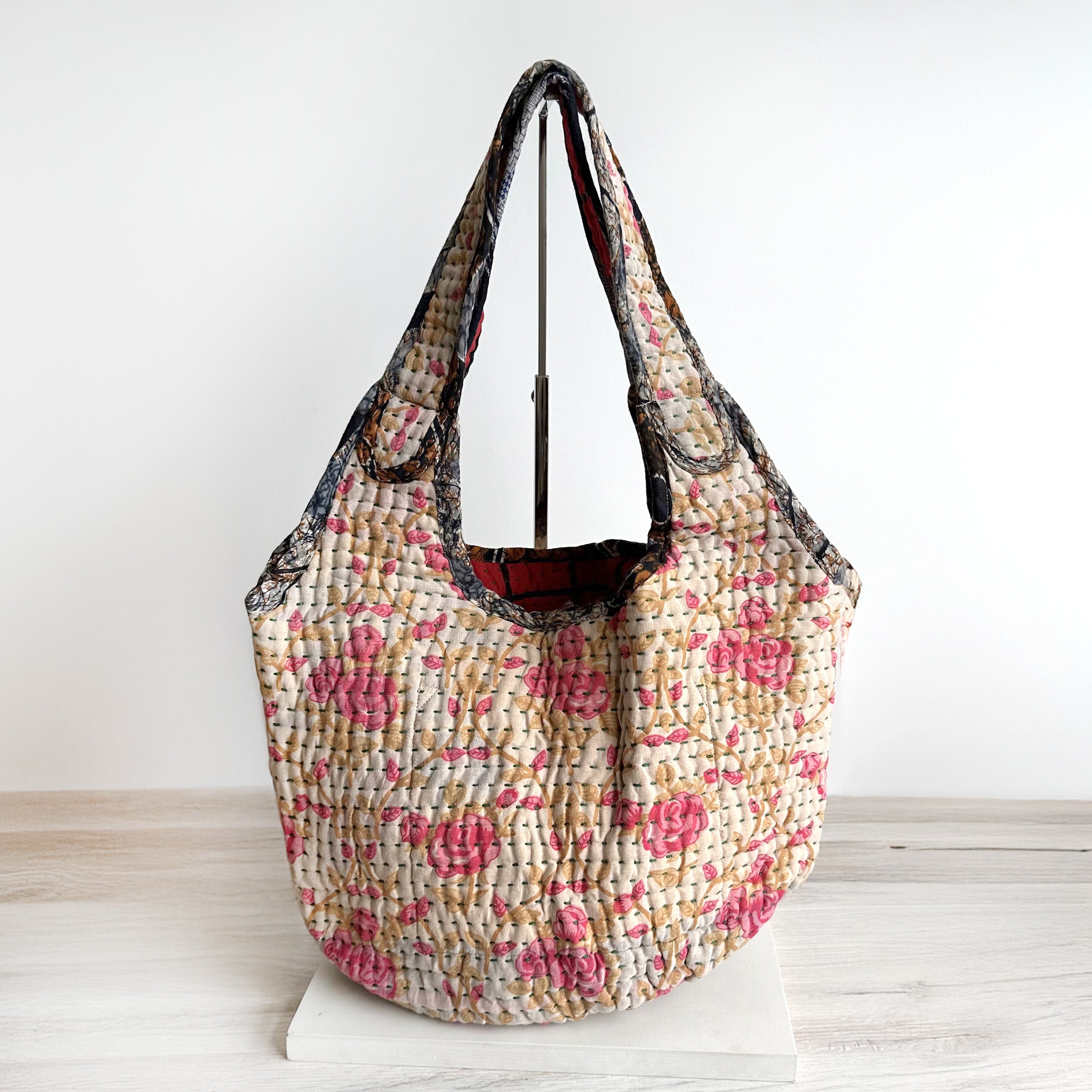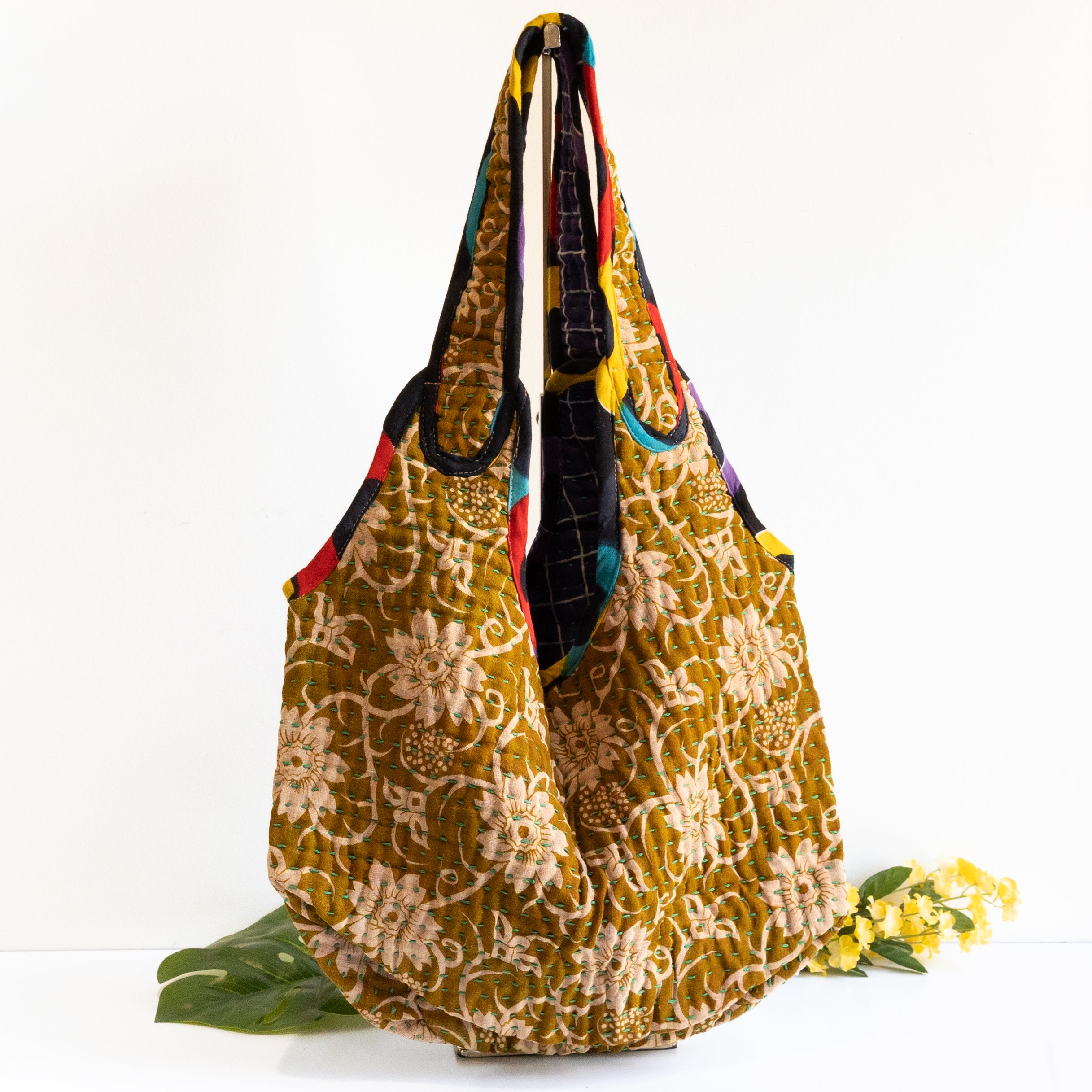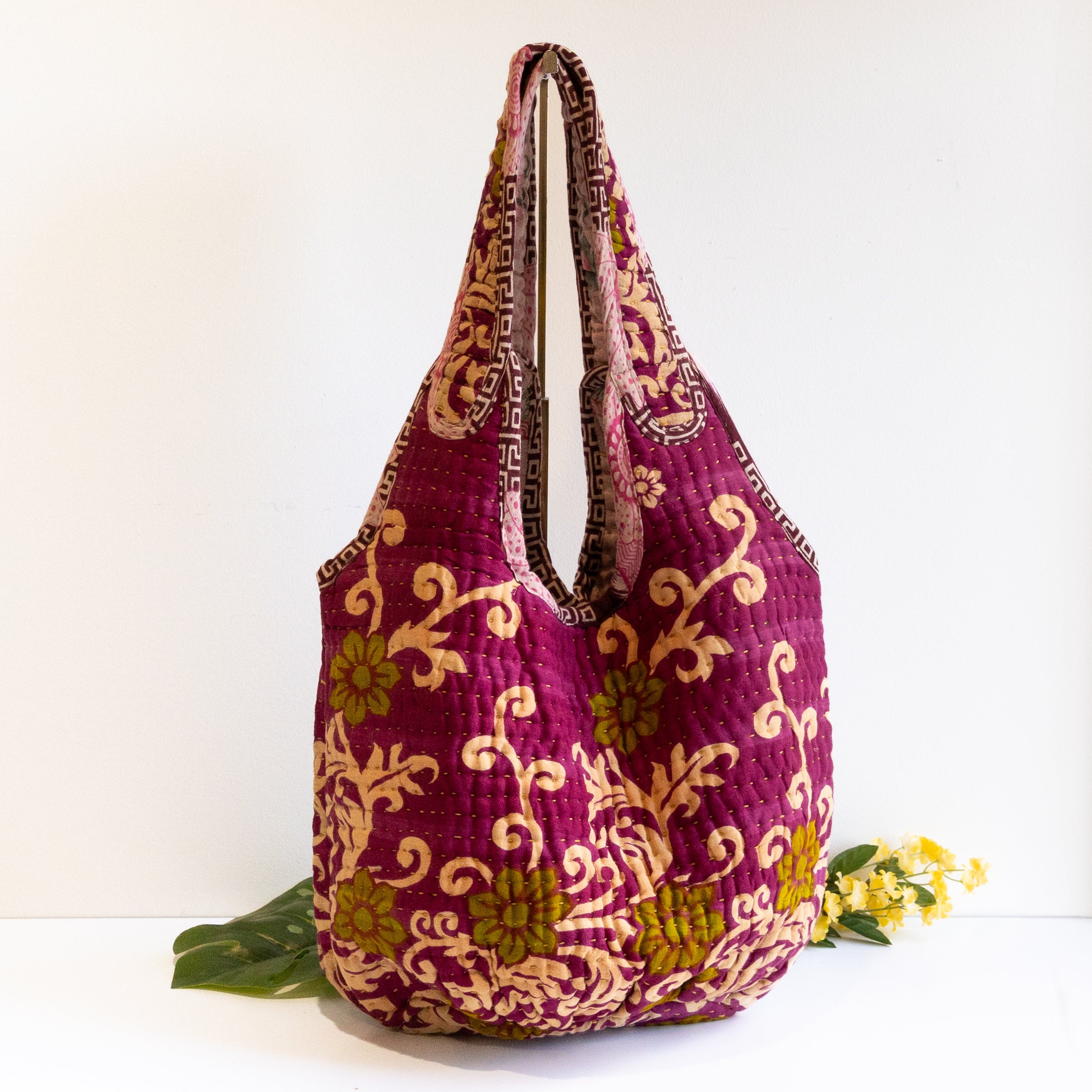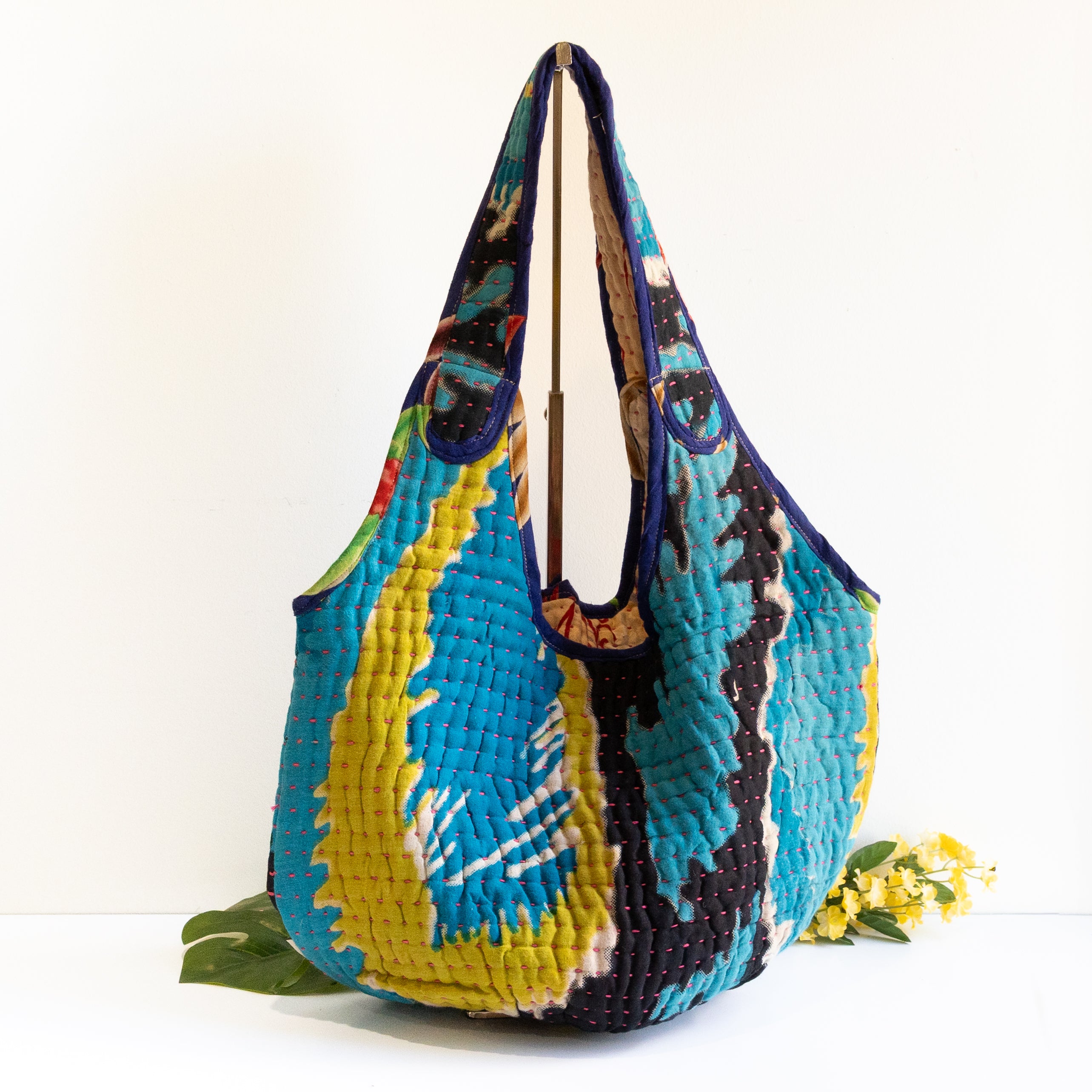 Interior features a contrasting Kantha quilt lining and a spacious pocket.