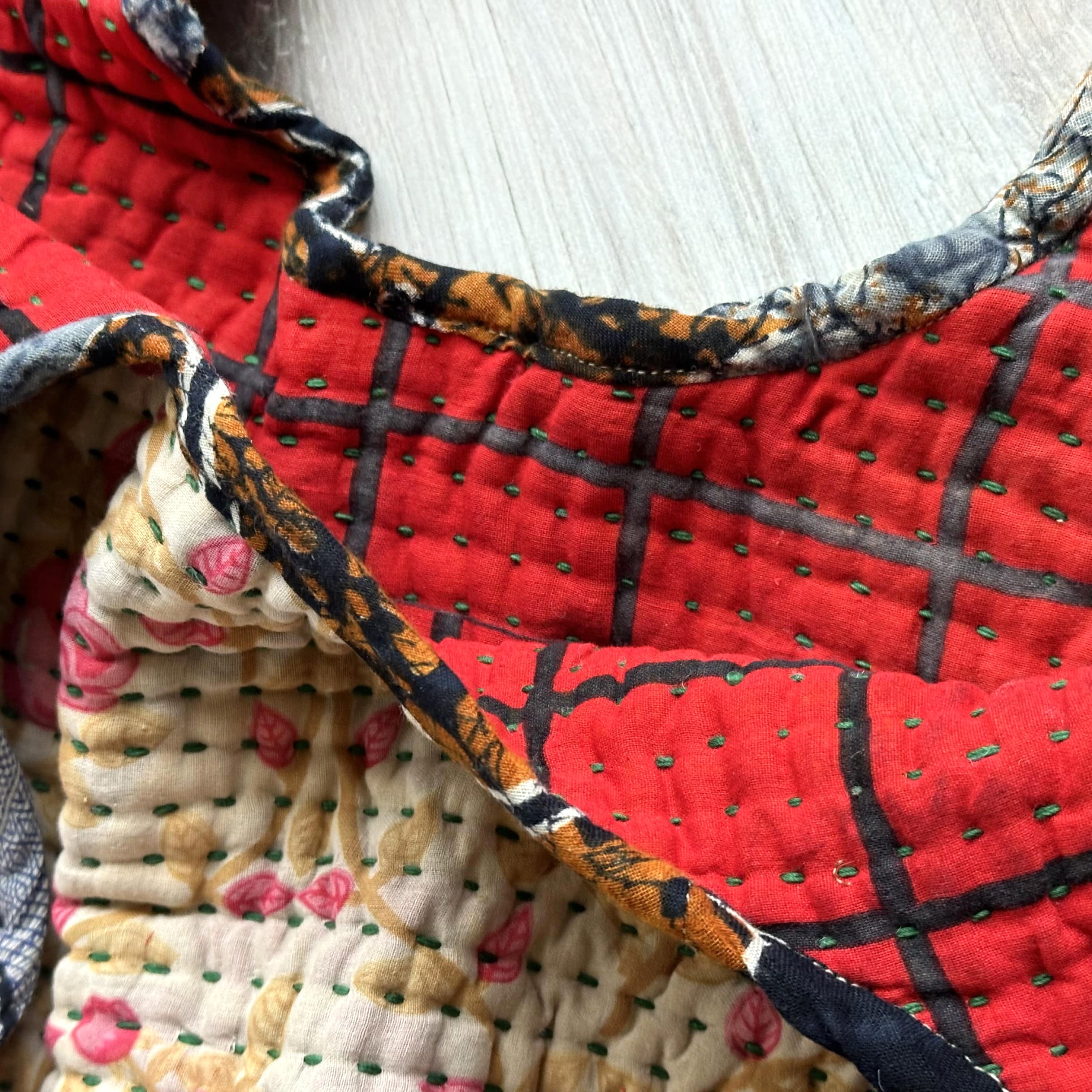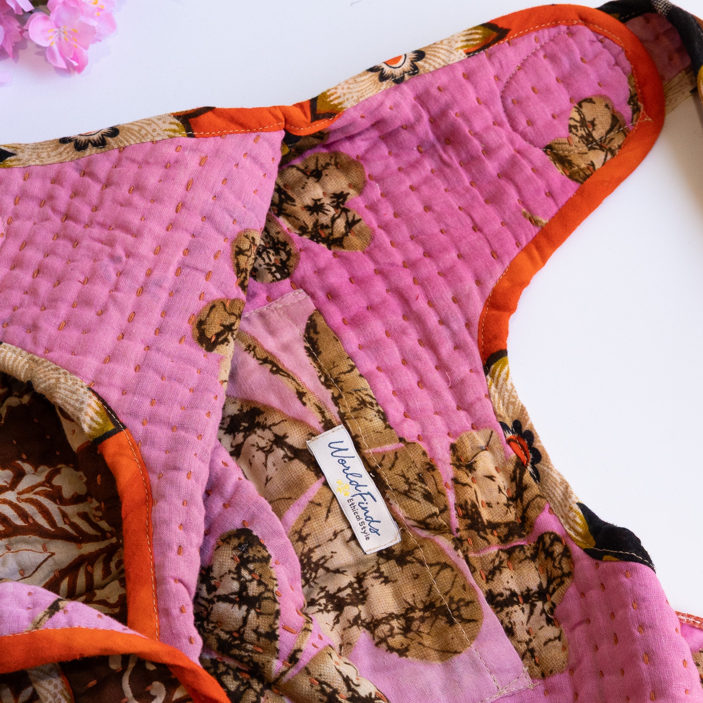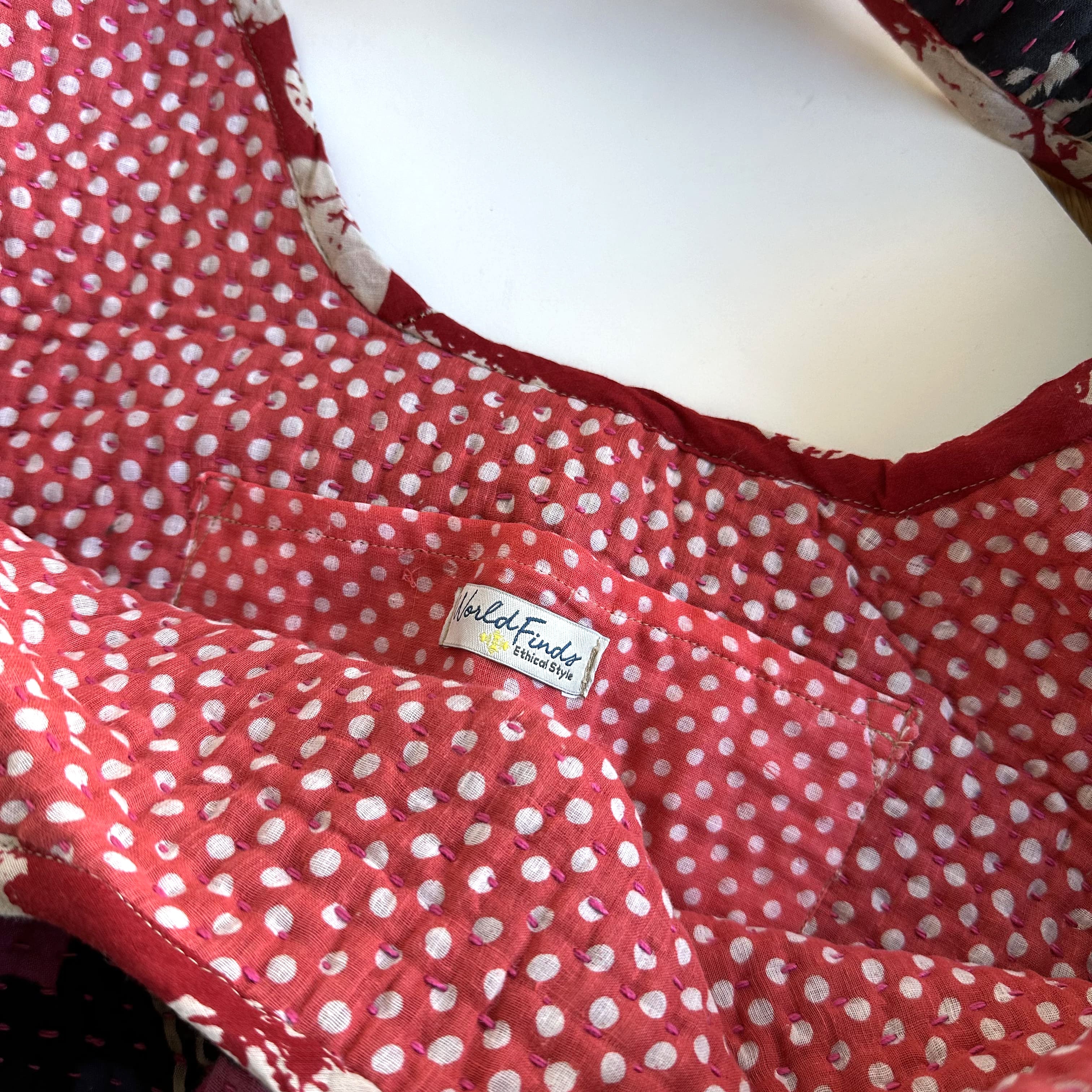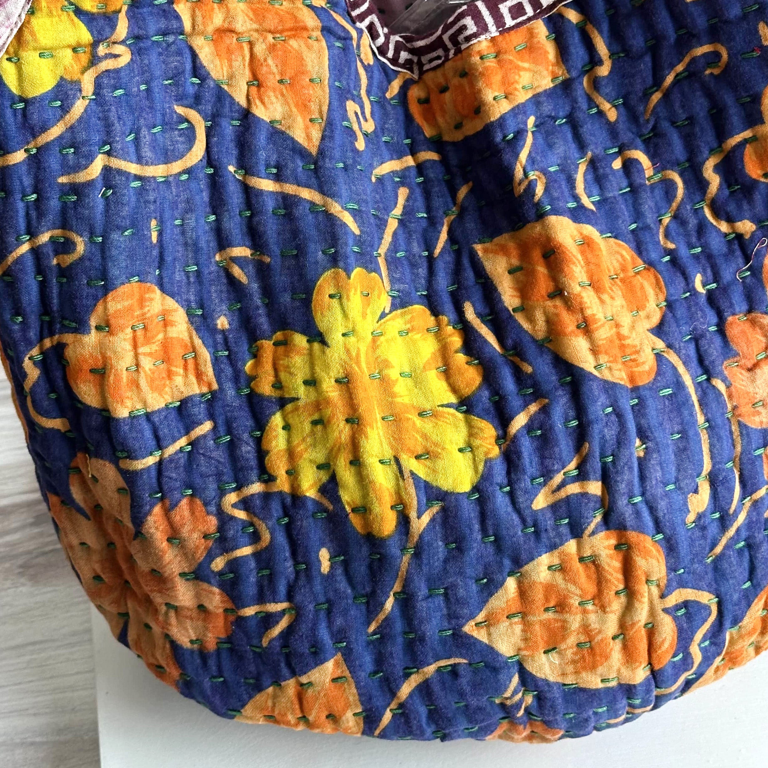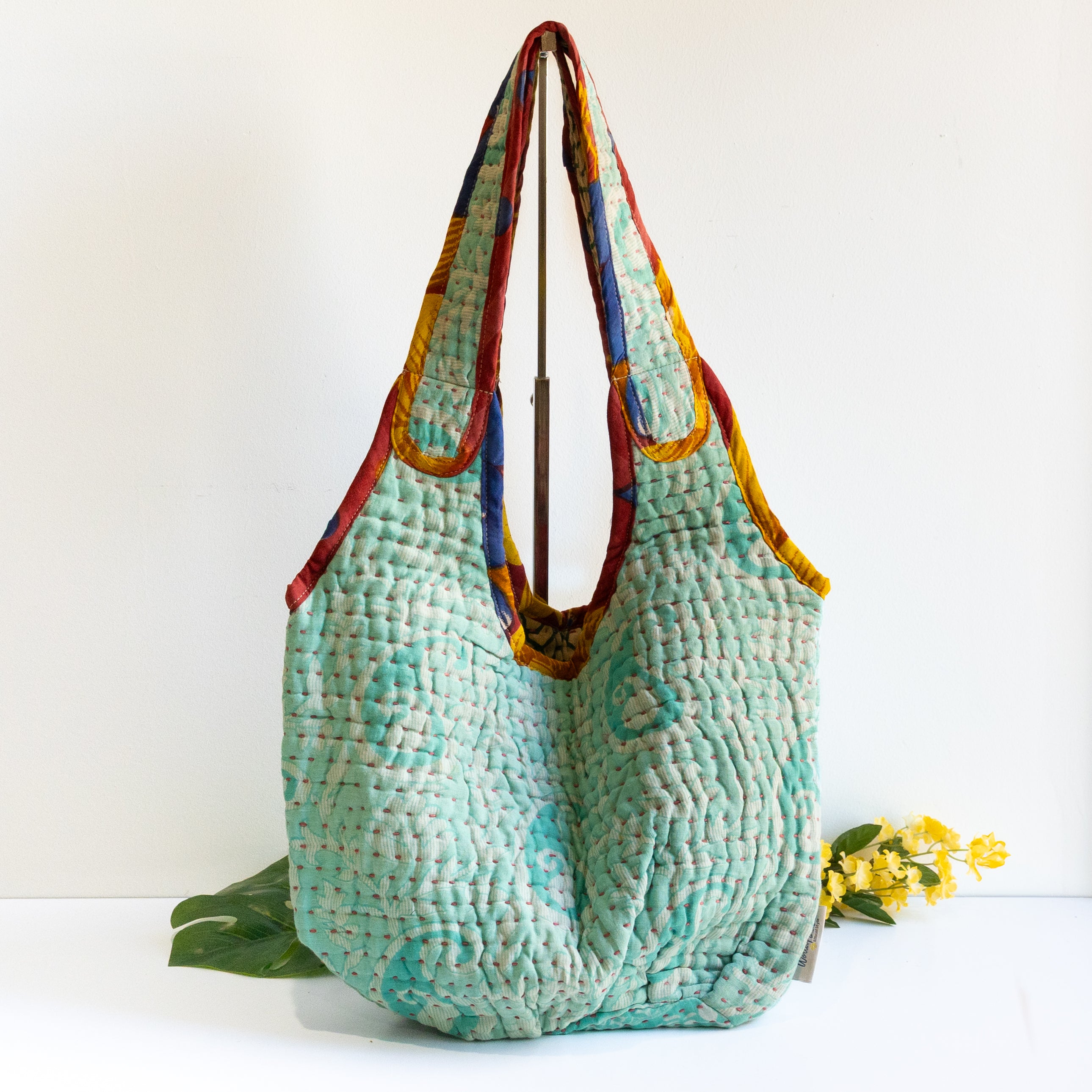 Interior features a contrasting Kantha quilt lining and a spacious pocket.