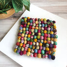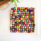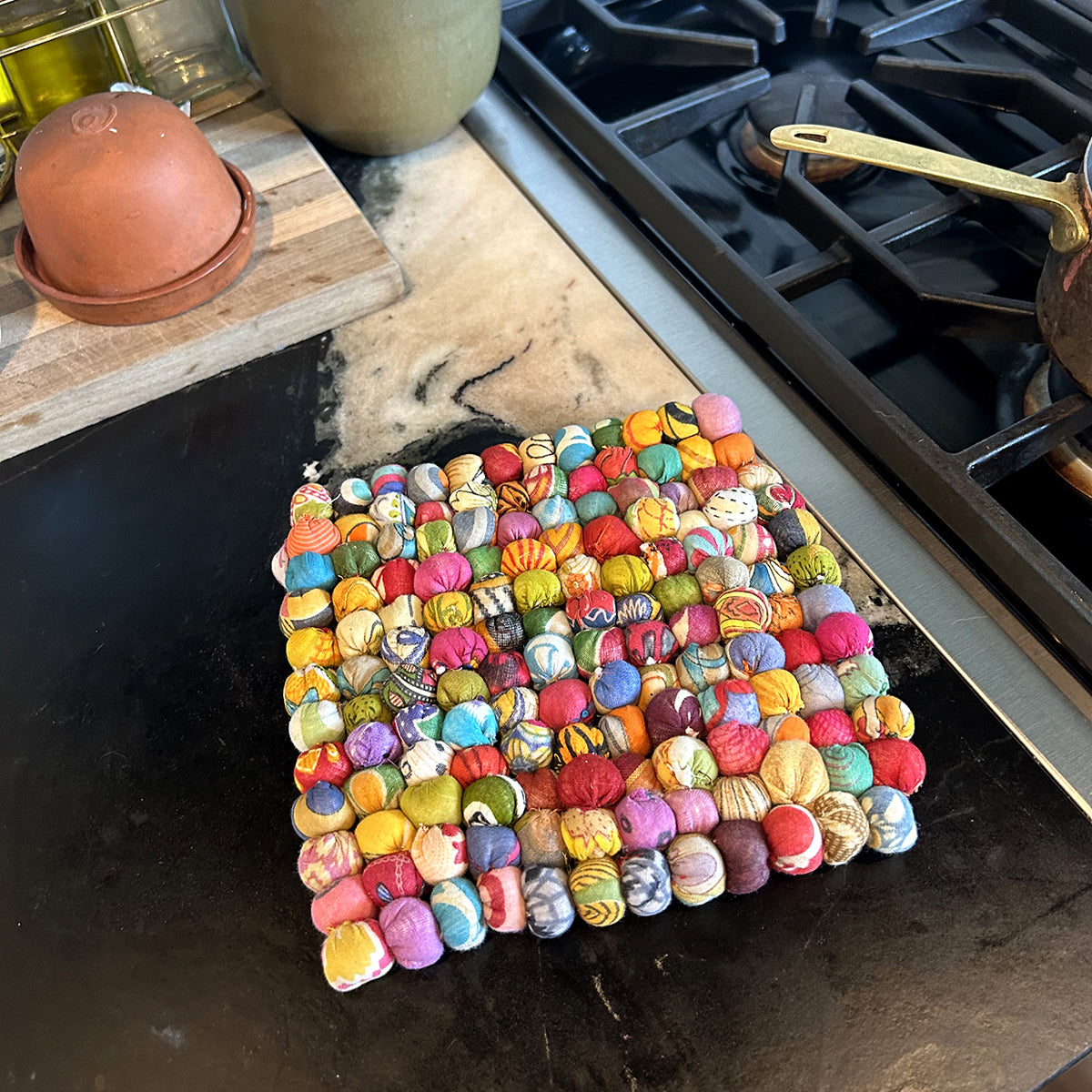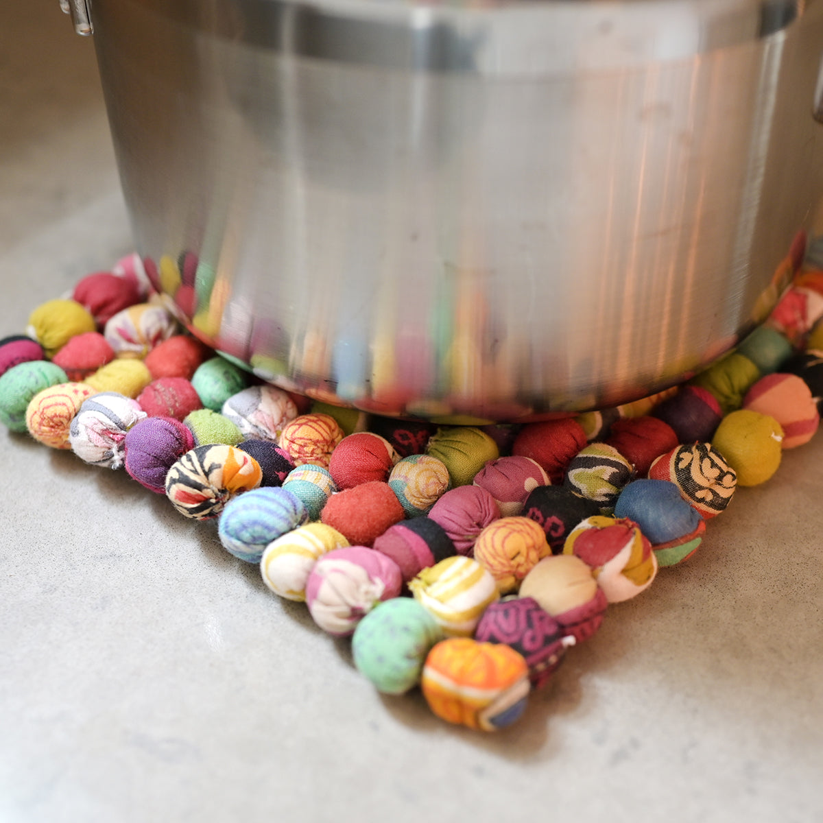 Brighten up your home and protect your surfaces with this colorful Sari Trivet! Every one of these handmade pieces starts with upcycled Sari textiles crafted into balls and filled with soft cotton. Vibrant colors and patterns vary with each unique design.