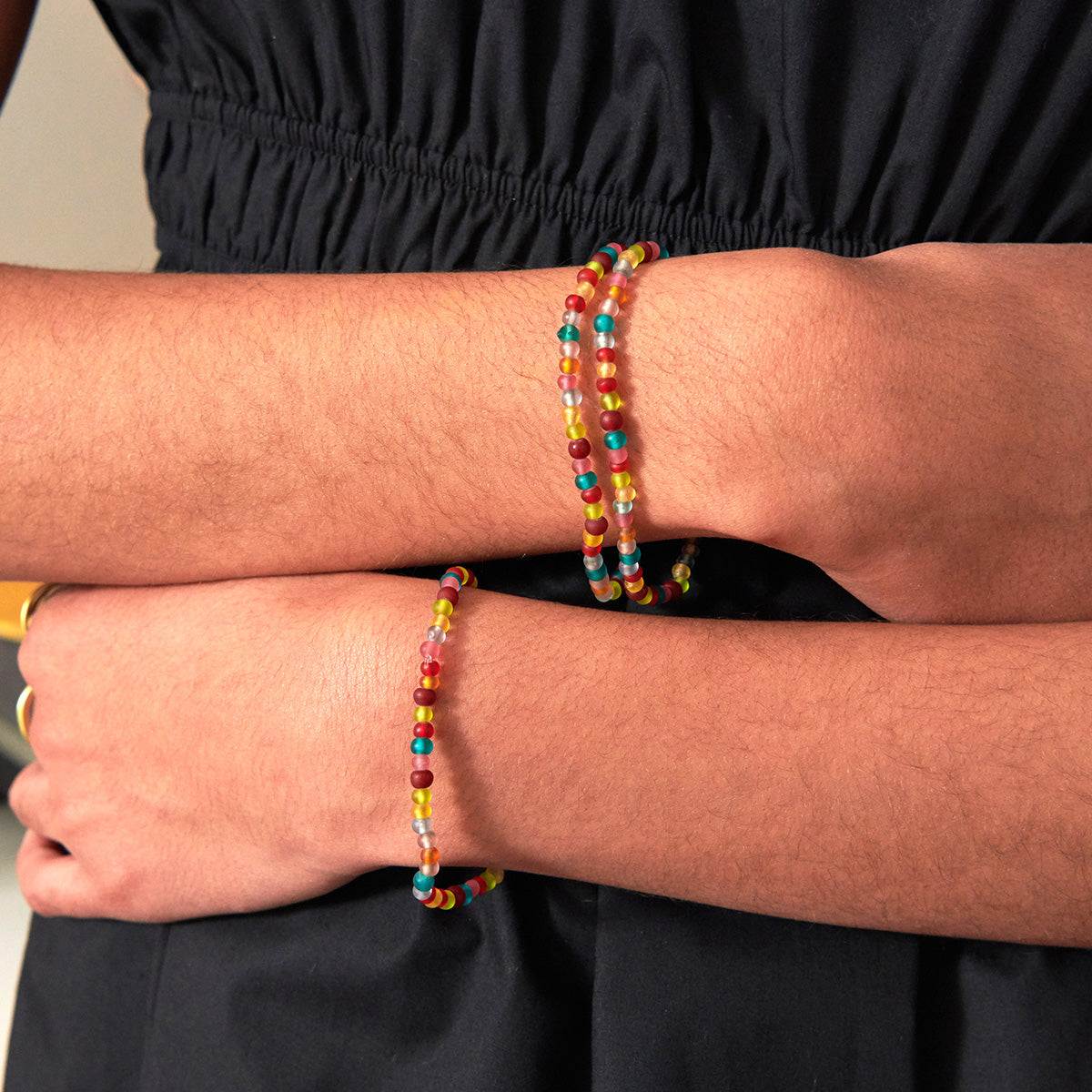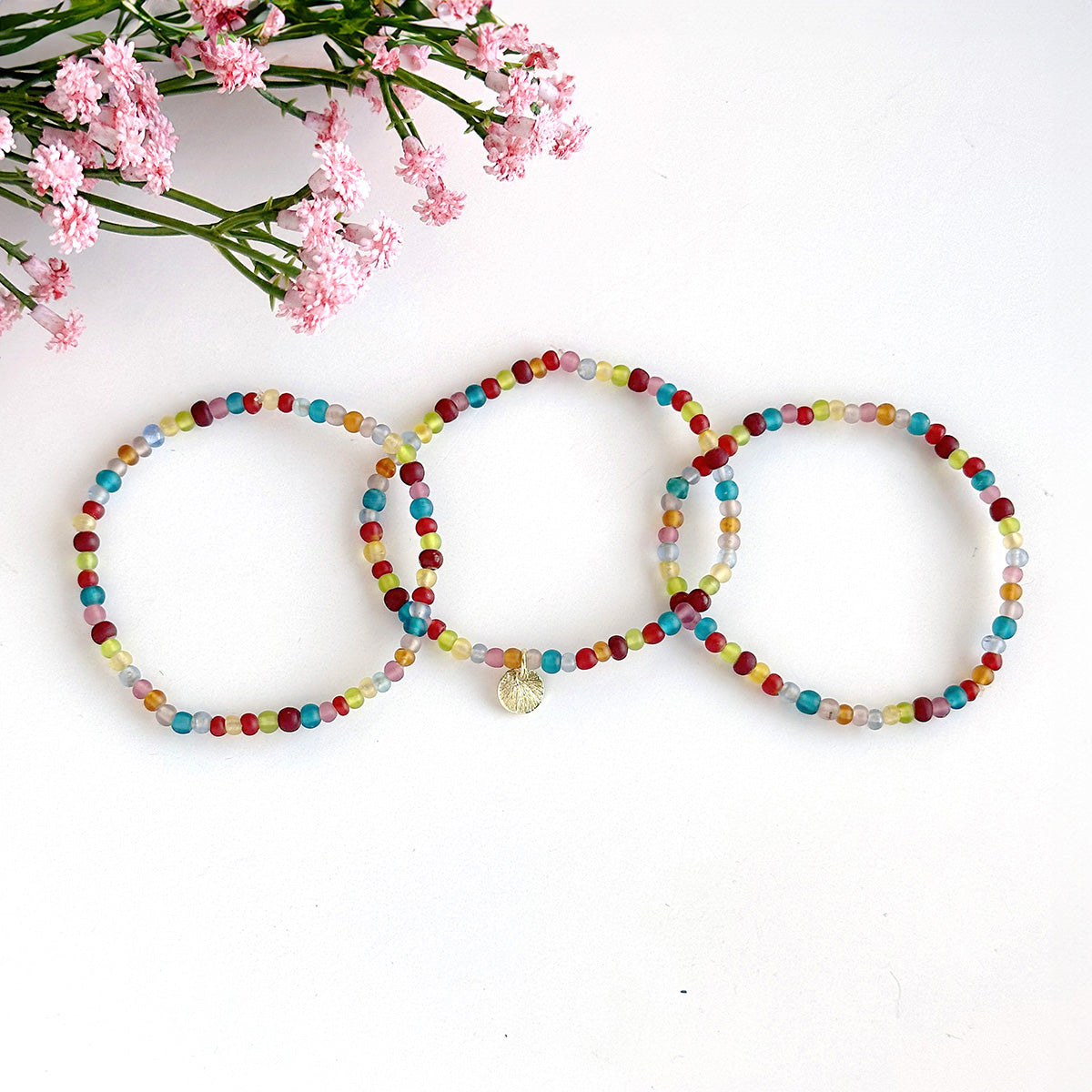 Three individual strands of colorful glass beads form a versatile trio of bracelets. Wear all three together or individually; one strand has a metallic gold charm for an extra flourish. The semi-opaque beads have a satin, frosted texture and are handmade from recycled glass.