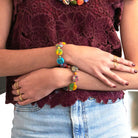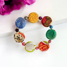 Seven Kantha covered disc-shaped beads alternate with small round Kantha beads and matte metallic seed beads to create this textured style. This fun style looks like a chain of colorful hard candies encircling your wrist!