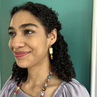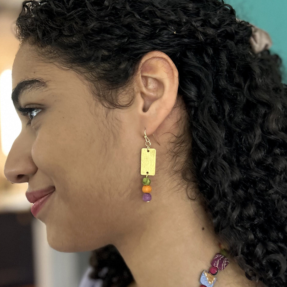 These asymmetrical earrings create a fun and unexpected look with brass plates combining with Kantha beads. Each piece is made from recycled Kantha textiles, so colors and patterns are all one-of-a-kind and will vary.