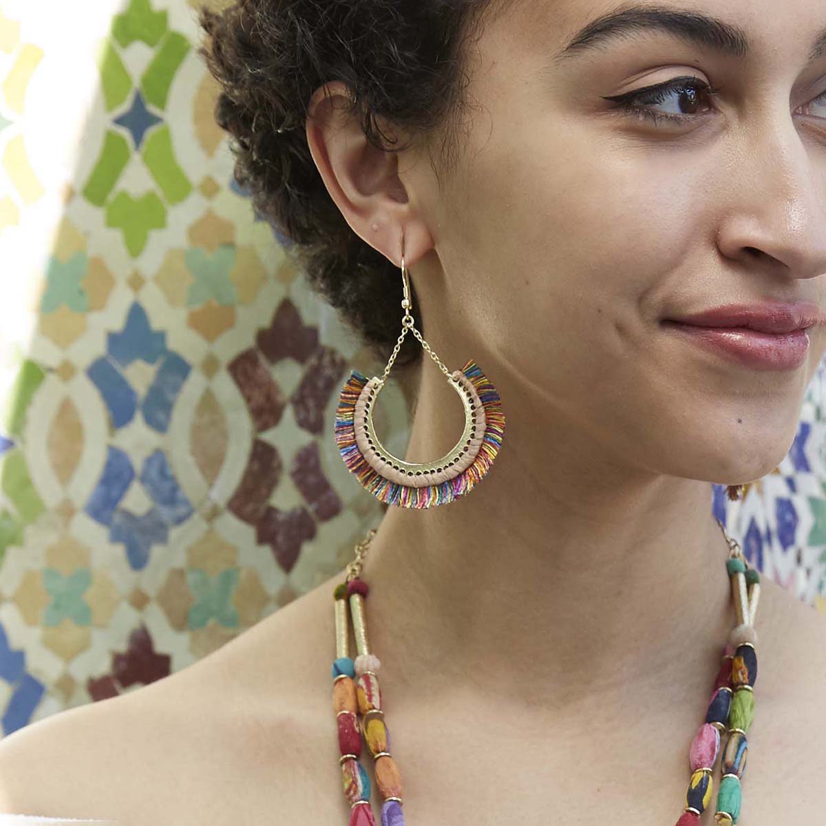 Breathe new life into your outfit with these stunning statement earrings. Expertly hand-stitched and adorned with a rainbow fringe trim, they're perfect for summer days as well as holiday gatherings.