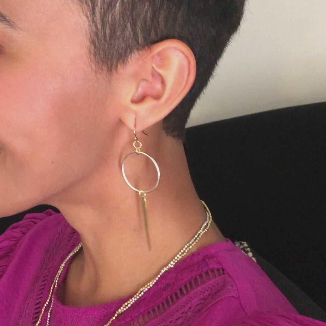 A matte silvertone hoop is made infinitely more interesting with an elongated gold leaf-shaped charm.