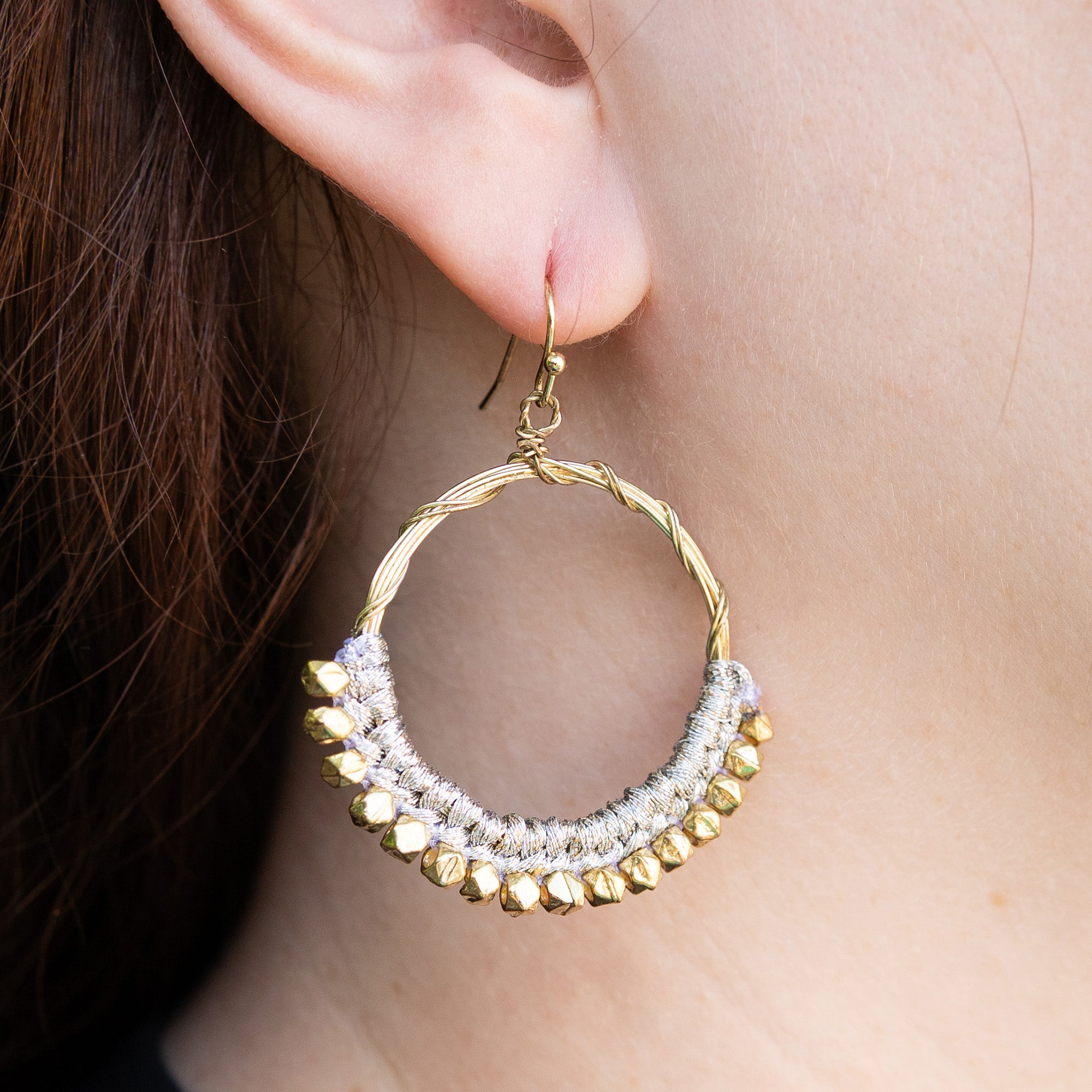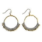 This unique style has so many interesting elements! Tiny gold wires are hand-wrapped to form a textured hoop base, and then the artisans crochet on a fringe of faceted goldtone beads at the base. The crochet thread is silver metallic for added embellishment. Crafted from a brass metal mix, the combination of textures and metal tones make this pair extra stunning.