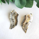 Channel your inner goddess! Three layers of fringed gold and silver metallic leather wings are accented with gold seed beads and geometric gunmetal beads. Finished with nickel- and lead-free post-backs.