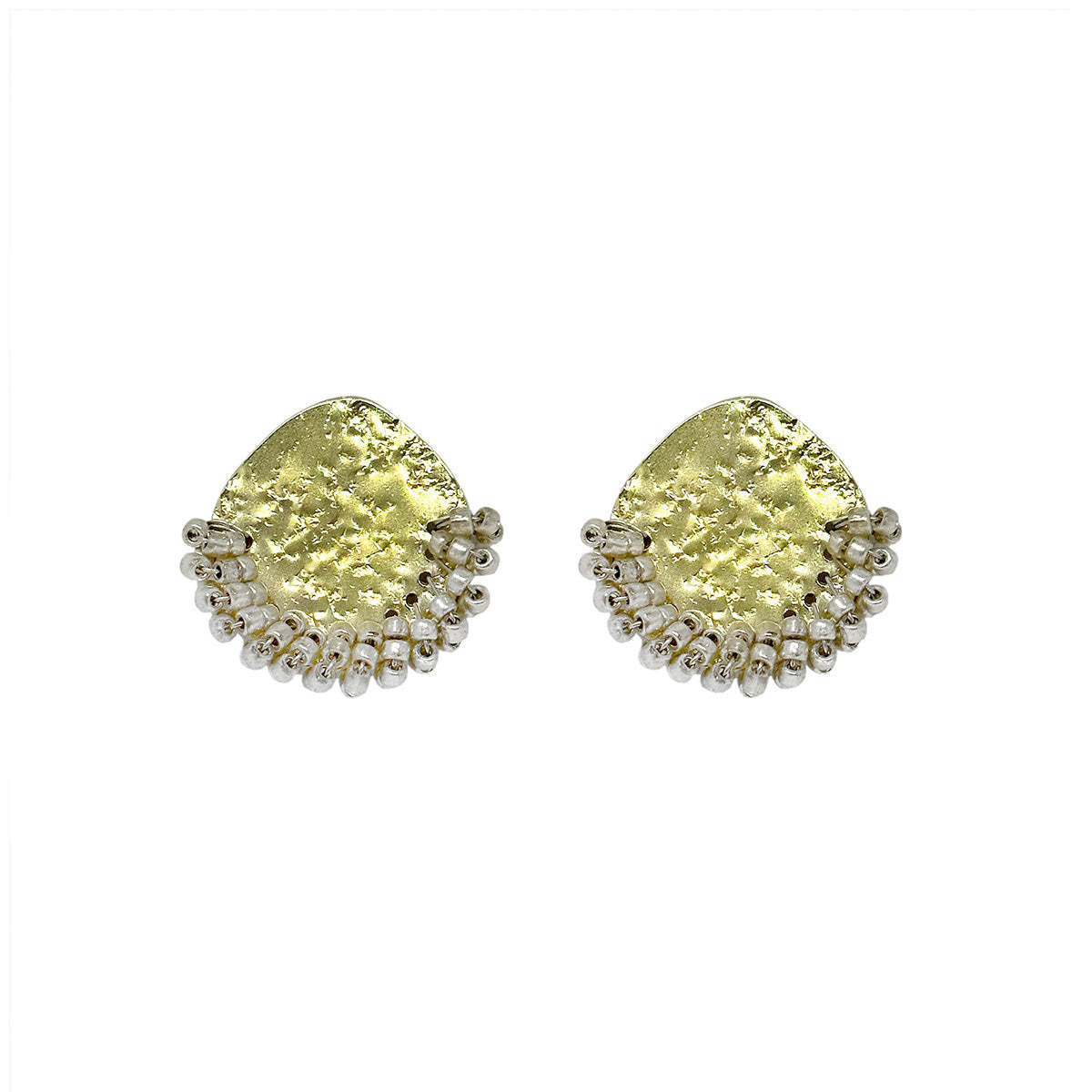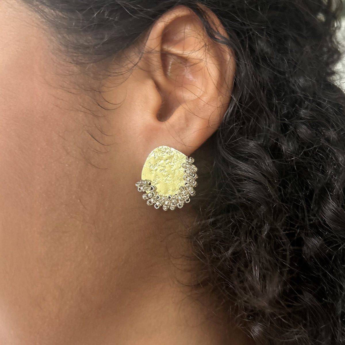 A textured circle is embellished with an arc of glistening silver beads.