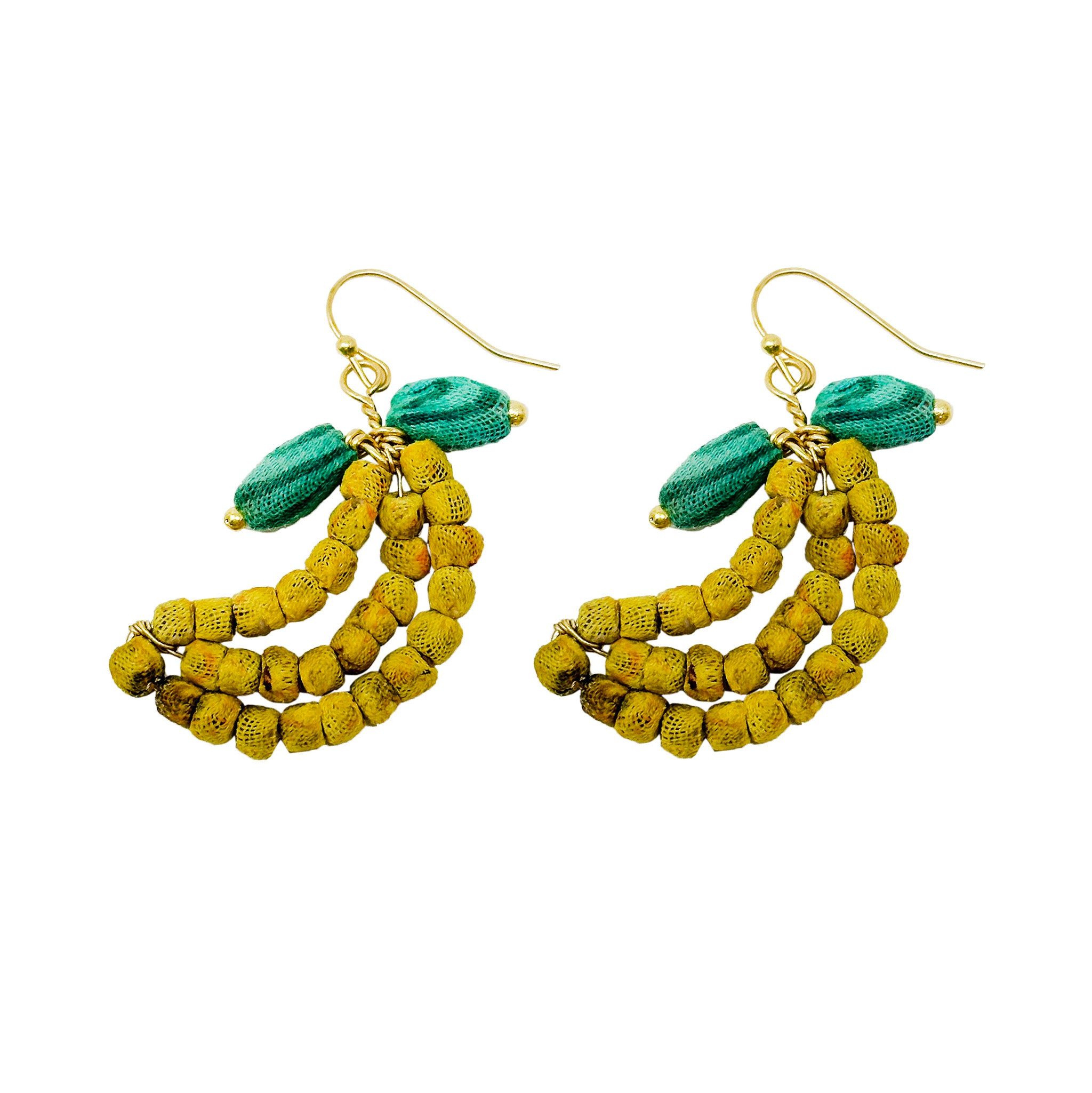 Teeny tiny Kantha fabric beads in yellow have been crafted into tropical bananas that hang from a green stem. A great conversation piece, and perfect to wear while visiting or dreaming of tropical destinations! They're thoughtfully created from repurposed Kantha & Sari textiles that have been hand-sorted, so each piece is slightly different.