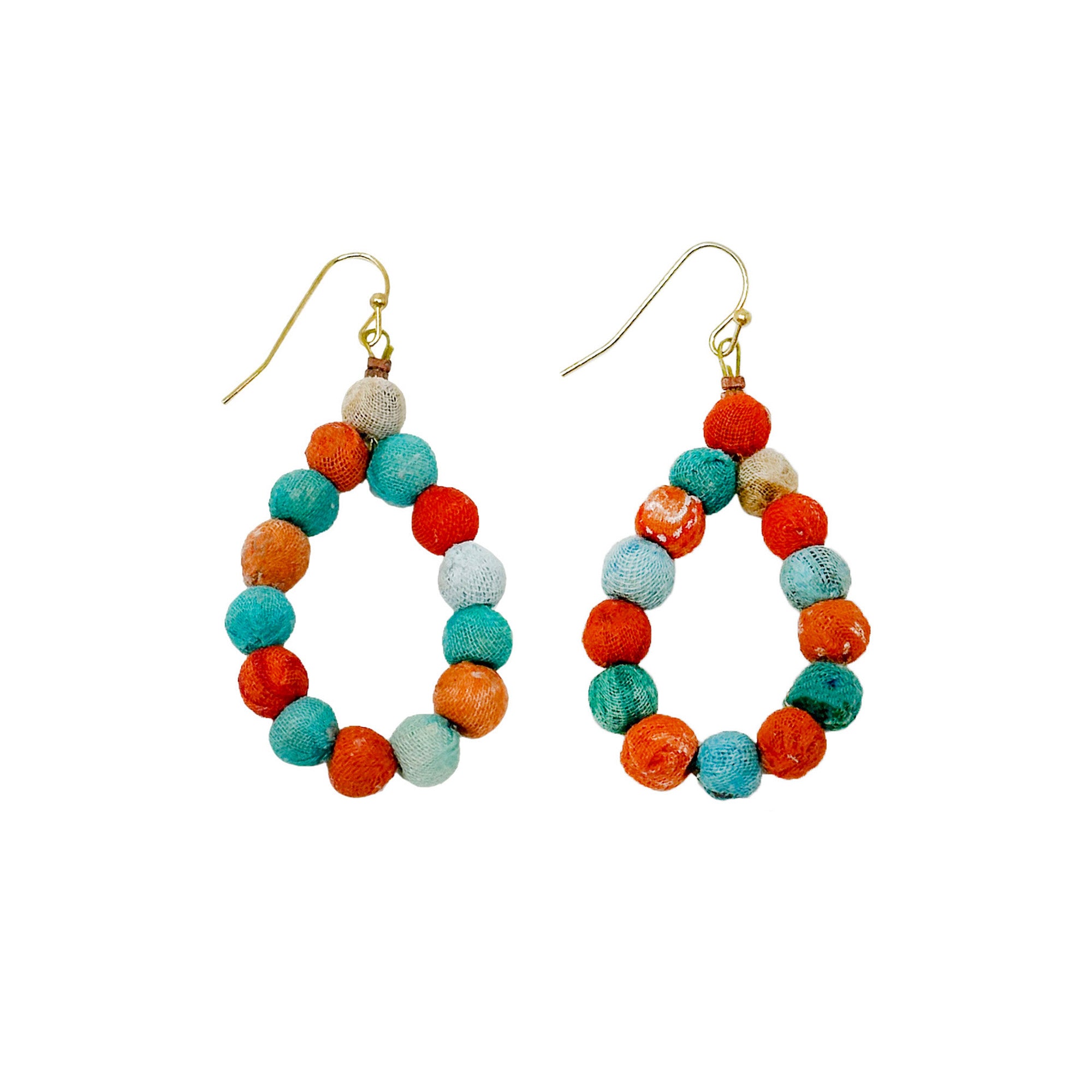 A simple teardrop of colorized Kantha beads forms the Kantha Capri Teardrop Earrings. They are thoughtfully crafted from reclaimed Kantha & Sari textiles that have been hand-sorted, so each piece is slightly different.