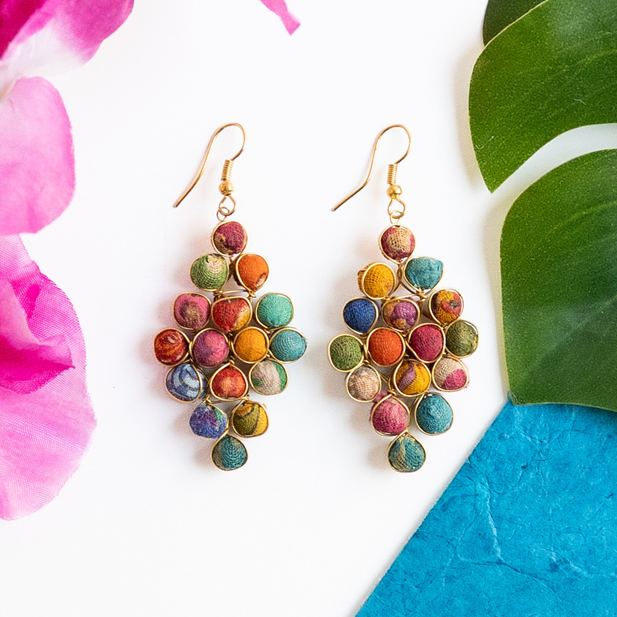 These dazzling diamond-shaped earrings are the perfect statement-makers. A metal wire securely frames the vibrant upcycled Kantha beads. Each pair has its own unique patterns and colors.