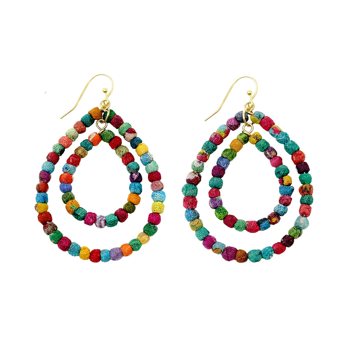 Two teardrop-shapes of our tiniest Kantha beads nestle within each other and dangle for lots of movement. The vibrant beads that create this unique chandelier style measure just 1/8” wide. Crafted from repurposed Sari and Kantha fabric, each is one-of-a-kind and colors will vary.