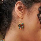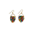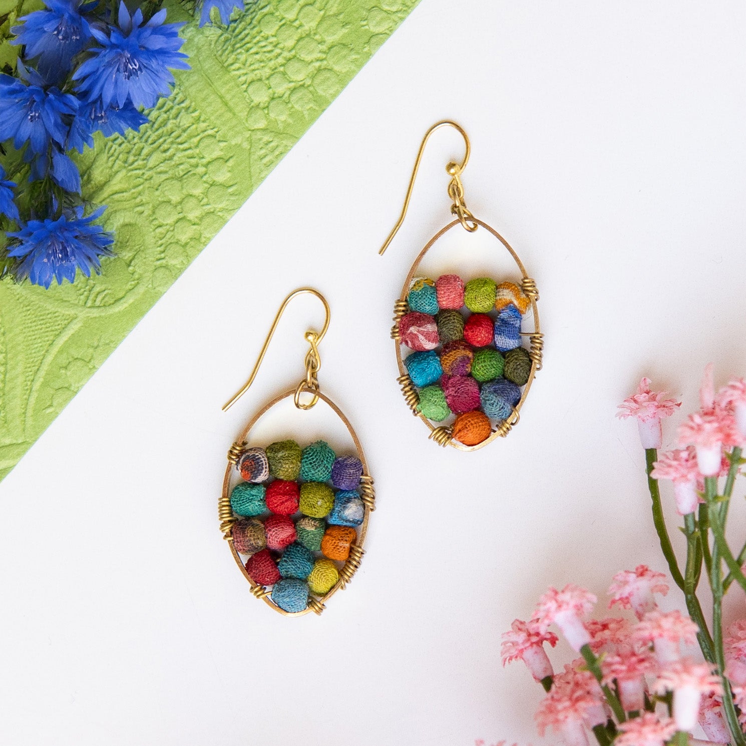 A collection of teeny tiny colorful Kantha beads gather inside these delicate oval-shaped earrings. A flattened brass frame and tiny gold wires hold them securely in place. This beautiful style has a great mix of color, texture, and shimmer, and looks great with statement and delicate necklaces.