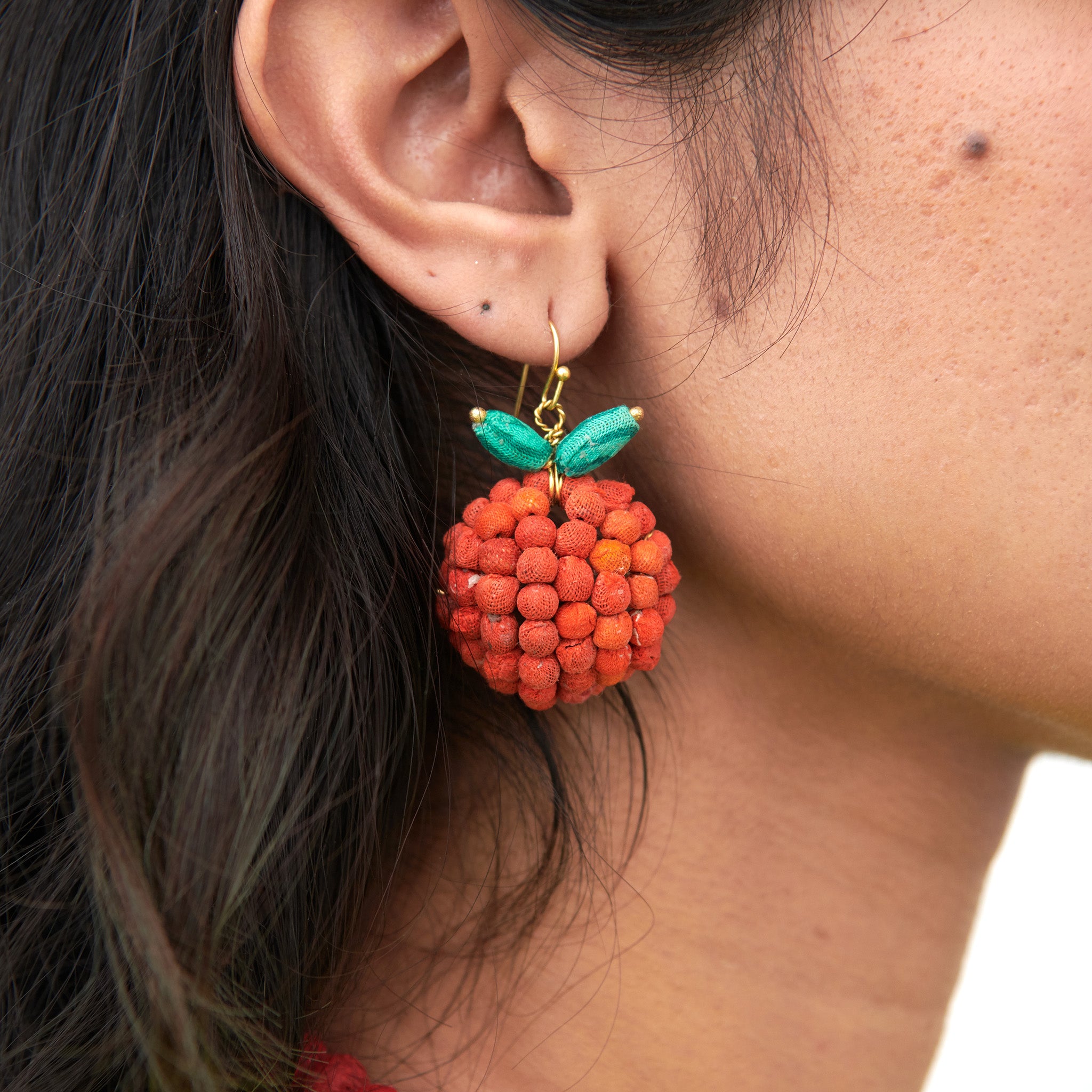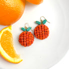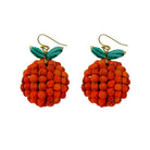 Crafted from super small Kantha fabric beads in bright orange that have been formed into a dimensional, rounded orange. Each pair is accented with with green leaves on top. They're thoughtfully created from repurposed Kantha & Sari textiles that have been hand-sorted, so each piece is slightly different.