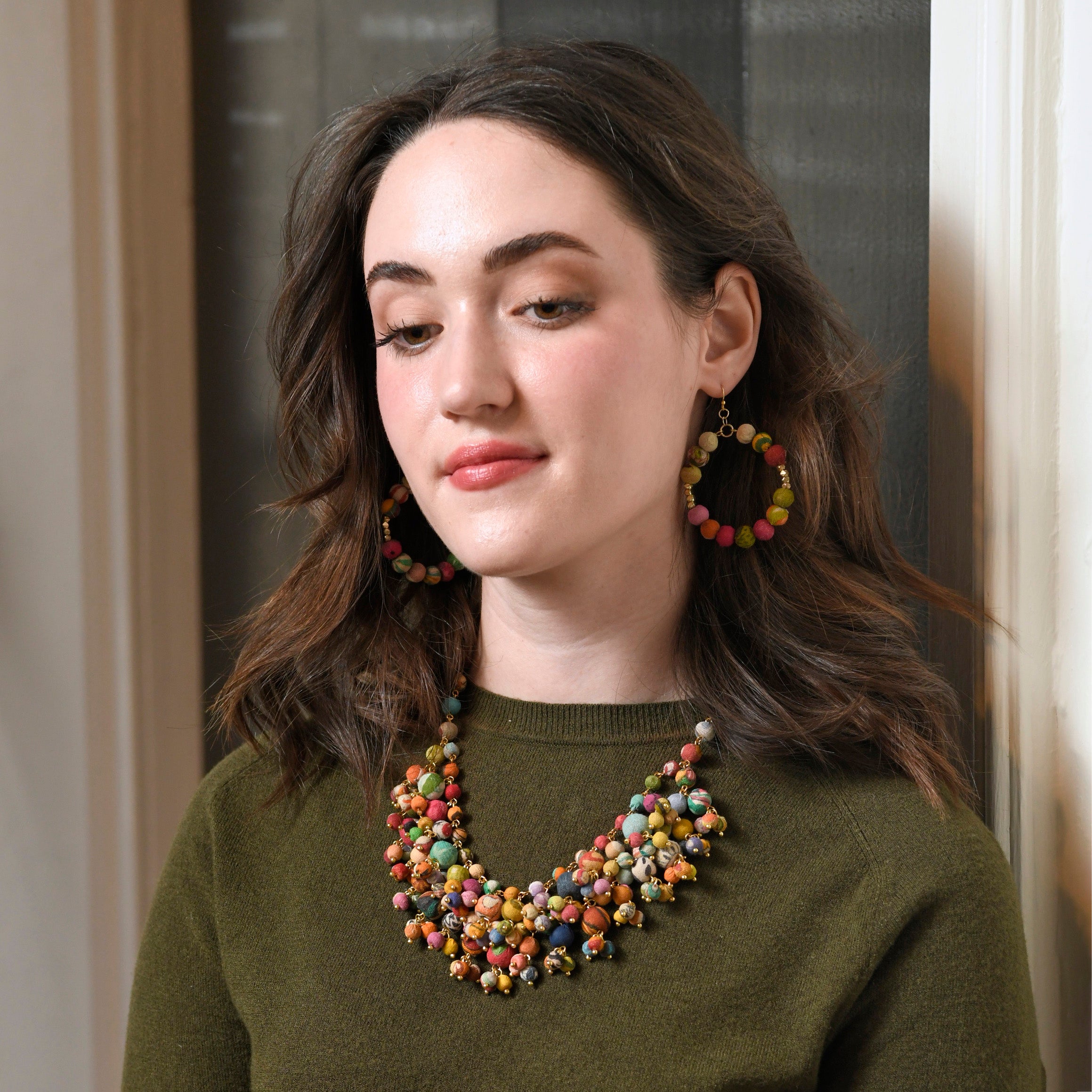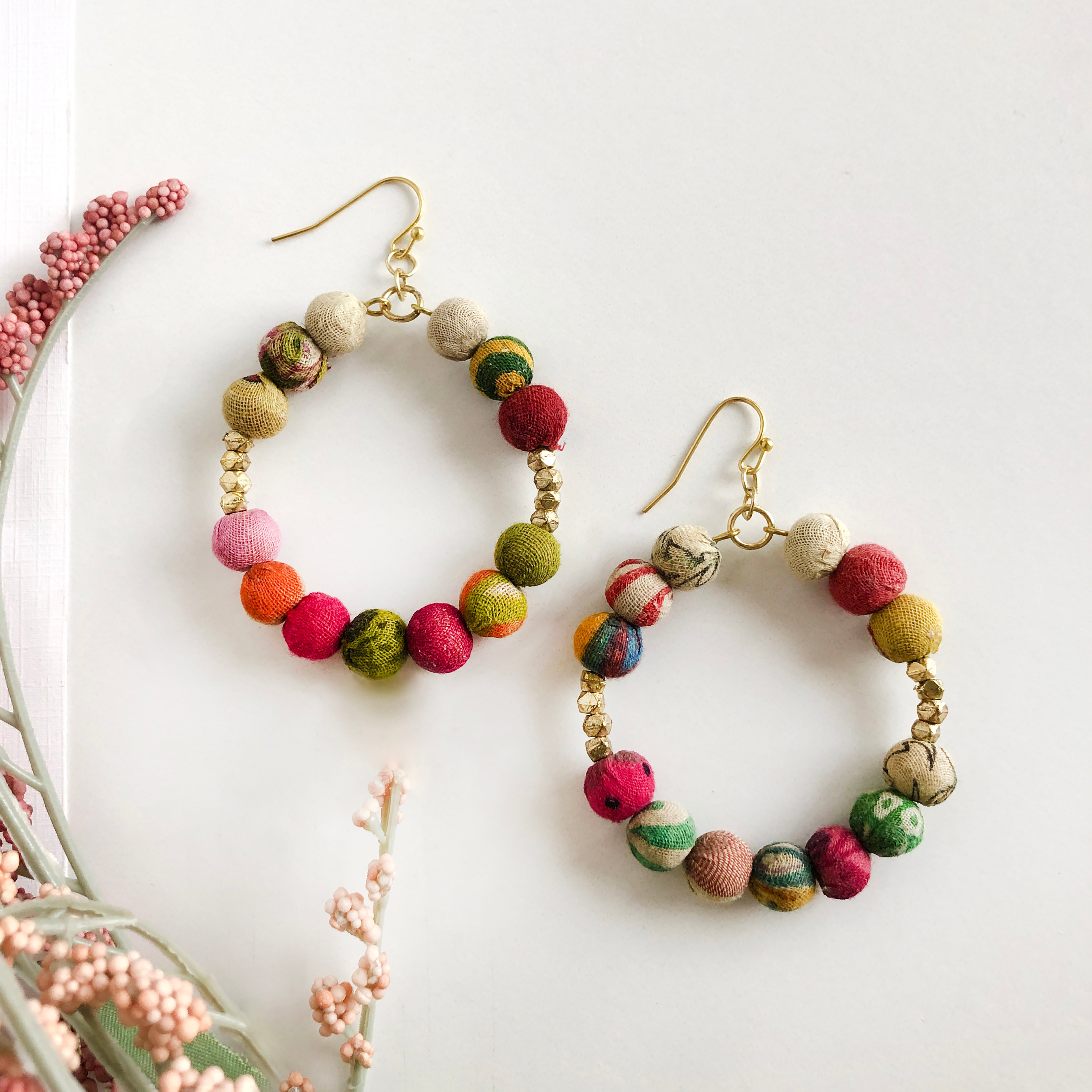 Colorful and shimmering, matte gold seed beads elevate these colorful Kantha hoops to a new level of sophistication. Finished with nickel and lead-free ear wires. Handmade from recycled Kantha textiles, so colors and patterns will vary.
