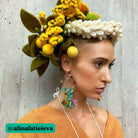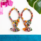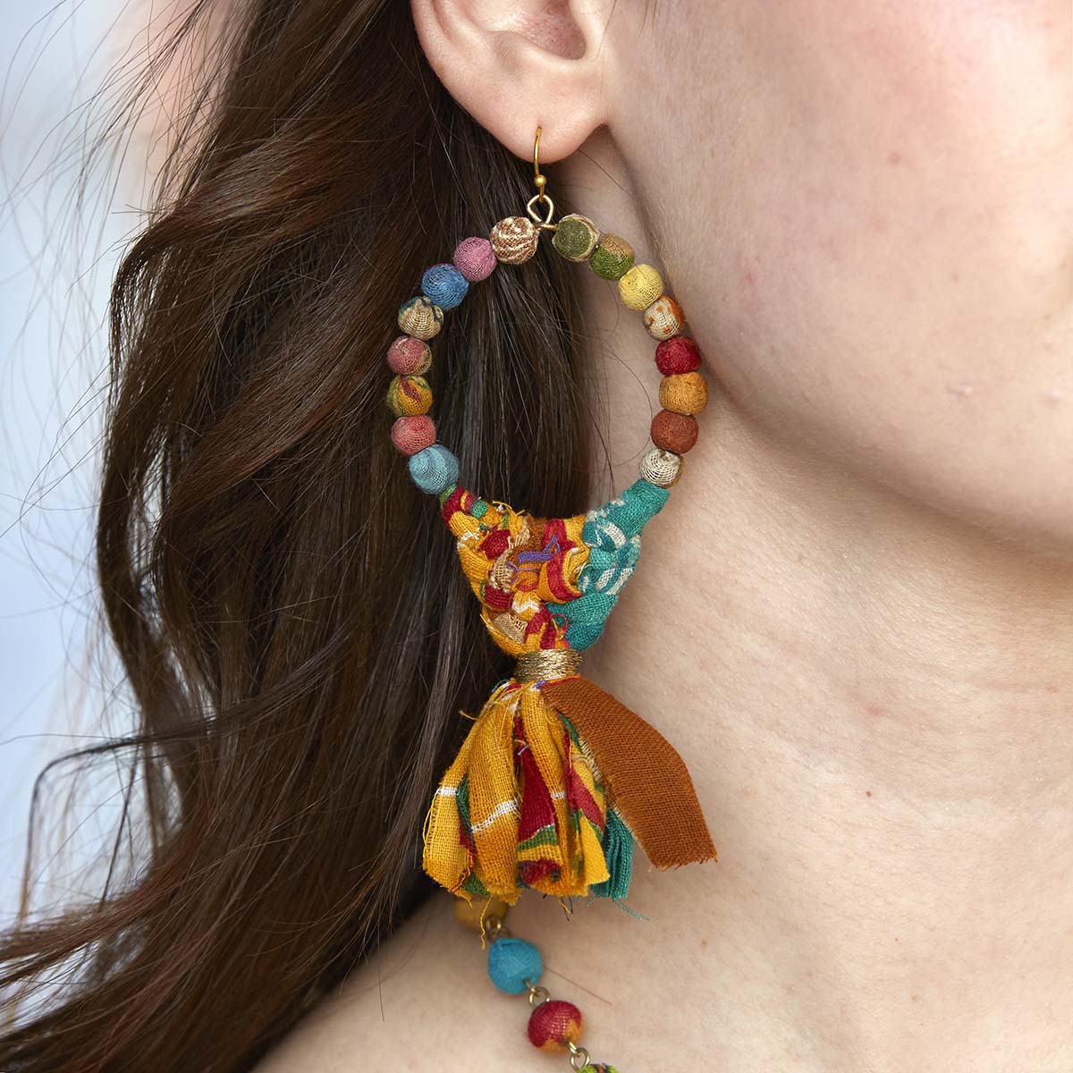 This statement style combines three textures of Kantha fabric: a multicolor Kantha bead hoop, a woven V of Kantha textile strips, and a metallic thread-cinched fan of Kantha fringe.