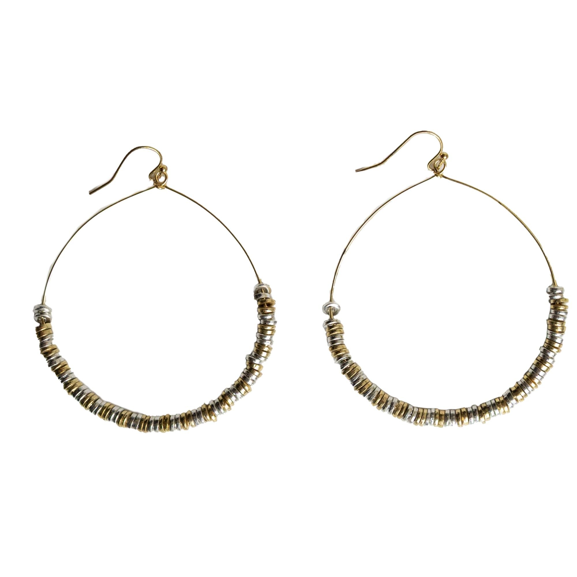 A haphazard mix of gold and silver paillette disc beads form the center of these hoop earrings. Truly a wear-with-everything style! Crafted from a brass metal mix.