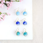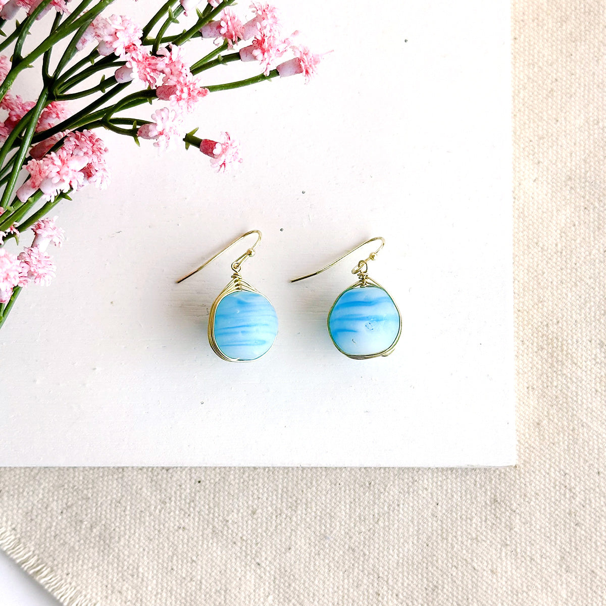 A single statement bead in a gorgeous shade of blue is crafted from recycled glass and hand-wrapped with brass metal wire. The beads have a marble-look and opaque, frosted texture. Finished with lead-free and nickel-free French earring wires.