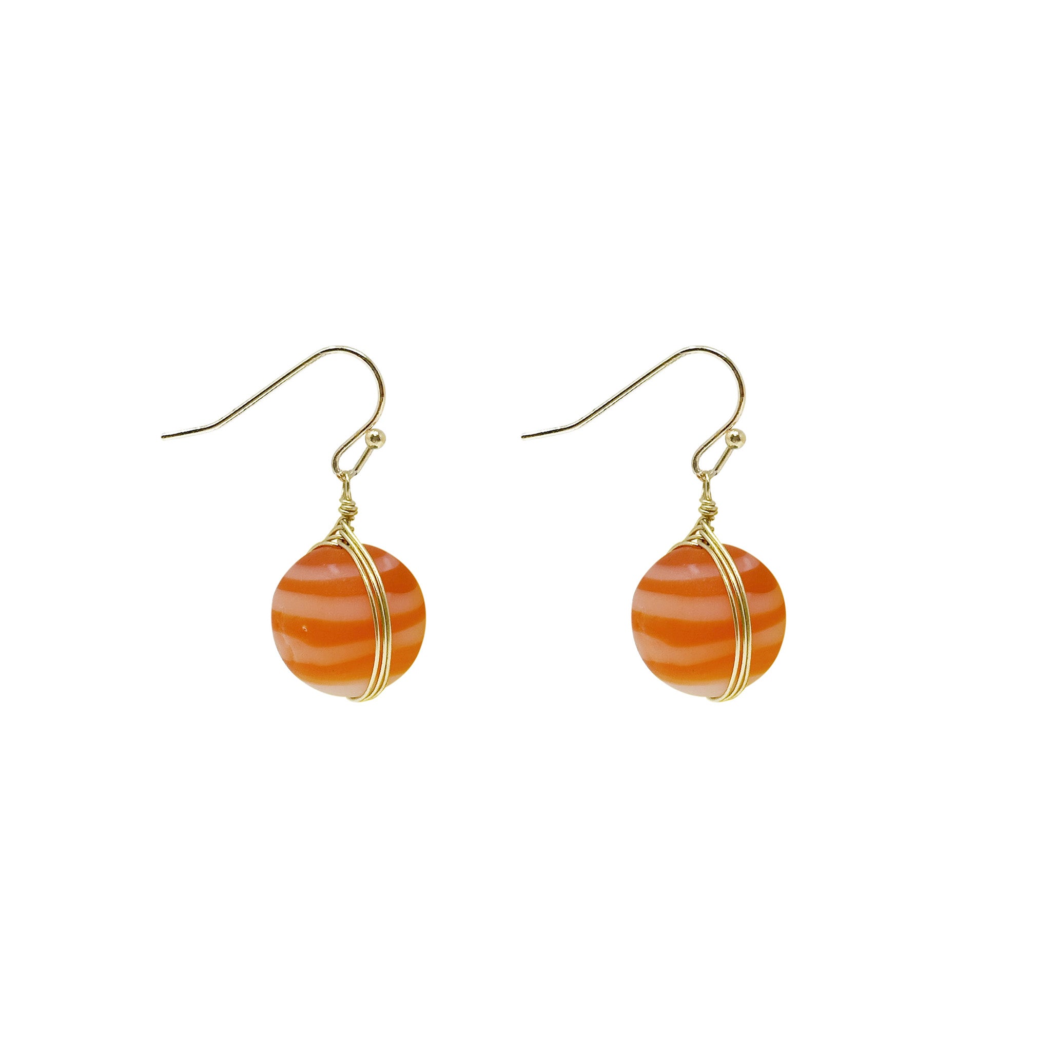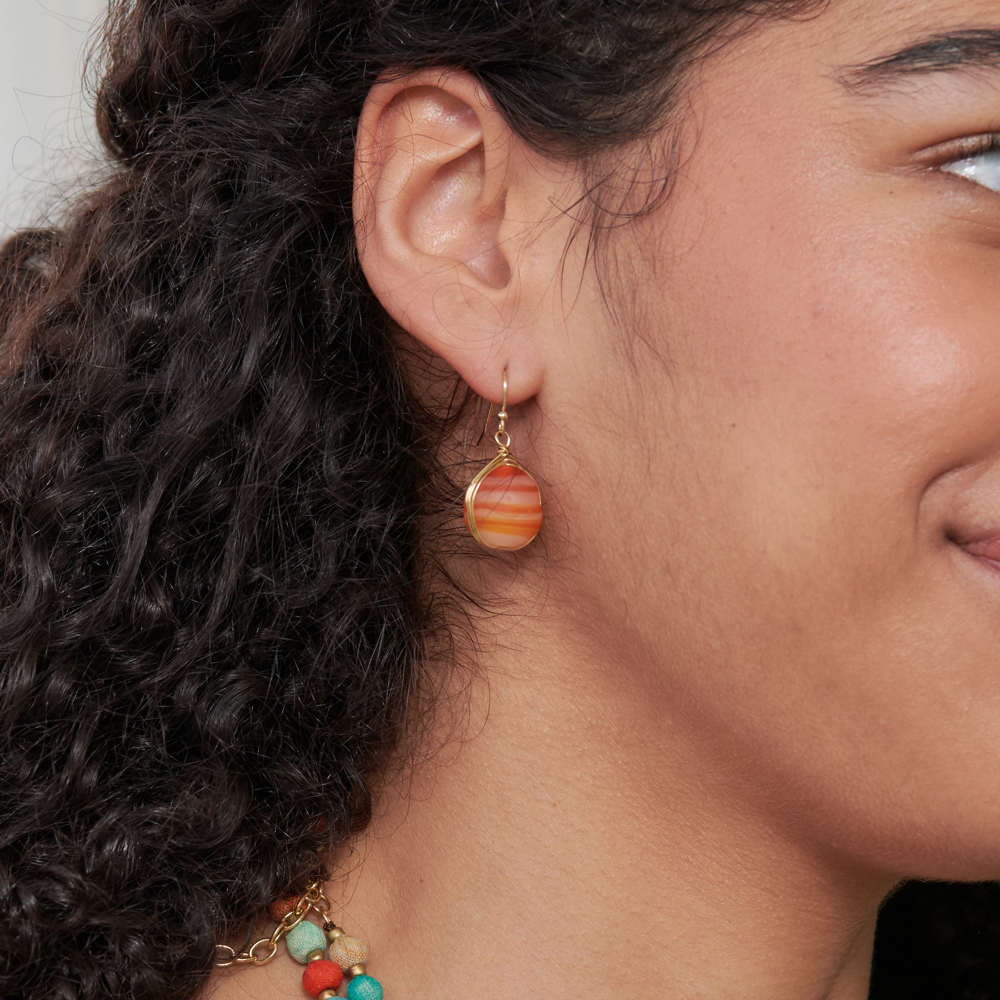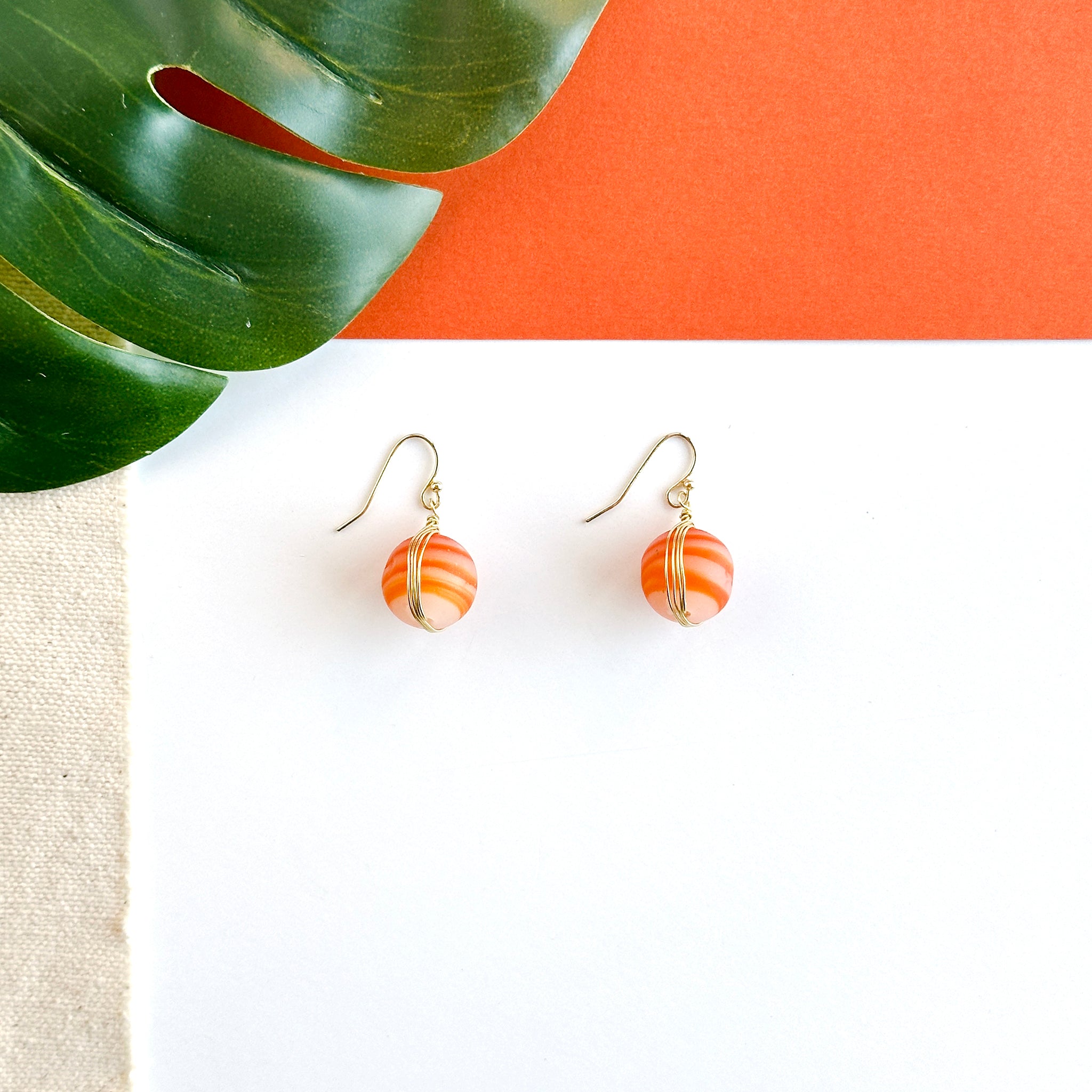 A single statement bead in a gorgeous shade of coral is crafted from recycled glass and hand-wrapped with brass metal wire. The beads have a marble-look and opaque, frosted texture.