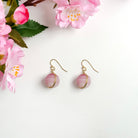 A single statement bead in a gorgeous shade of rose is crafted from recycled glass and hand-wrapped with brass metal wire. The beads have a marble-look and opaque, frosted texture.