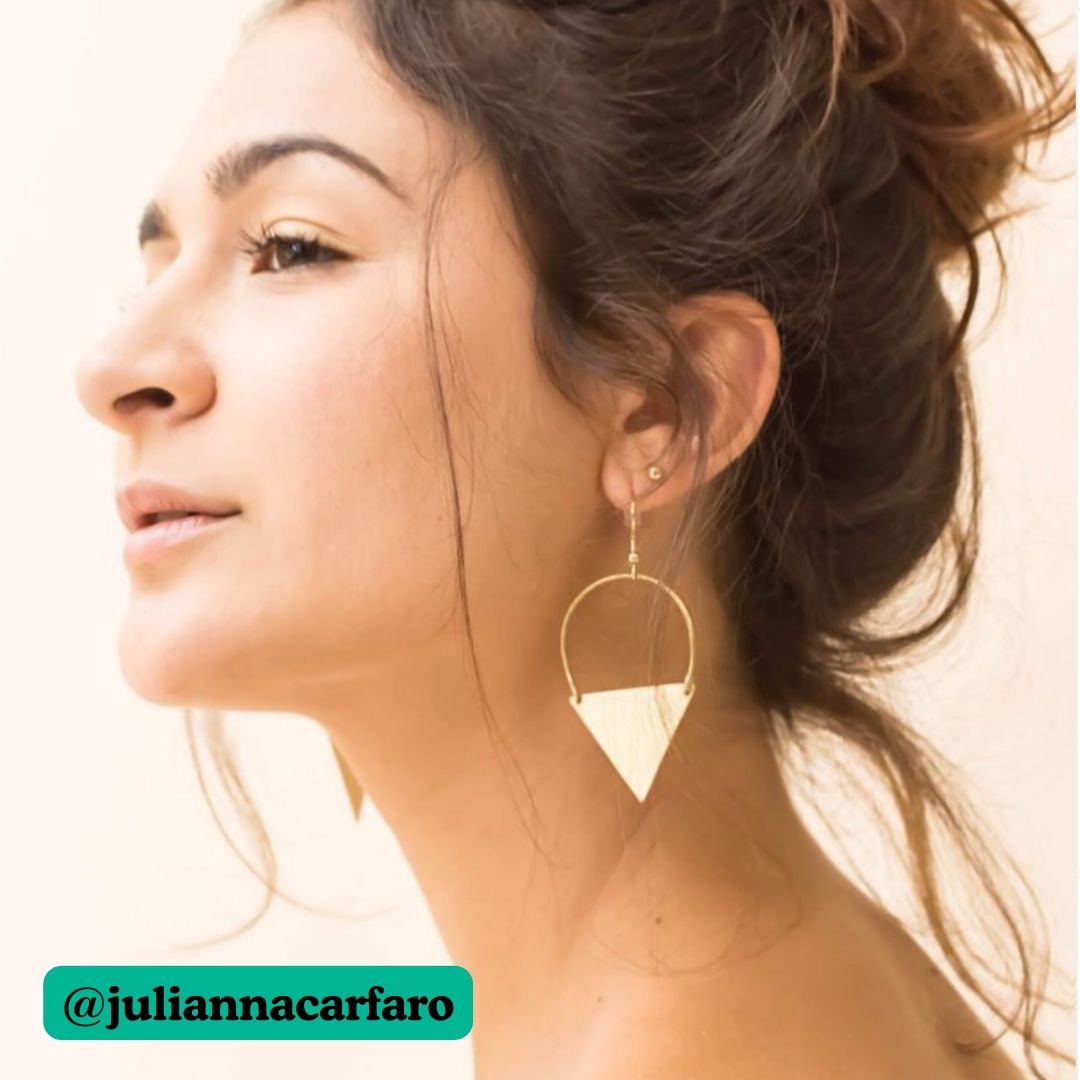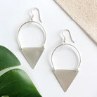 An open circle attaches to the ends of a matte metallic triangle, forming a peaked hoop. Finished with nickel- and lead-free French ear wires.