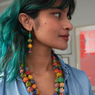 A linear arrangement of Kantha beads in oval, barrel and teardrop shapes dangle fluidly to form this unique style. Crafted from repurposed Sari and Kantha fabric, each is one-of-a-kind and colors and patterns will vary. Finished with nickel-free and lead-free post earring backs.