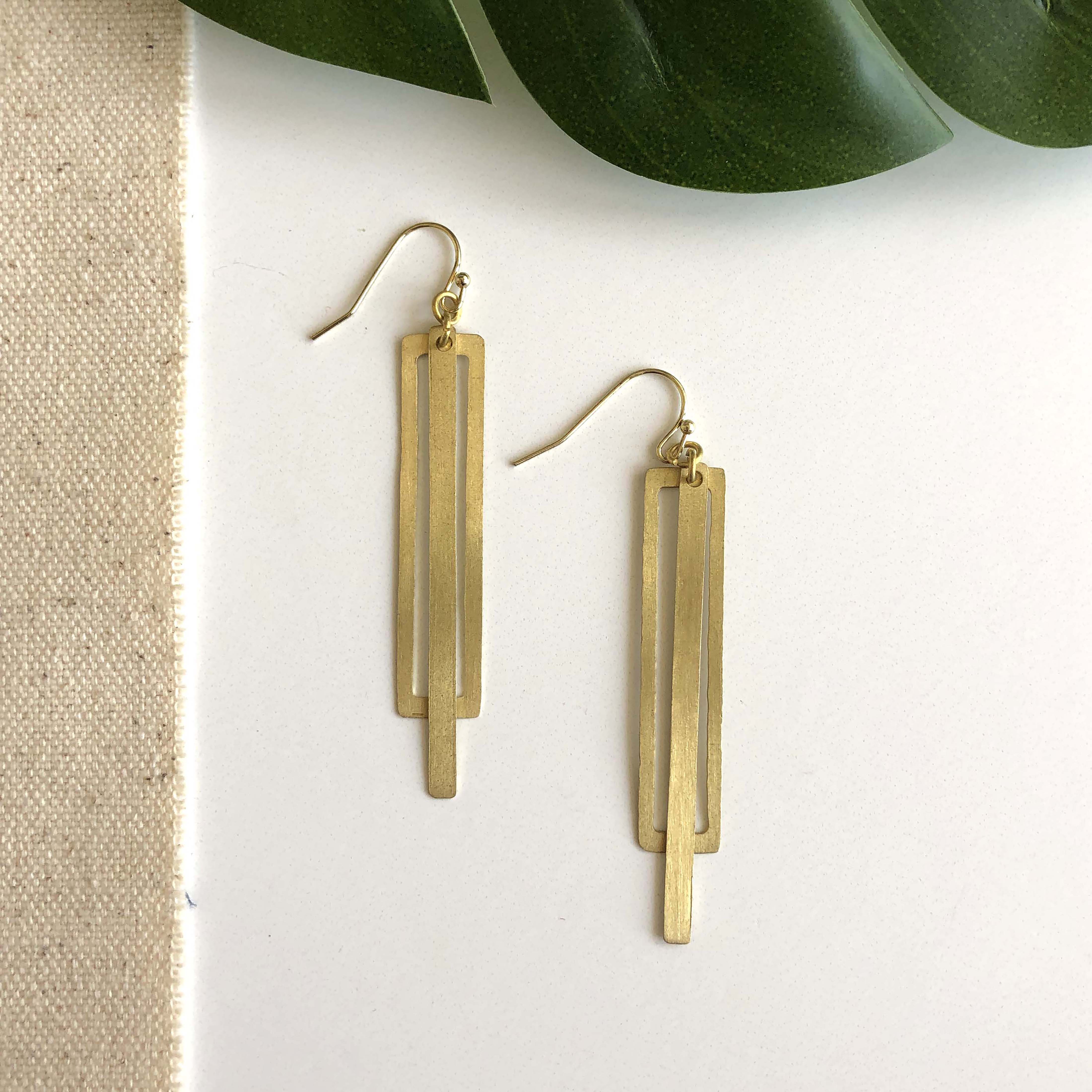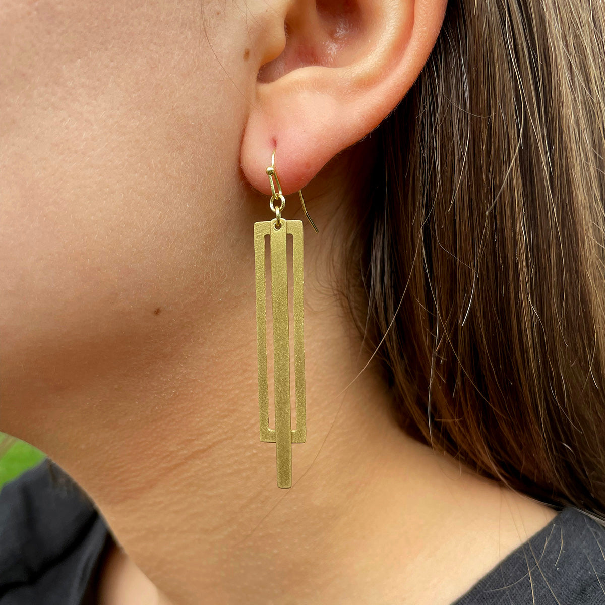 These handcrafted metallic earrings add an elegant flair to any look. An elongated matte gold rectangle and linear bar combine for this interesting silhouette. Finished with nickel- and lead-free French ear wires.