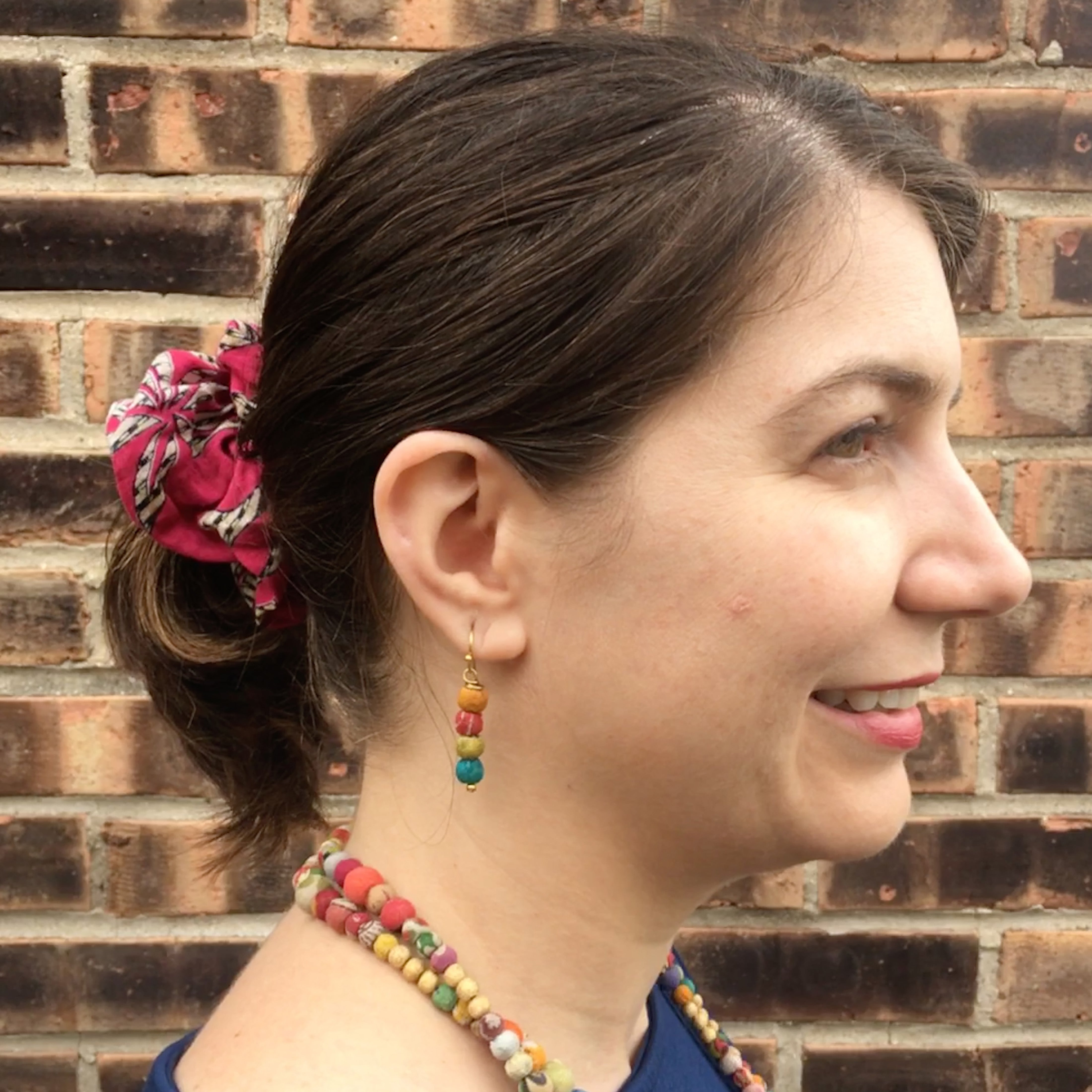Simple and understated, these earrings are a true wardrobe staple. Four repurposed Kantha beads are lined up for this delicate style. Each piece is made from recycled Kantha textiles, so colors and patterns are all one-of-a-kind and will vary. Finished with nickel and lead-free French ear wires.