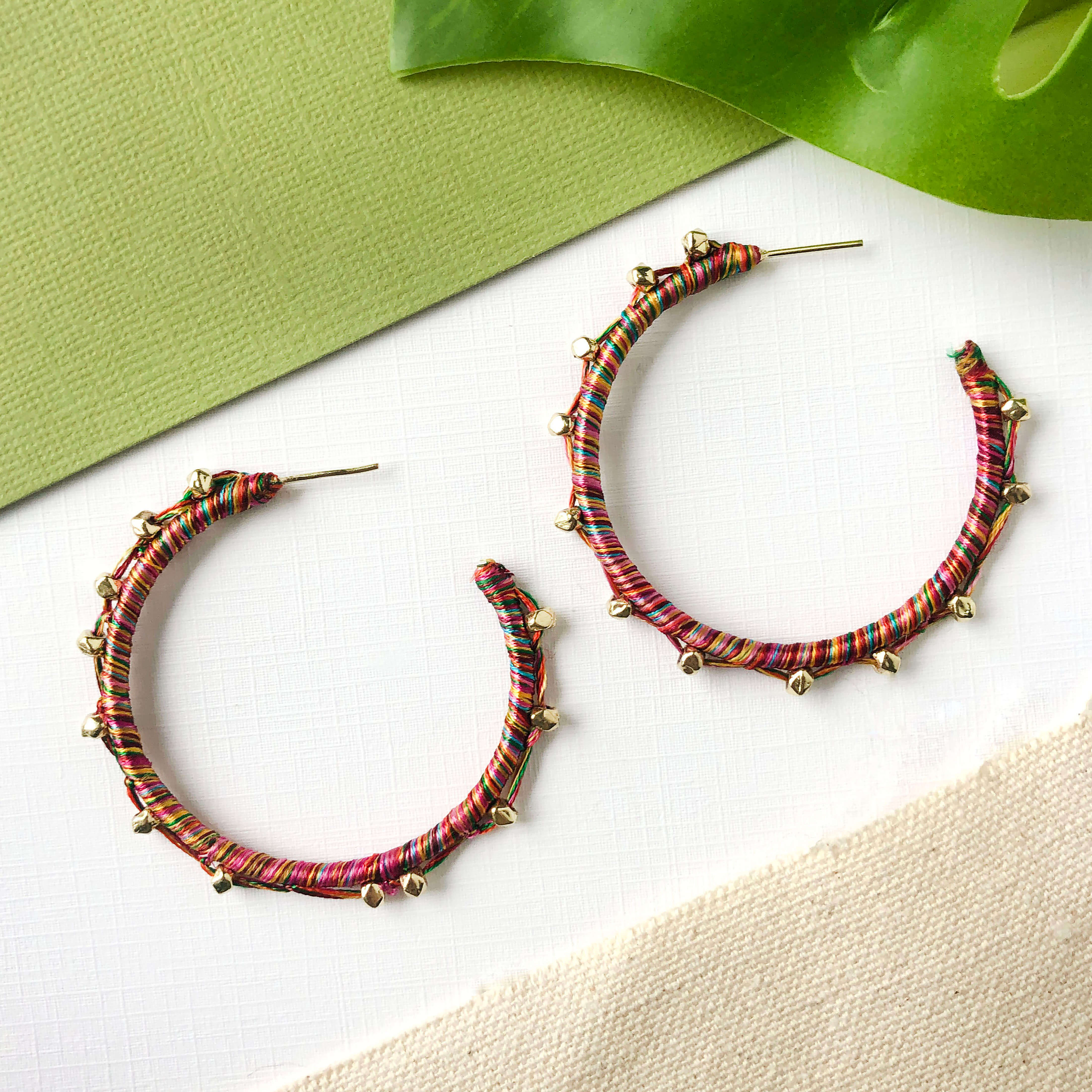 These textured hoops feature rainbow threads, wrapped and woven around a classic hoop shape, with dots of shimmering metallic gold accent beads. Part of our Raja Rainbow collection, this also looks great with any of our Kantha textile styles.