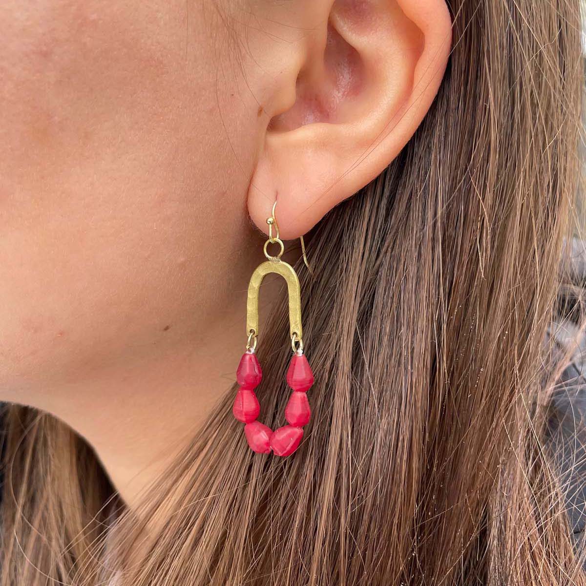 These stunning red Seascape Drop Earrings are handmade from recycled glass and have a frosted satin texture. Offering a modern twist on classic drop earrings, they feature a gold brass arc for extra sophistication. Finished with nickel and lead-free ear wires.