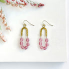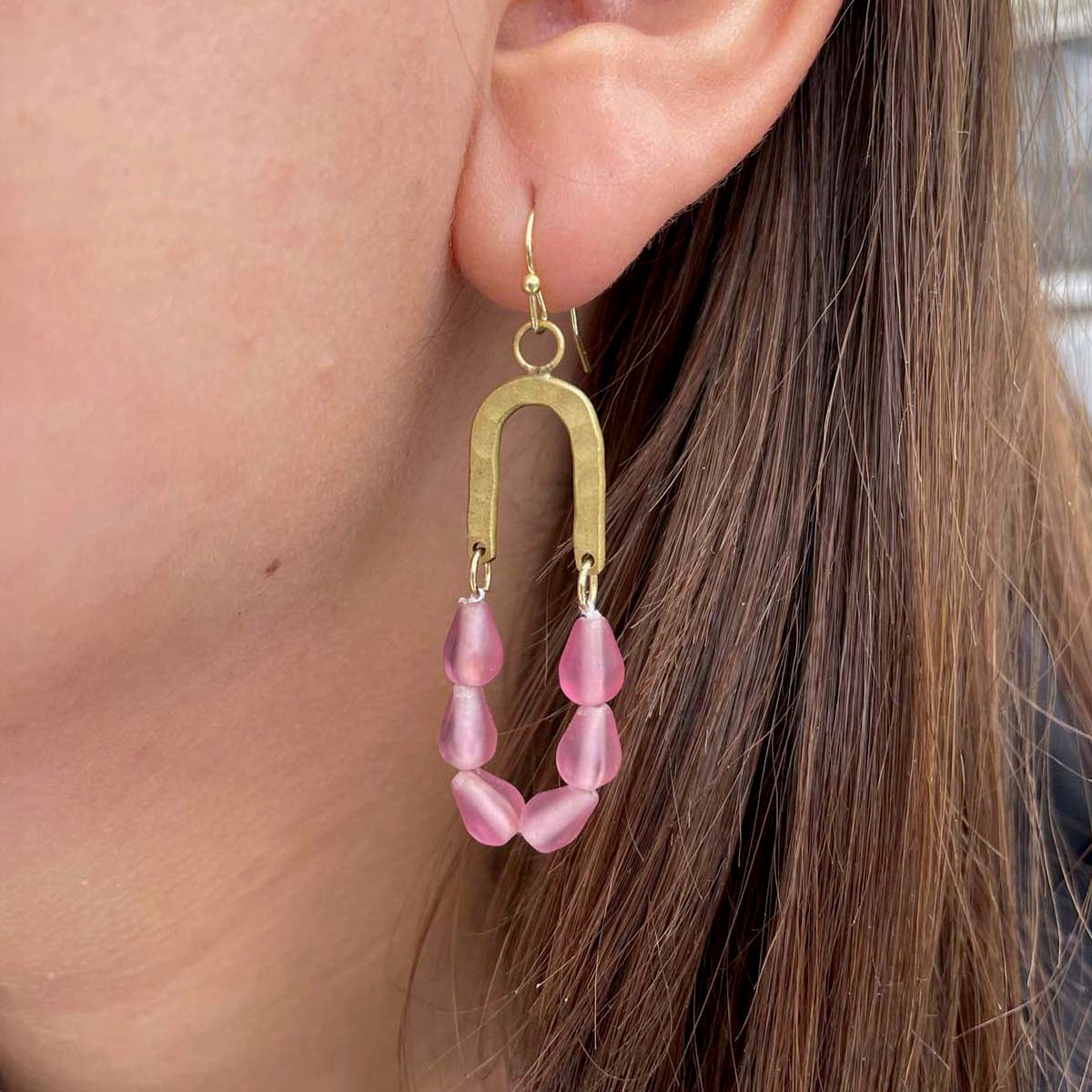 These stunning rose Seascape Drop Earrings are handmade from recycled glass and have a frosted satin texture. Offering a modern twist on classic drop earrings, they feature a gold brass arc for extra sophistication. Finished with nickel and lead-free ear wires.