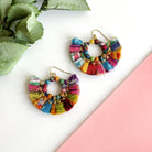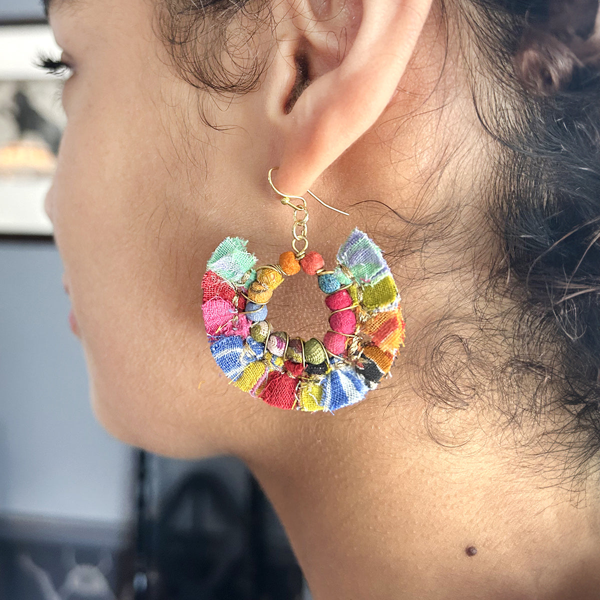 A small circle of 14 round Kantha beads is accented with a colorful fan of tasseled Kantha fringe for an incredibly statement-making look. Crafted from repurposed Sari and Kantha fabric, each is one-of-a-kind.