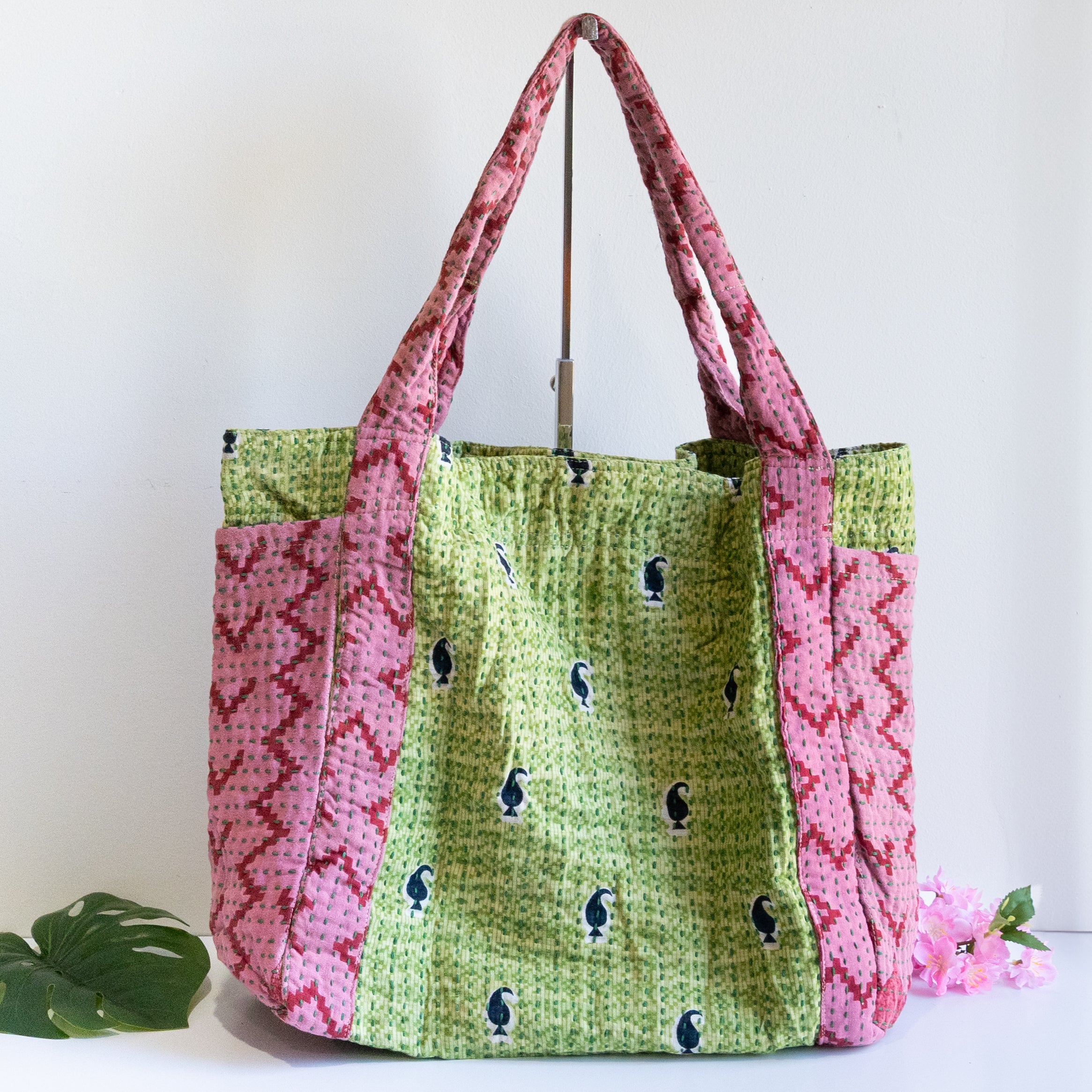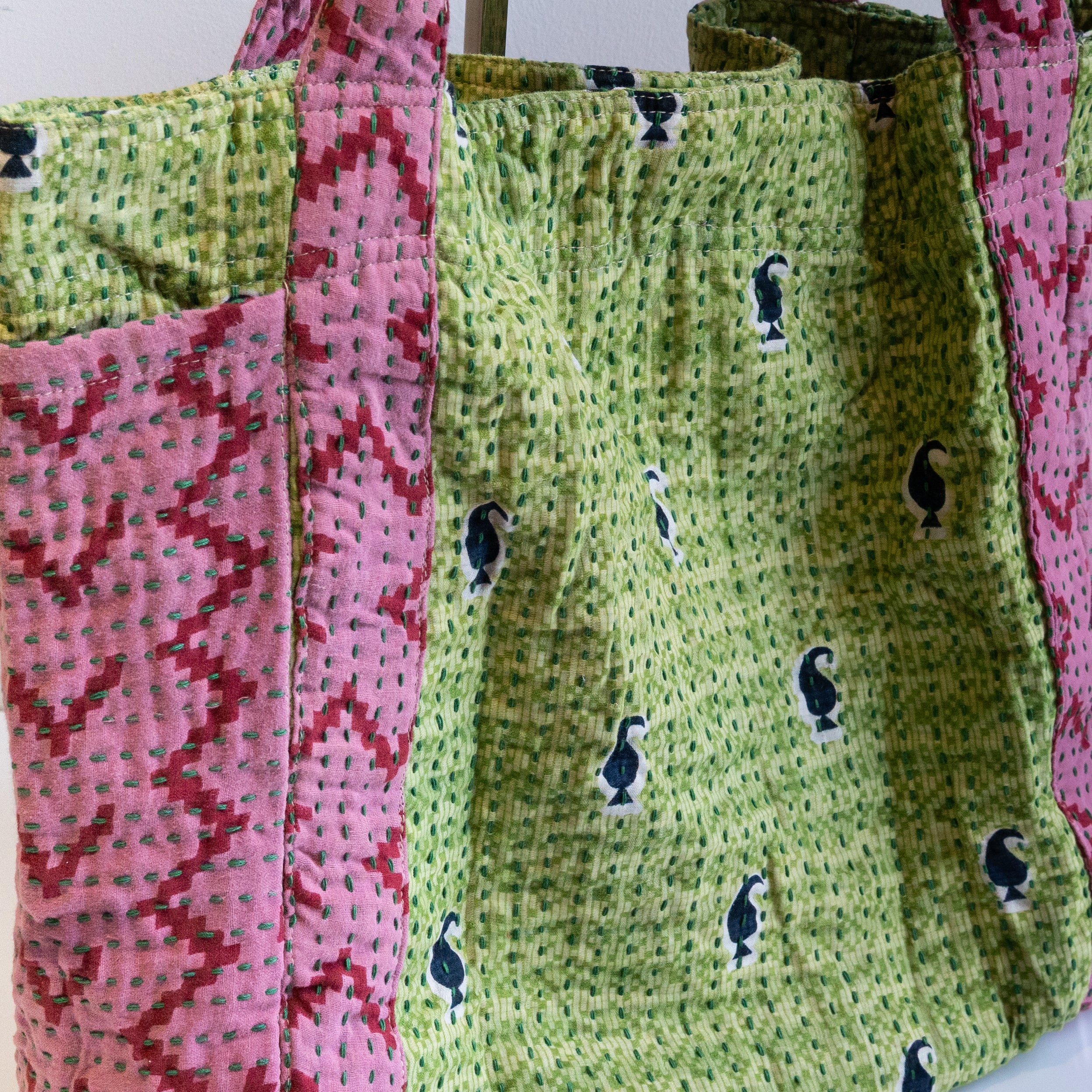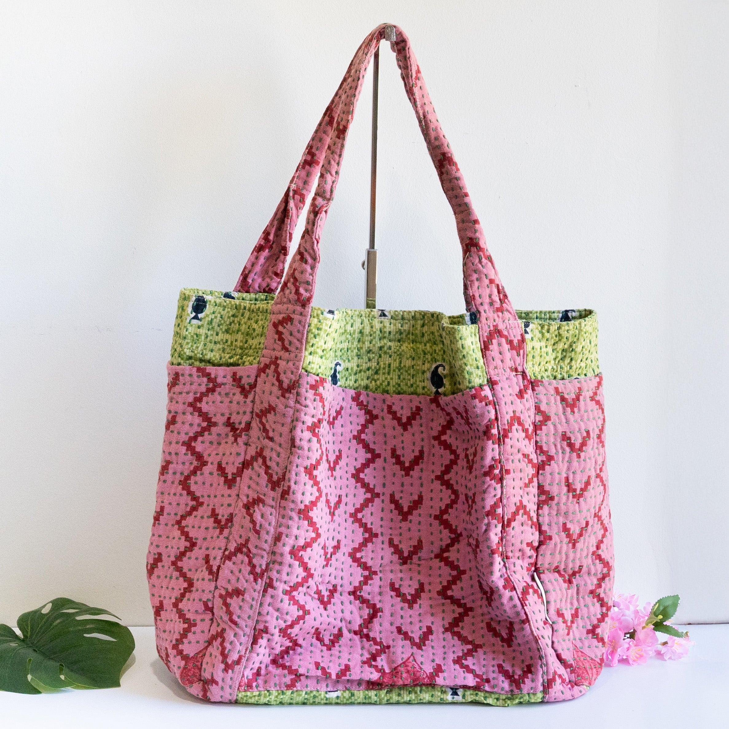 Crafted from upcycled Kantha quilts, each bag is completely one-of-a-kind and colors/patterns vary. Due to the upcycled nature, your item may have small patches in the fabric.