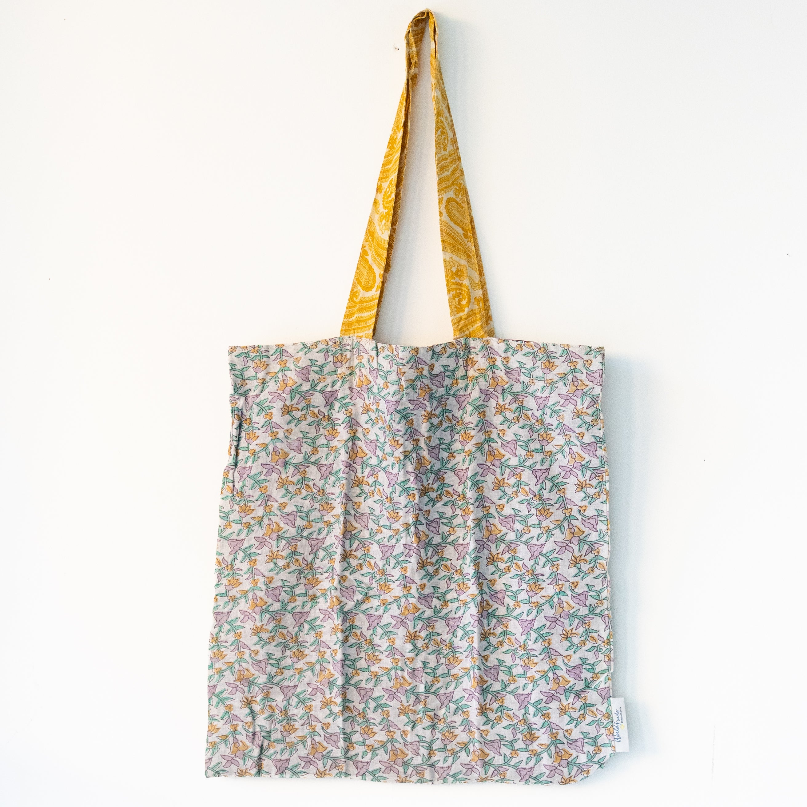 A sustainable take on the classic shopper tote, this colorful style is made from repurposed Sari textiles and features a fabric lining that makes it reversible. Colors and patterns are all one-of-a-kind. Made from 100% cotton.