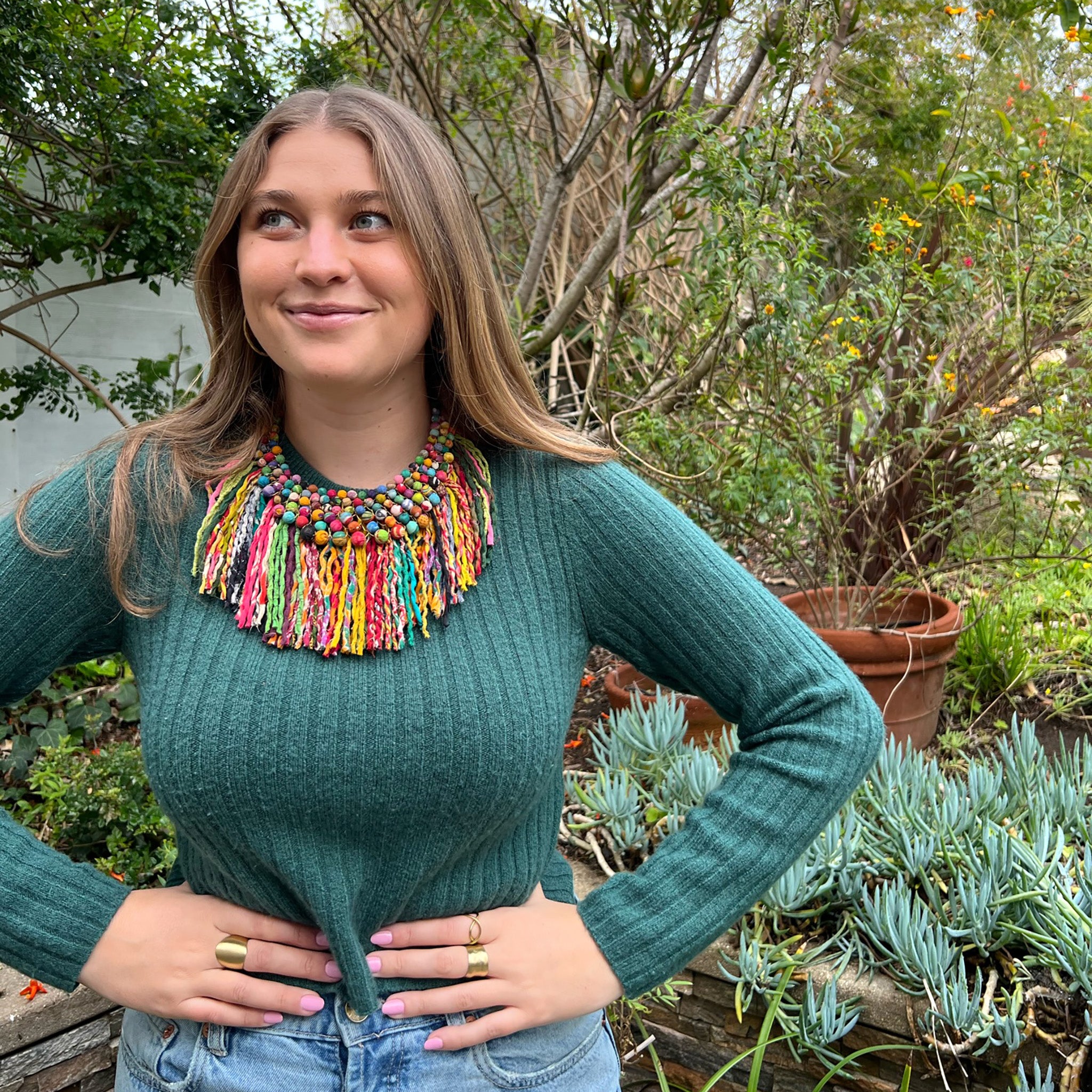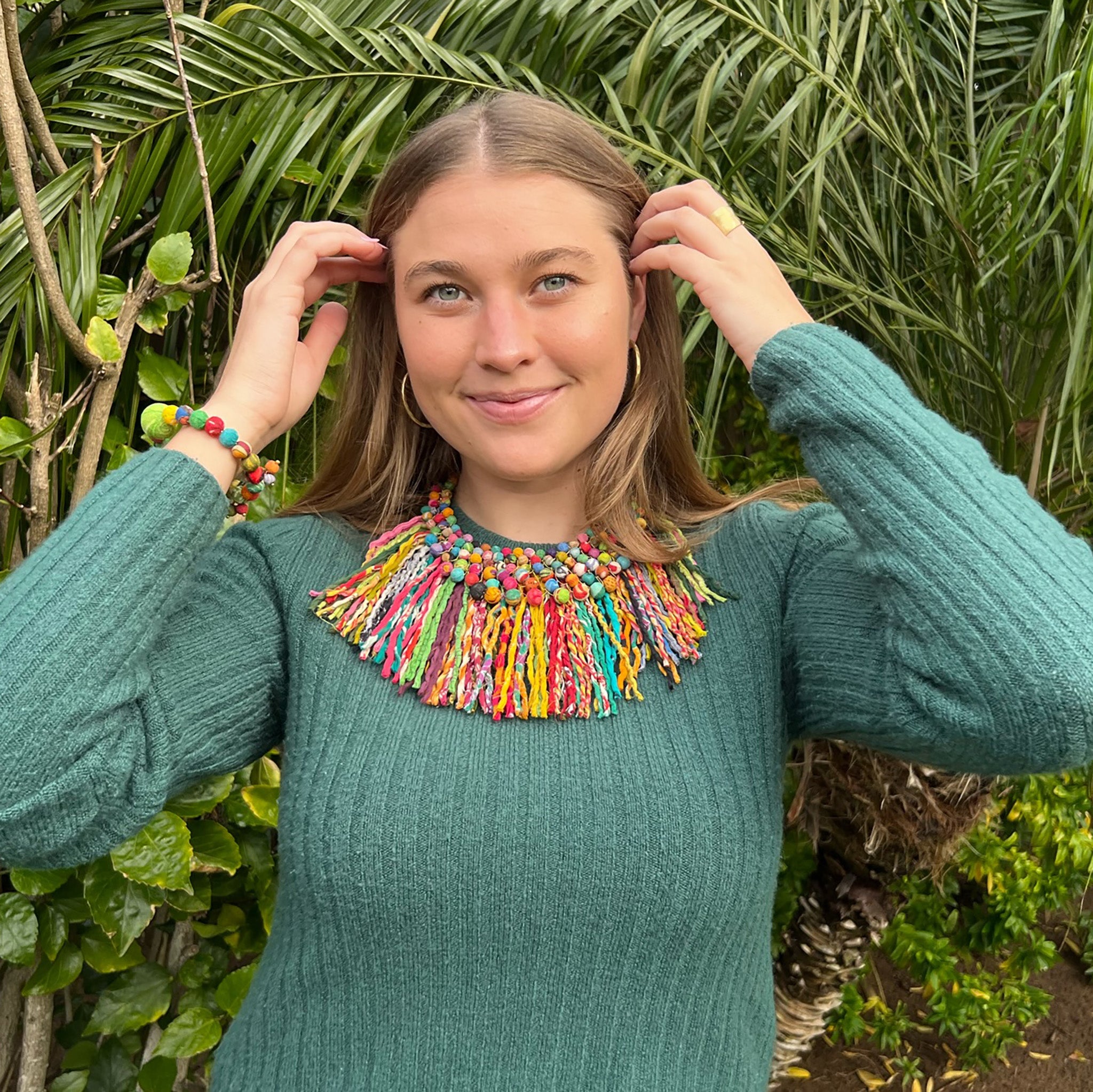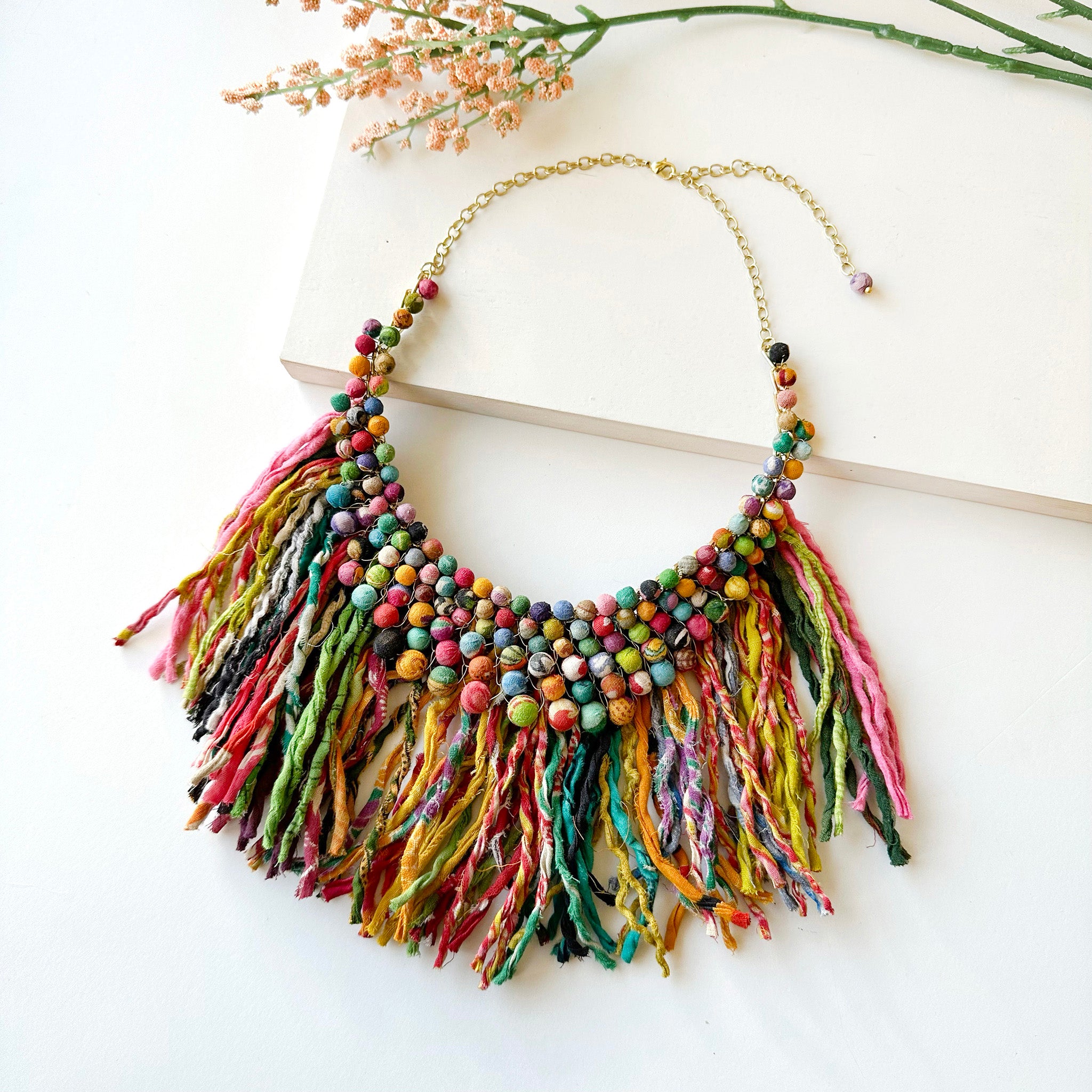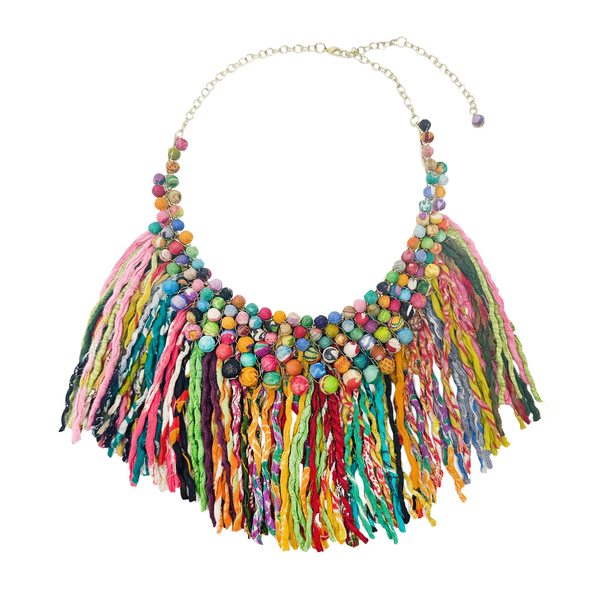 A statement piece like no other! The Kantha Pastiche Necklace features a fringe of curled Sari ribbons that hangs from a woven collar of colorful Kantha beads. The combination of textures gives it an incredibly unique look. Each piece is crafted from repurposed textiles, so colors and patterns will vary.