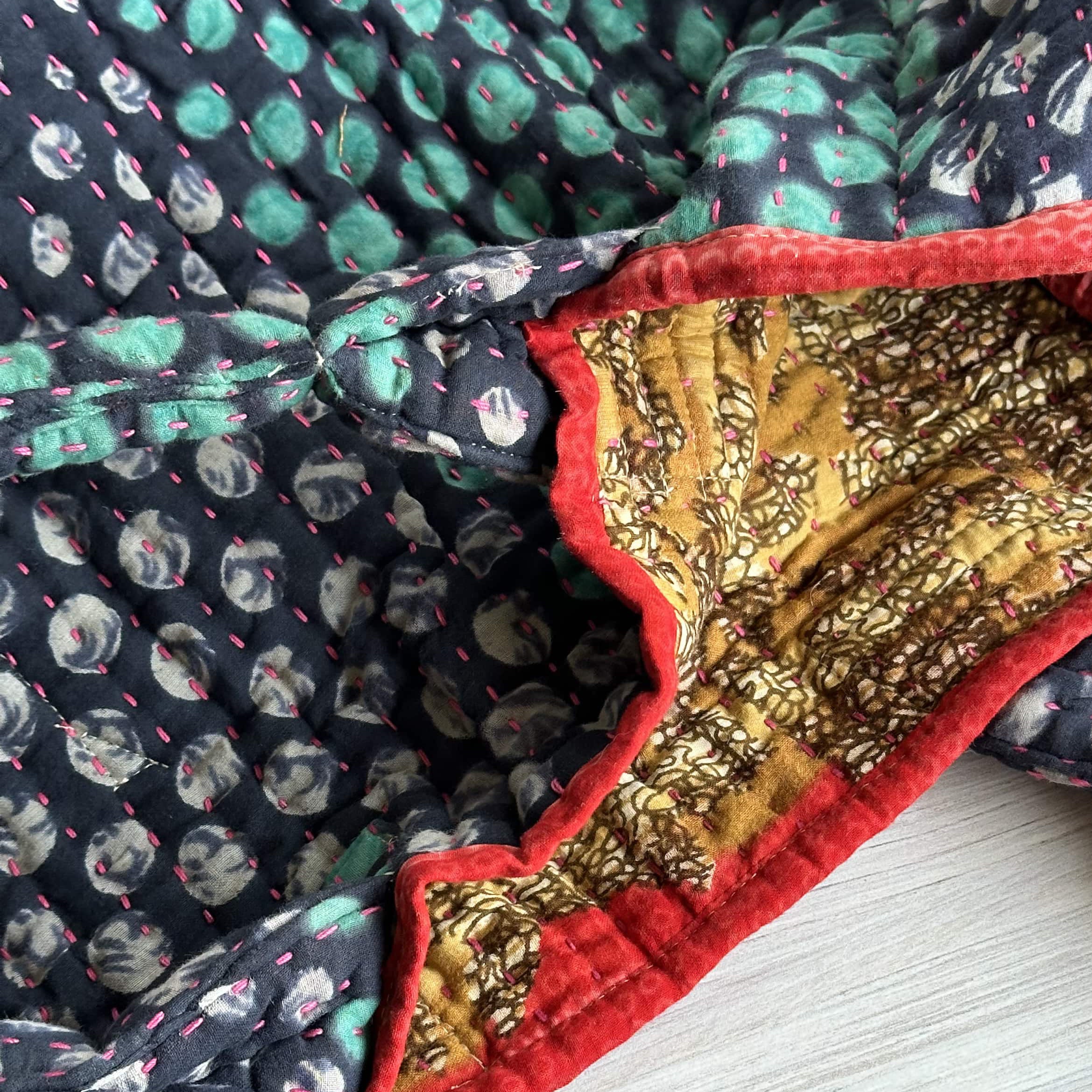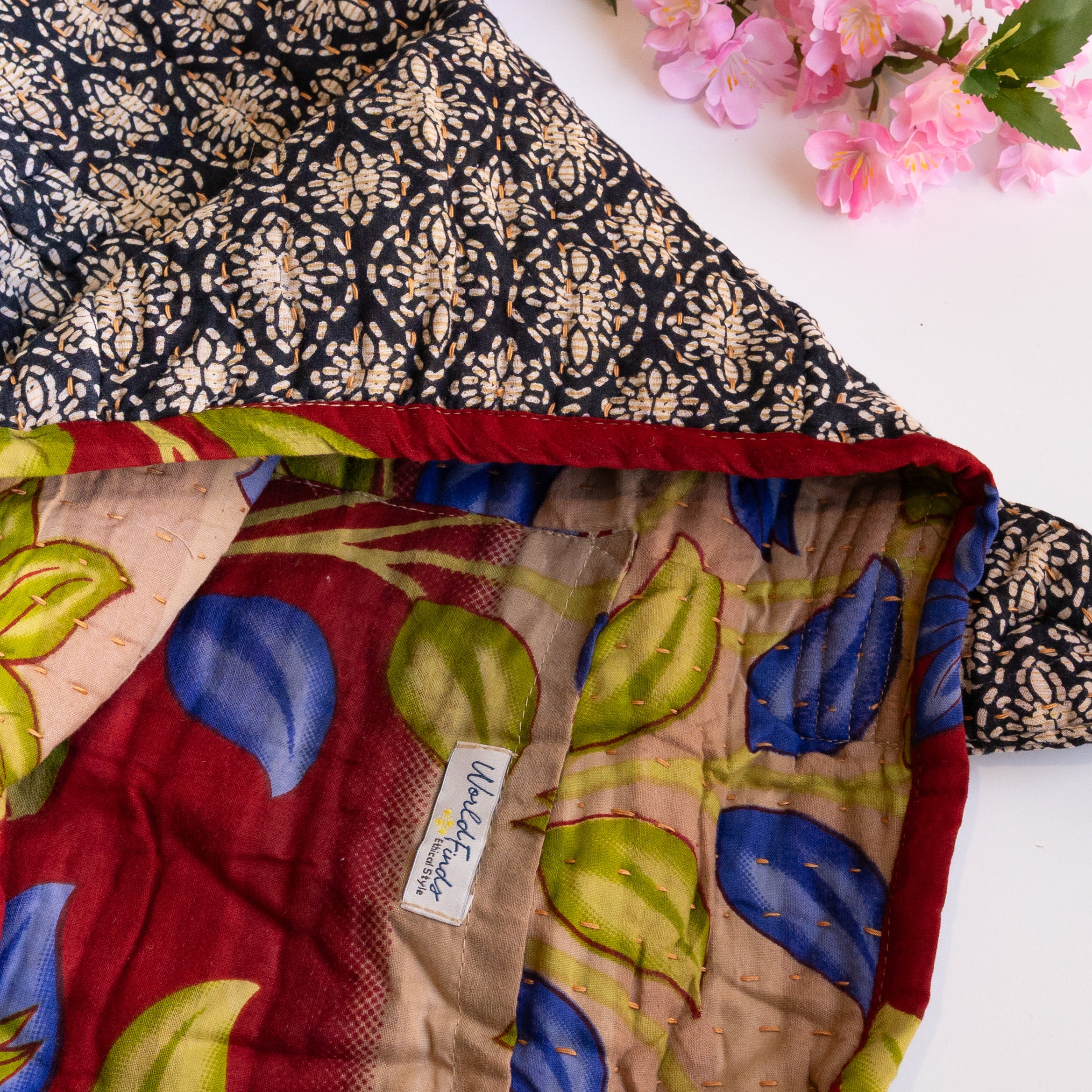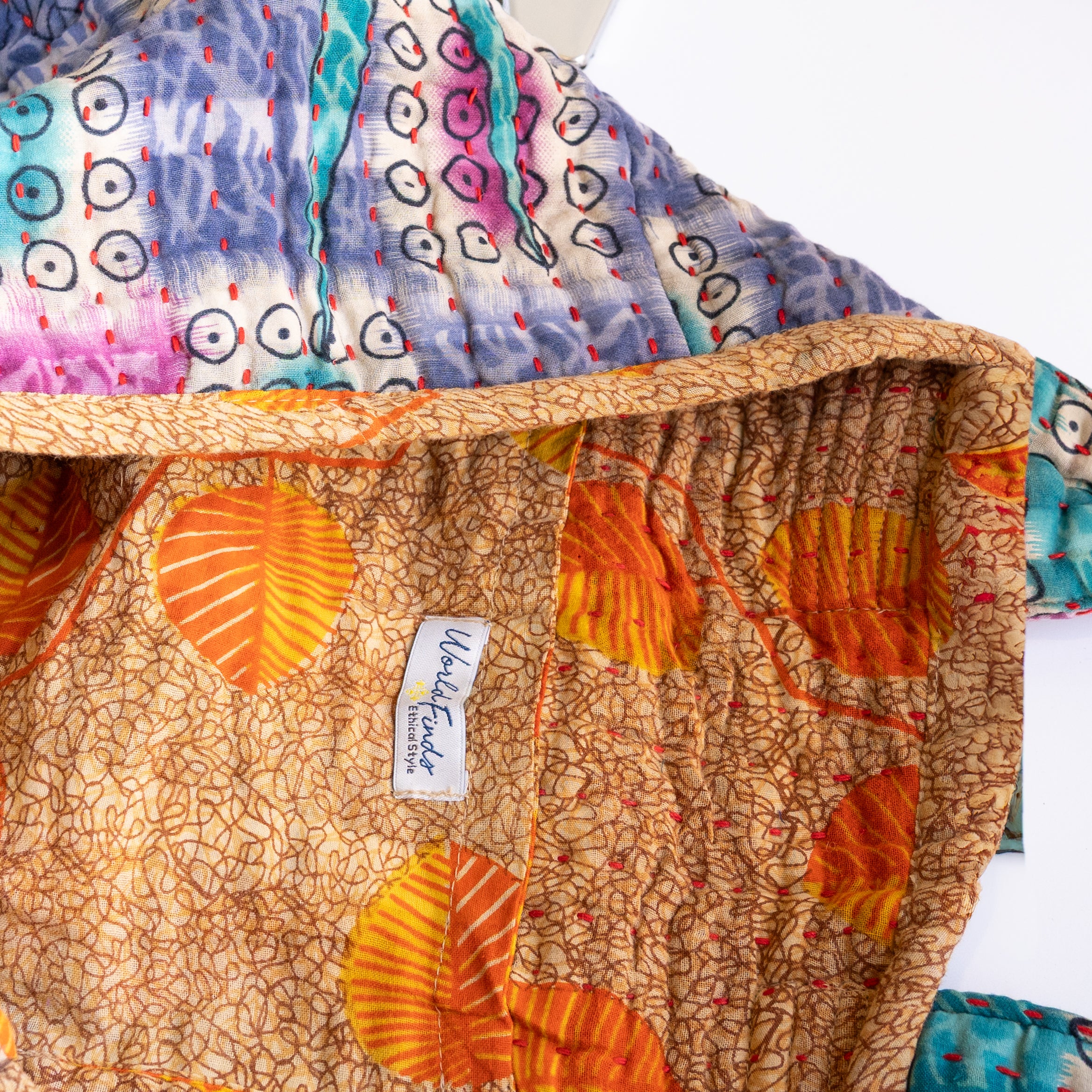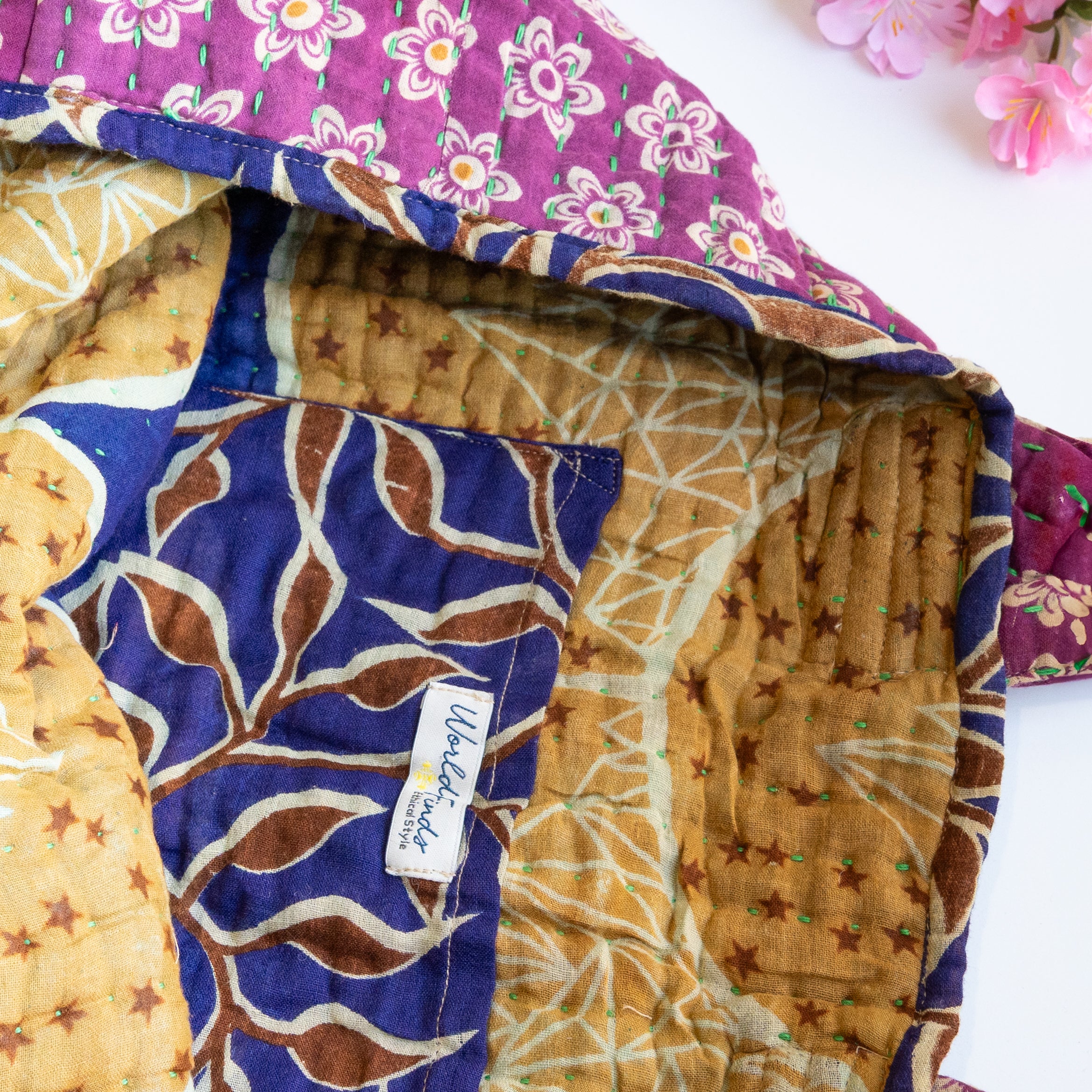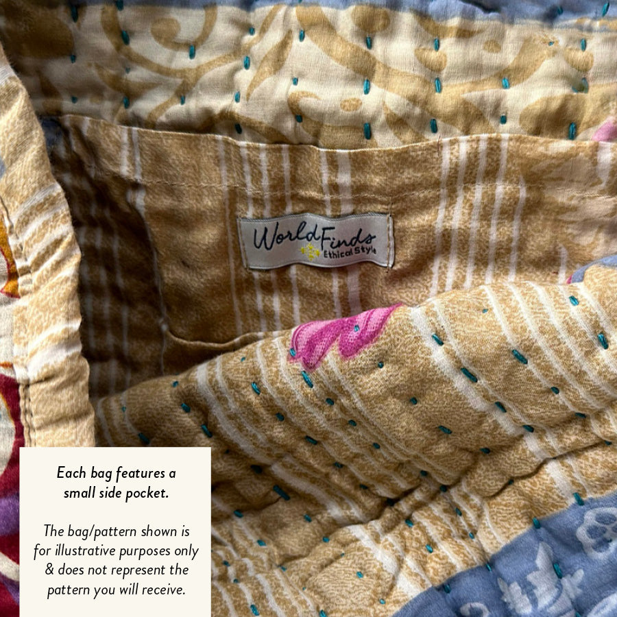 Thoughtfully crafted from repurposed Kantha textiles, each bag is one-of-a-kind with unique colors/patterns. Due to the upcycled nature, your item may have small patches in the fabric.