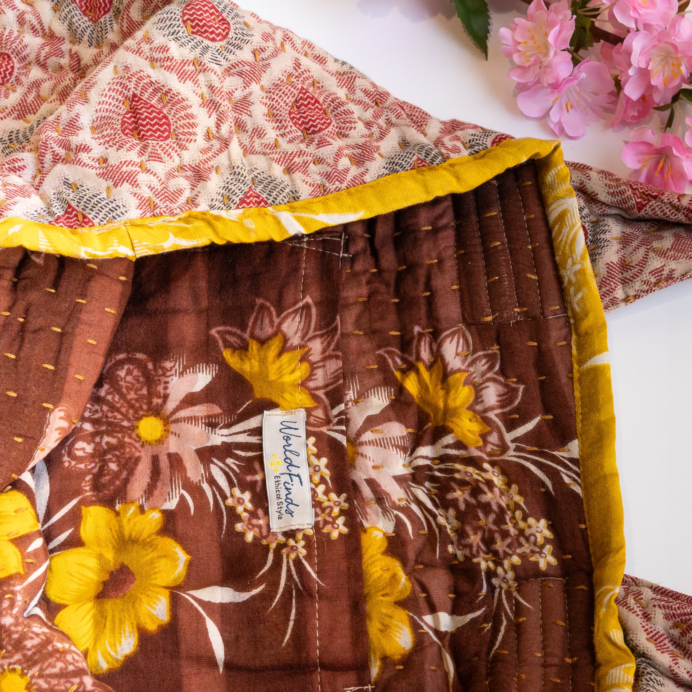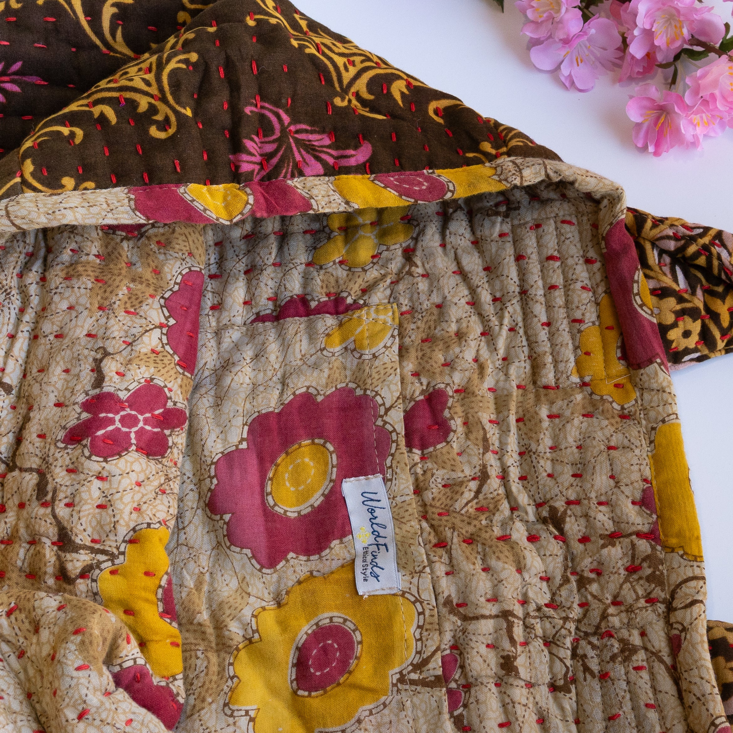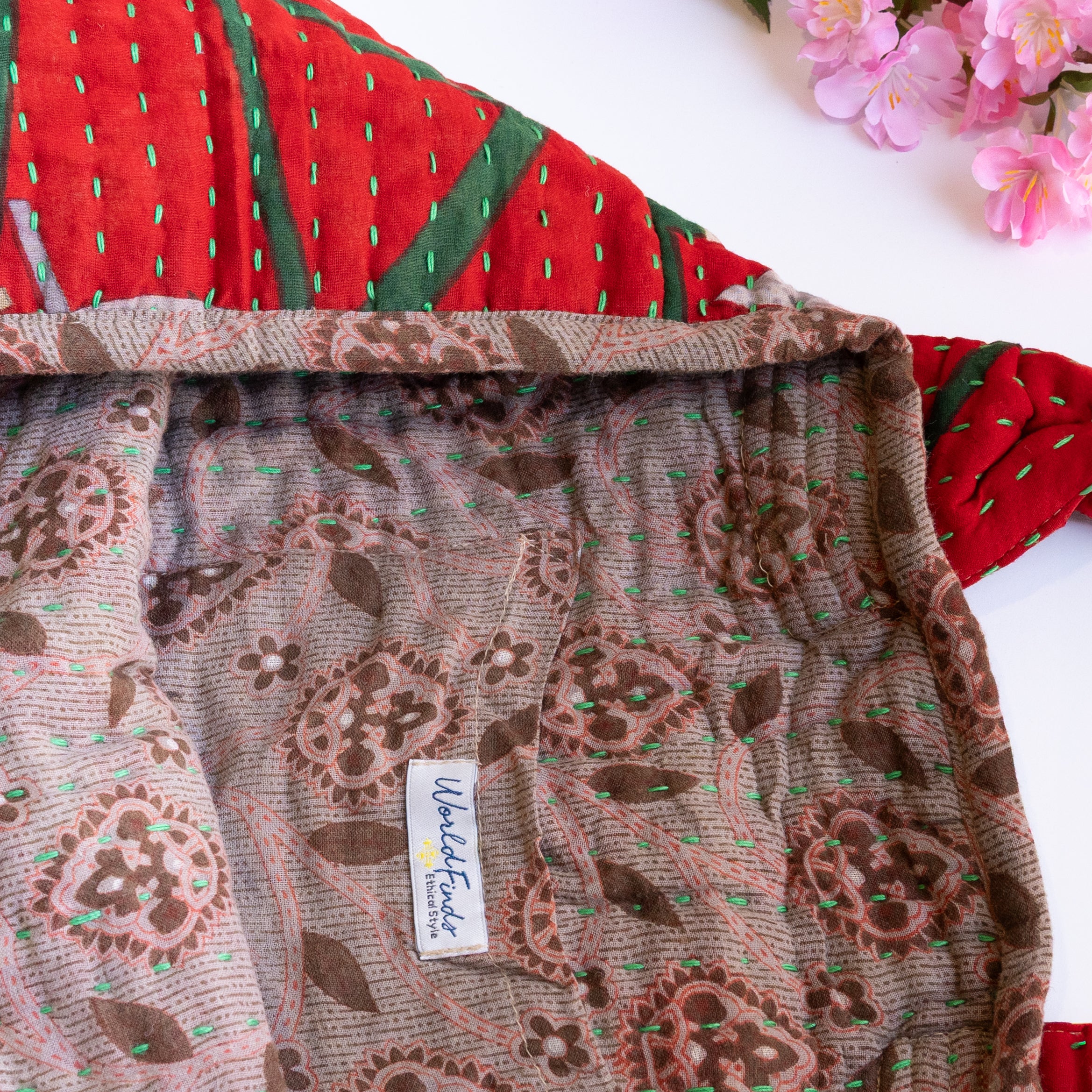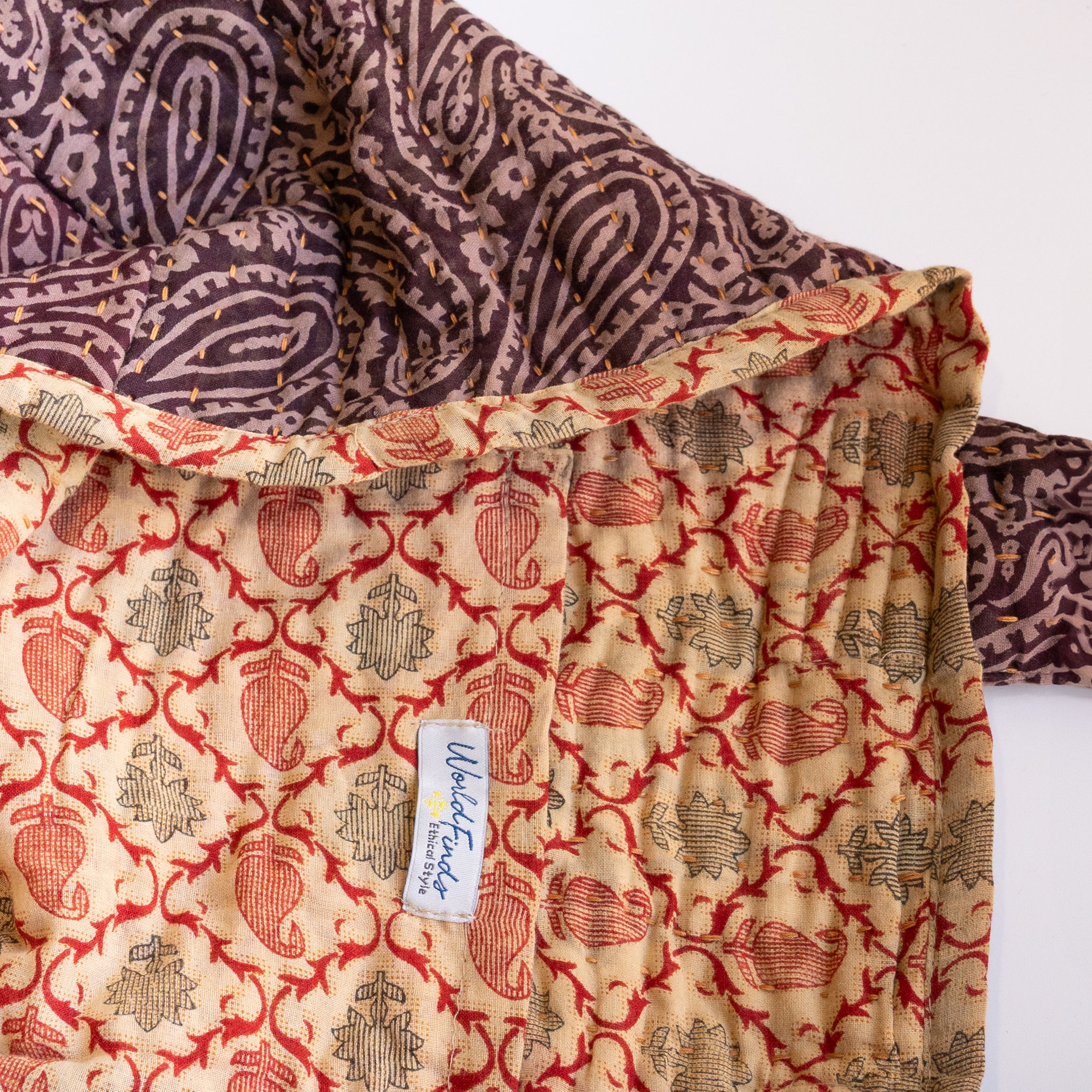 Thoughtfully crafted from repurposed Kantha textiles, each bag is one-of-a-kind with unique colors/patterns. Due to the upcycled nature, your item may have small patches in the fabric.