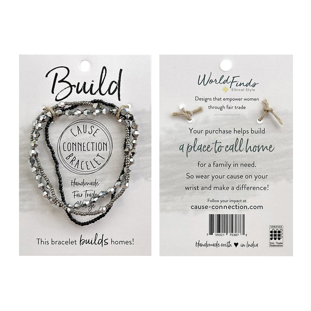 The Build bracelet creates goodness on so many levels! Each three-stranded bracelet is not only handmade by women artisans in India, but it also provides funds to help build a place to call home for a family in need. See below for more information on this donation! Beads are made of glass and a brass/metal mix.