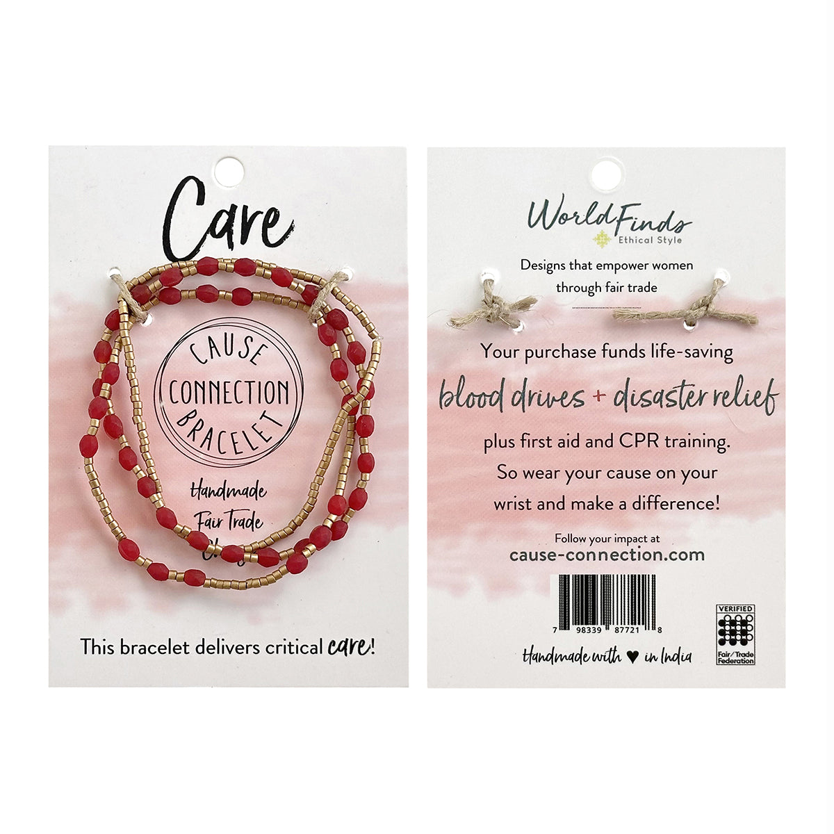 The Care bracelet creates goodness on so many levels! Each three-stranded bracelet is handmade by women artisans in India, and also helps fund blood drives, disaster relief, and first aid/CPR training. See below for more information about this donation! Beads are made of glass and a brass/metal mix.