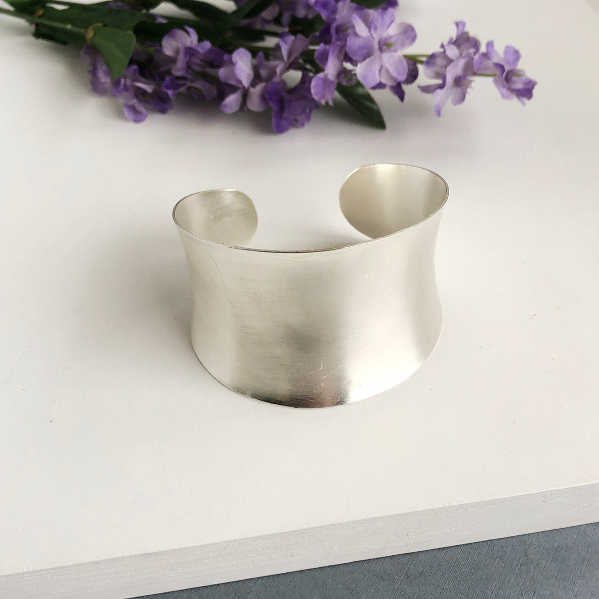 This trendy cuff features a slight inward curve at the center, giving it a subtly concave silhouette.